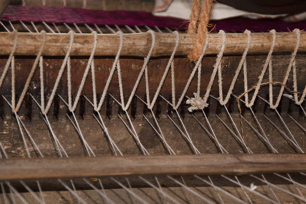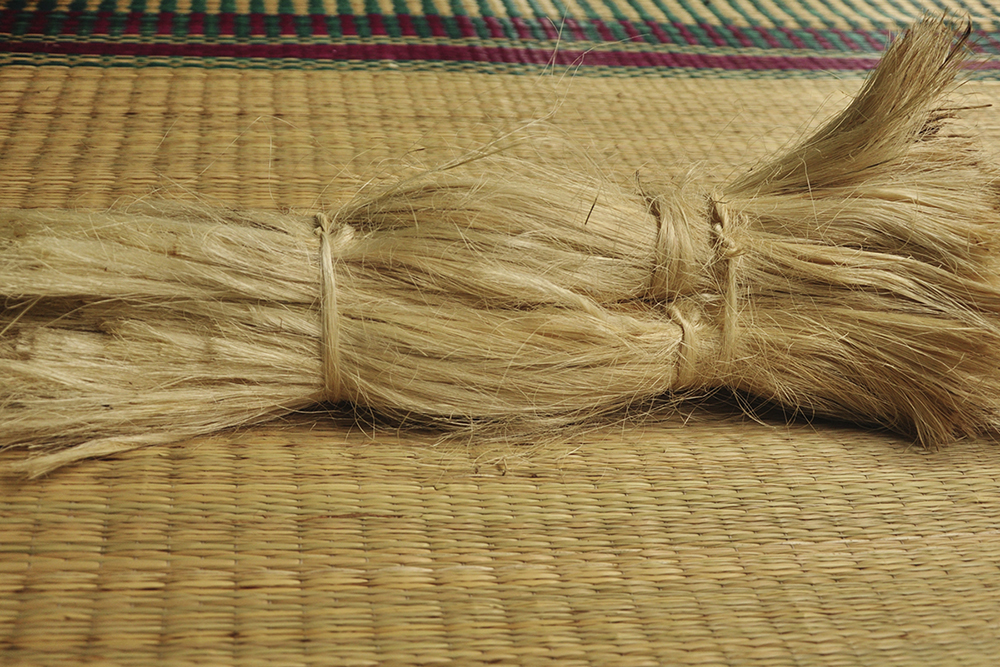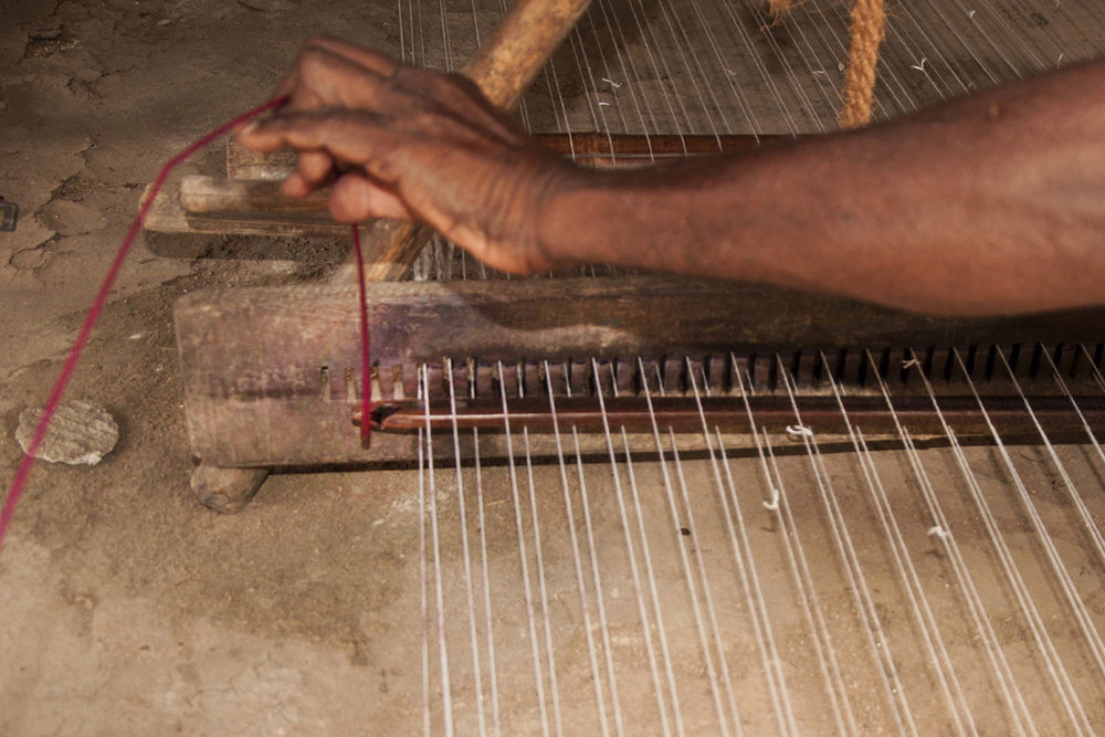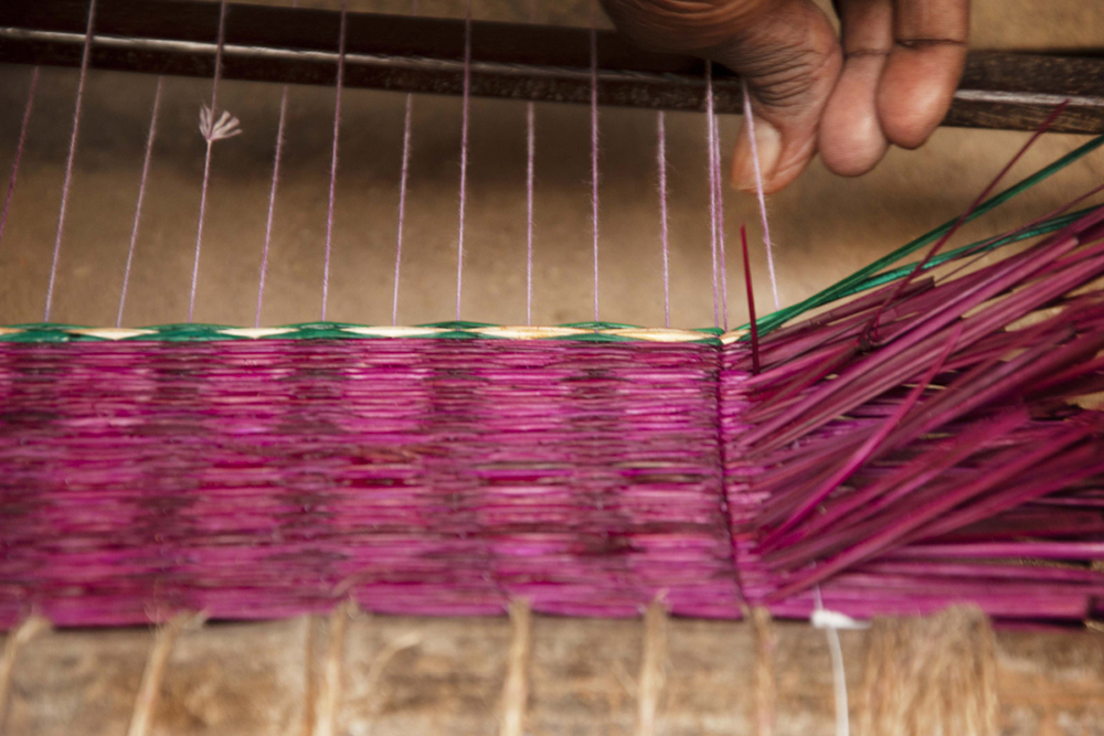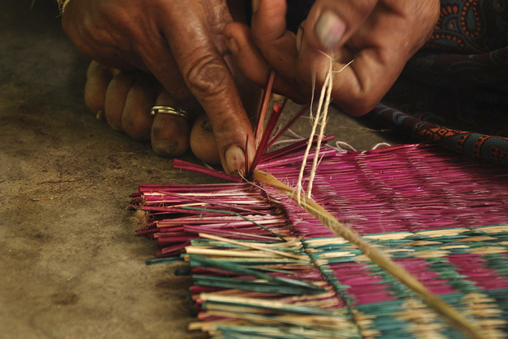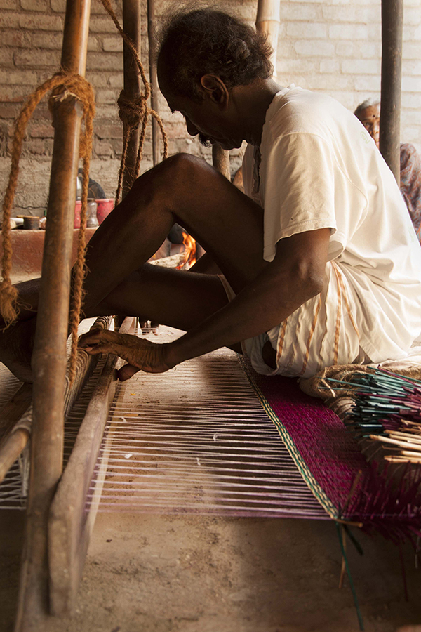 Kora grass are generally split very fine and woven with cotton warp on a ground loom. It is generally soaked in water before weaving, as it may break on rigid uses. The Kora grass mat weaving is done on the traditional ground loom at Vaniyambadi of Tamil Nadu. The craftsmen mentions he learnt it from his father who had taught him and his brothers when they were residing at Pattamadai (Pattapathei told by the craftsmen) that is few kilometers away from Vaniyambadi.
