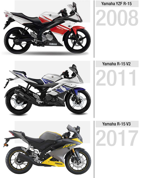 Launched in 2008 Yamaha R15 was a full faired sport in India. The bike has a design language from the iconic Yamaha R1 which was a pure liter class bike In foreign countries. There are multiple factors that make the R15 a successful bike are the full fairing, twin pods lights, clip on handlebar and rear mono shock suspensions increase the overall handling of the bike at higher speeds in India. The stance was also more aggressive as compared to other bikes and it was also quite expensive but it doesn't stop people from buying it. Right now in India Yamaha is selling its third generation of R15.