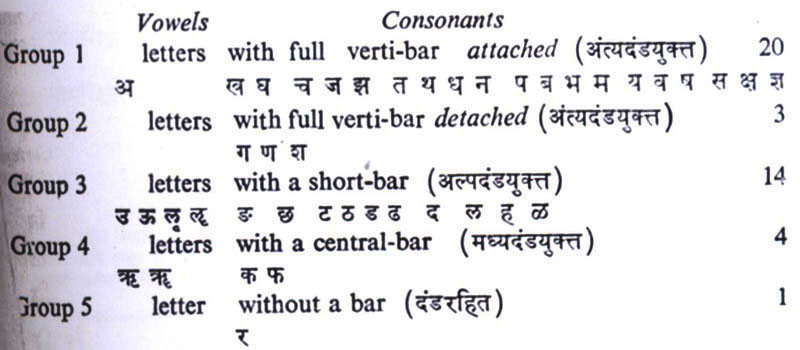 Bapurao Naik also attempted a graphical grouping titled Graphical classification of Devanagari Varnas of letters. Naik graphically organizes Devanagari letters into five groups based on the position of the Kana or Verti-bar.