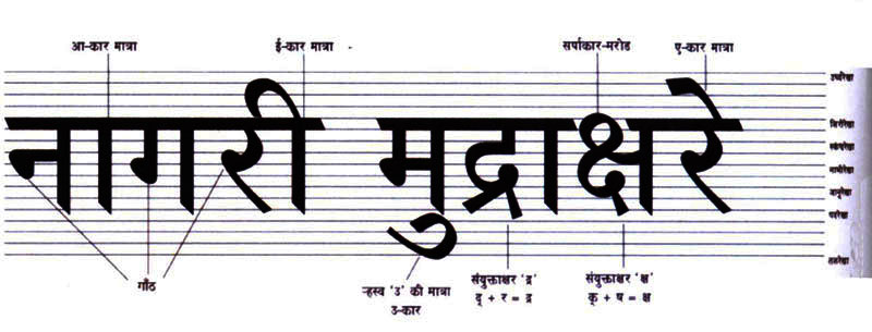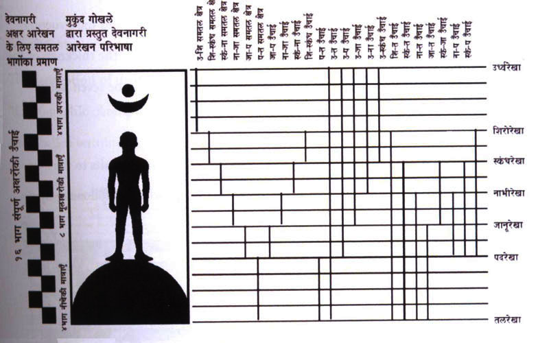 Creating a vocabulary for Devanagari was done by Mukund Gokhale, it was first published in 1975-76. Gokhale uses the body paradigm to describe the various portions of the letters. The lines defined by him are: Urdhavarekha, Shirorekha, Skandhrekha, Nabhirekha, Janurekha, Padrekha, and Talrekha. Regarding the proportion of the letters, Gokhale uses the stroke thickness (thickness of pen stroke) as a base unit. Four strokes for upper Matras, eight strokes for main character and four strokes for bottom Matras are necessary. A total of sixteen units of strokes can be considered as primary height of the letter. Bapurao Naik also specifies this unit of heights, six strokes for upper Matra, twelfth strokes for main character and again six-unit for bottom Matras in a total of twenty-four units.