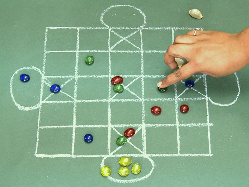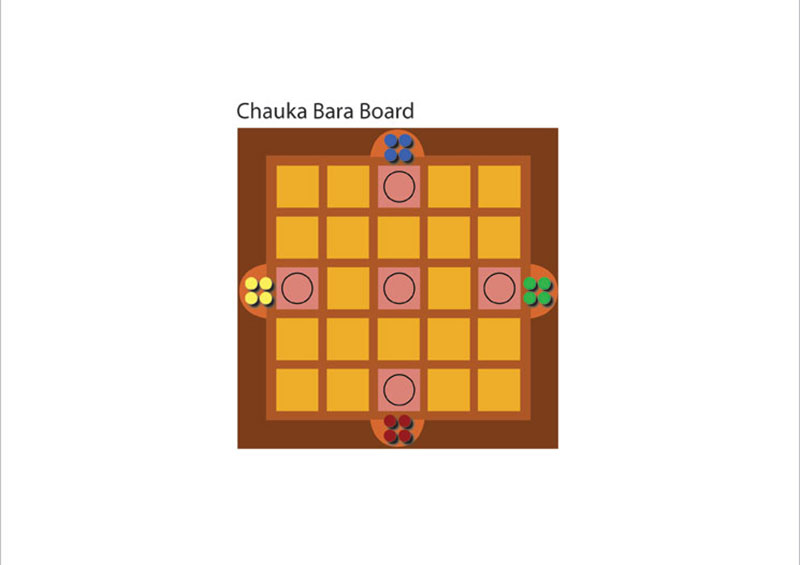 Chauka Bara is a traditional board game played during the era of the kings. The game is 2 to 4 player game, played on a 5x5 square board of cells. It is known by various other names like Katte Mane in Kannada, Pakidakal or Kavidi Kali in Malayalam, Ashta Chamma in Telugu, Daayam or Thaayam in Tamil, and Kanna Duaa in Hindi. This game is mostly popular in South India. It belongs to the Parcheesi family and is said to be a precursor to the modern day Ludo. Nowadays, few people play this game but many organizations are working towards reviving this traditional game.