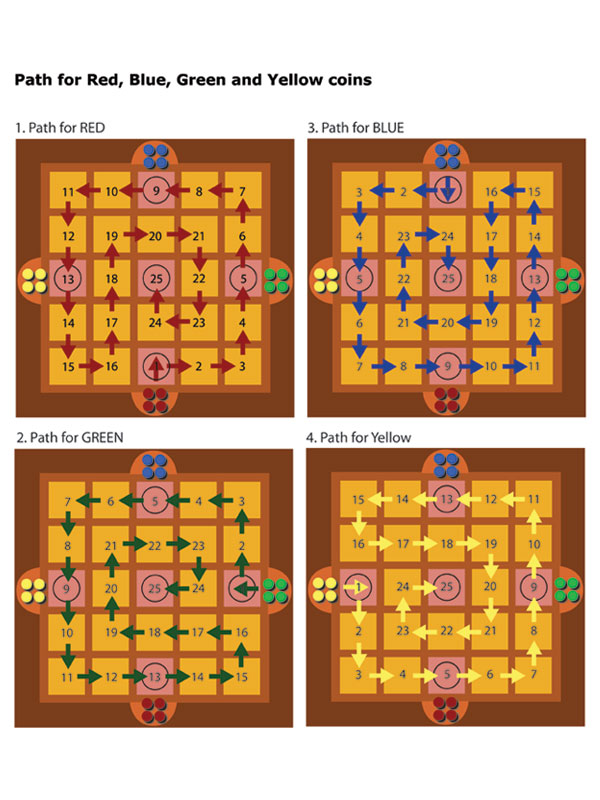 The game of Chauka Bara is played on a 5x5 square board of cells as in Fig. 1: Chauka Bara Board. The middle most square along each edge and the square in the center of the board are safe places where pawns cannot be attacked. Each player owns 4 pawns. The movement of the pawns is determined by the throw of 4 cowries. On a turn, the player throws four cowries and moves the pawns up the spiral path 1- 8 places according to the result of the throw. The path followed by red and blue pawns color is depicted in Fig. 2. Other colored pawns follow similar suit. The score on the throw of cowries is shown in Fig. 3. If the player’s pawn lands on a space occupied by the opponent, the opponent's pawn is 'attacked' and returned to the starting space. Once a player has been able to attack an opponent’s pawn, their pawns are permitted to move inside the inner ring. The first player to move all of their pawns to the innermost square wins.