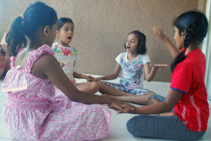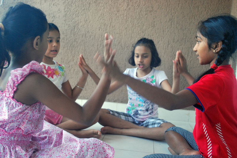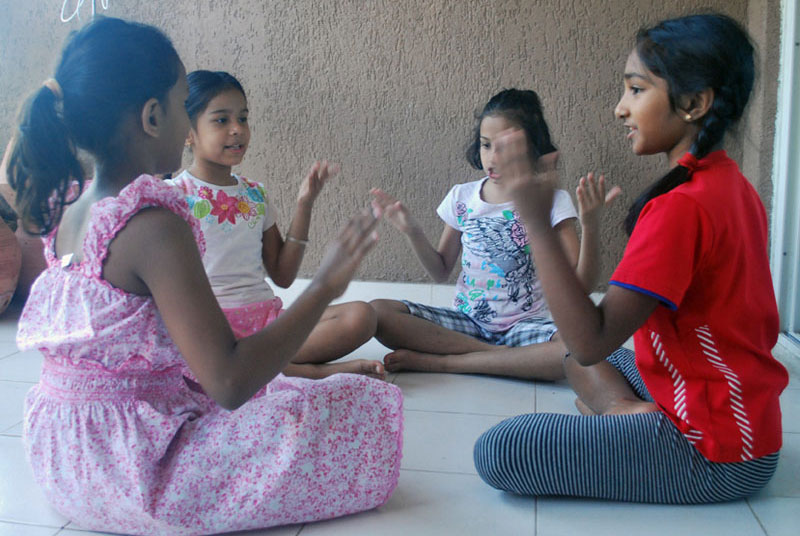 The players sit facing each other while reciting the song. They clap their hands in a particular fashion to match the rhythm of the song.