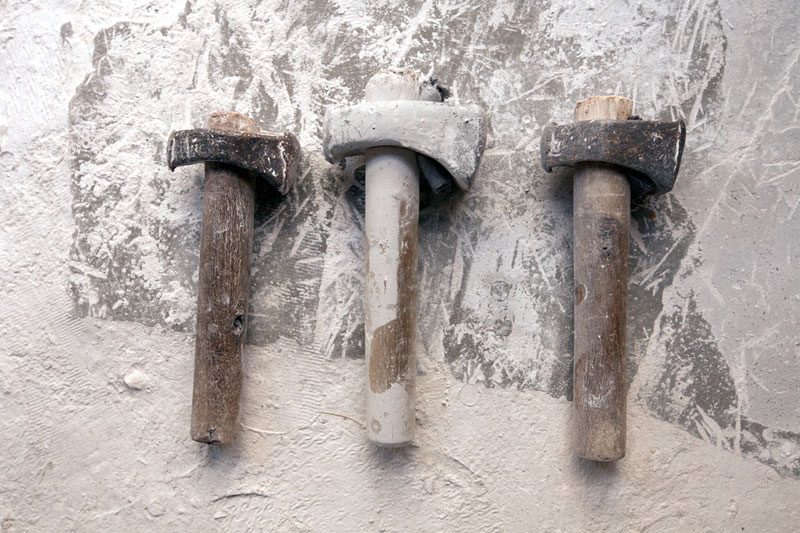 The hammers of different sizes are used for different purposes. They are used to hit the chisel for carving. The wooden head hammer is used for soft strokes to get fine details. The ones with big metal heads are used for initial removing of the stone. Later small head hammers are used for detailed and intricate works/ motifs.