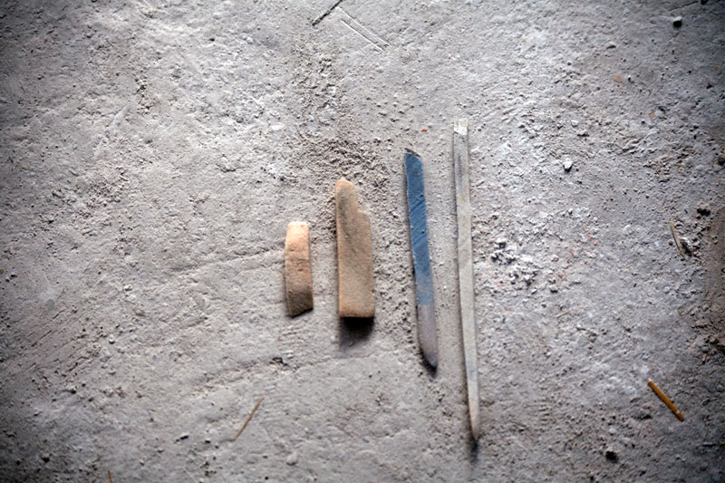An iron tool with sharp and flat-edge is used initially for removing unwanted material to get a rough outline on the stone. Two types of chisel; flat and round headed are used for specific purposes. Round chisel is used for minute or detailed work- usually for carving ornaments, face, eyes etc.
