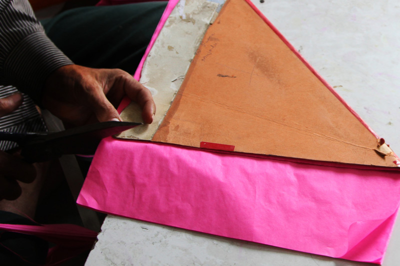 After the kite paper is cut into required shape and size, thin cotton thread is pasted on the sides to avoid the paper from tearing or to prevent it from getting torn while flying the kite. The craft paper is diagonally folded into two equal halves. The designs patterns are made using different colorful papers separately and pasted on these craft papers.