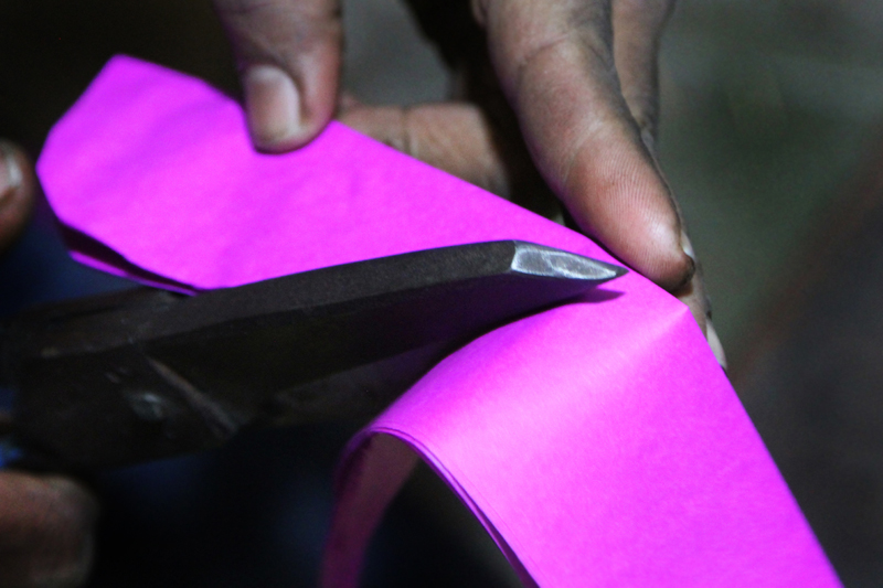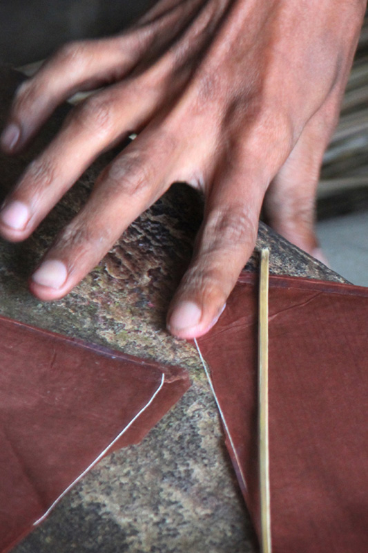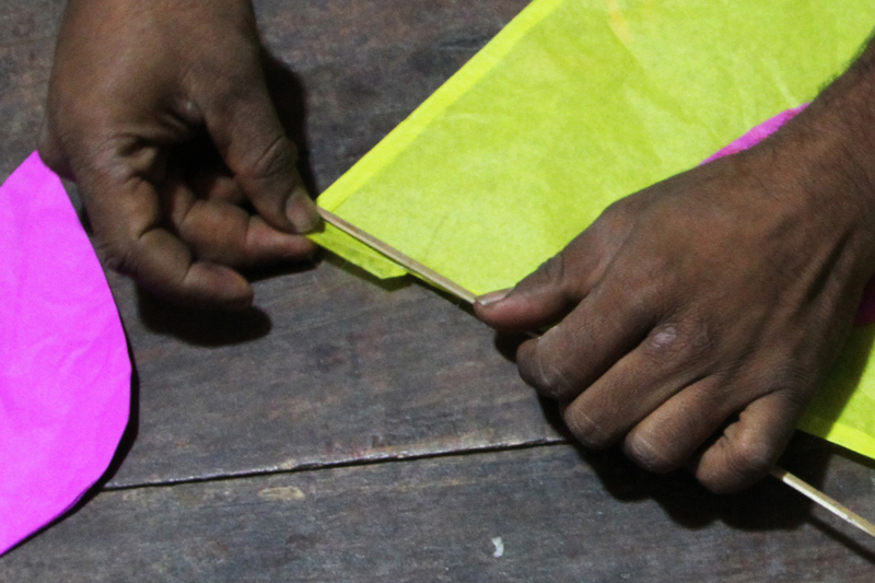 Bamboo stick is then pasted diagonally which supports and strengthen at end of the corners. Bamboo sticks are bought from Calcutta and Assam and sold in the local market. These bamboo sticks are heated on to create design pattern on them. Gum made of Maida flour is used to paste bamboo sticks on the kite.