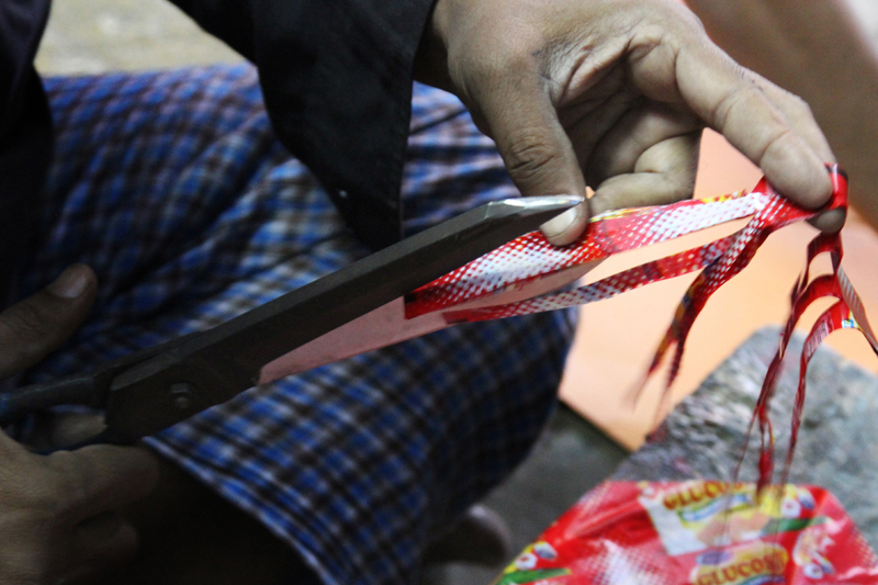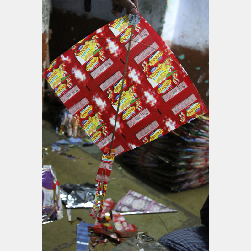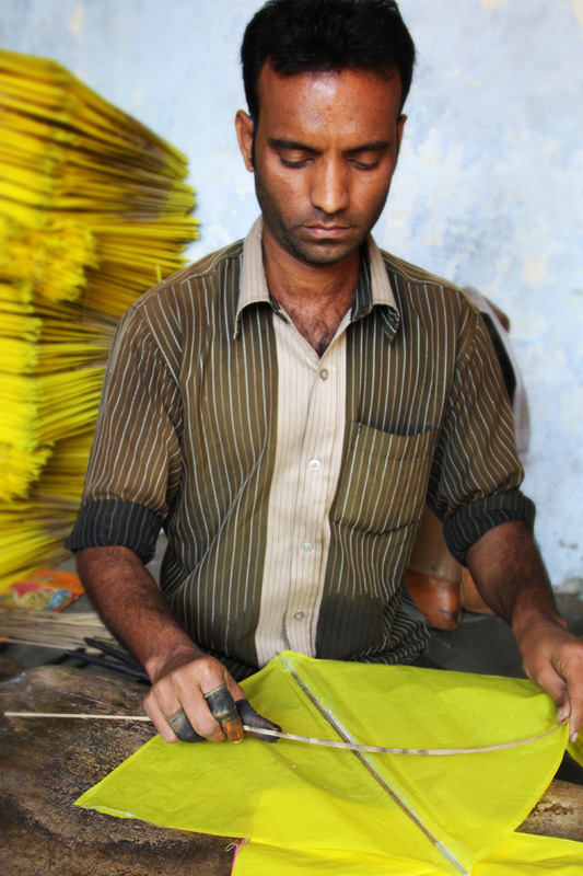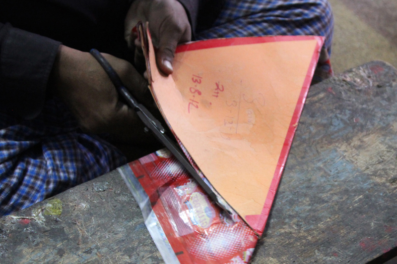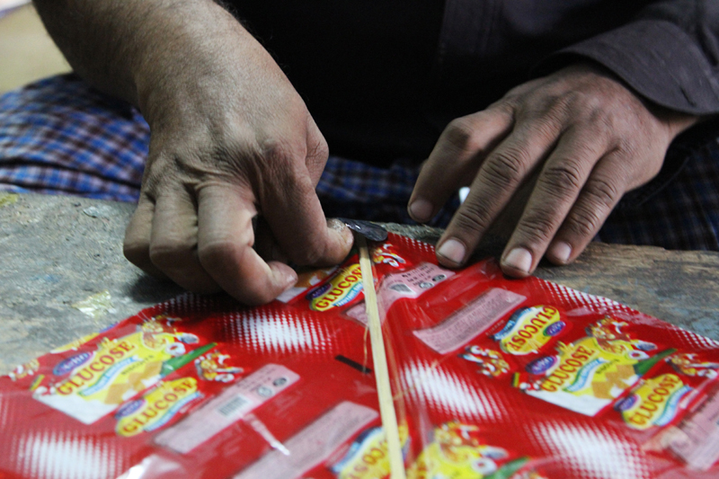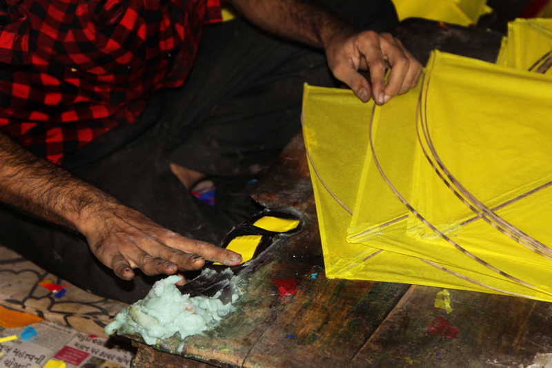 Three people are involved to make one kite. One artisan cuts the required shape of the kite and the other pastes bamboo sticks on the kite. And the third artisan pastes patti and adds tail to the kite. More than two thousand kites are made in a day.