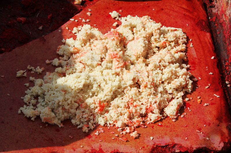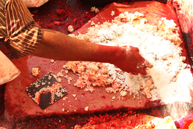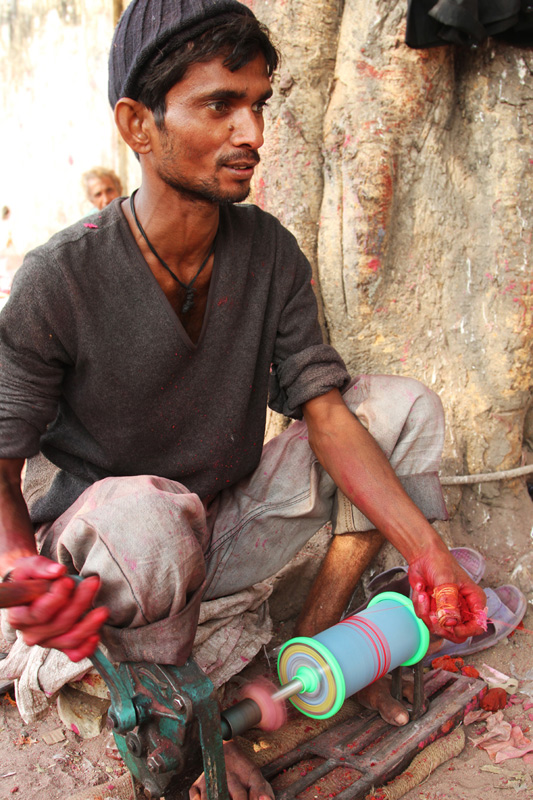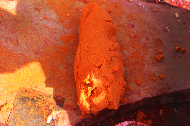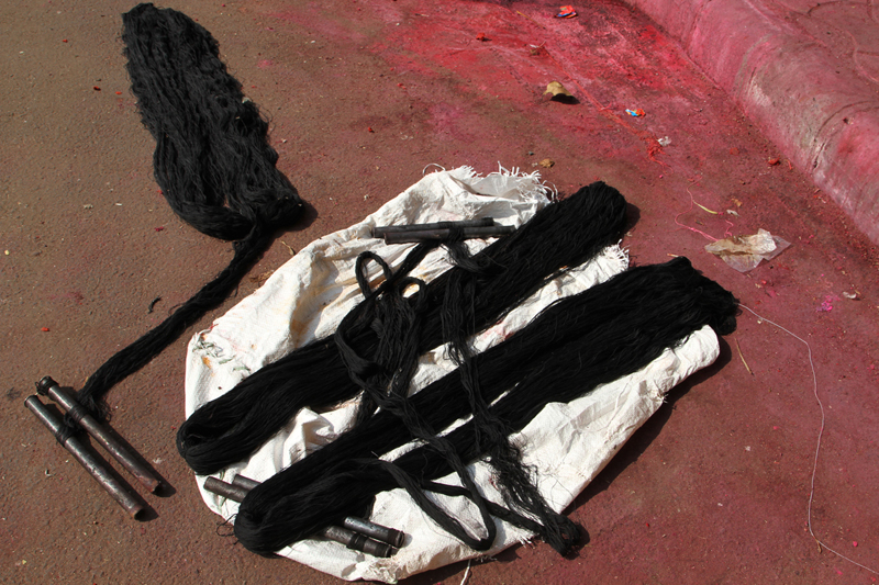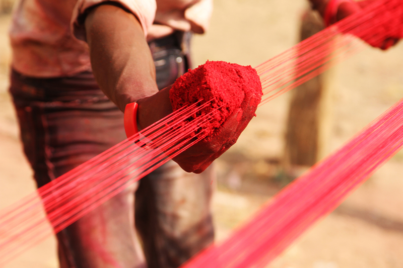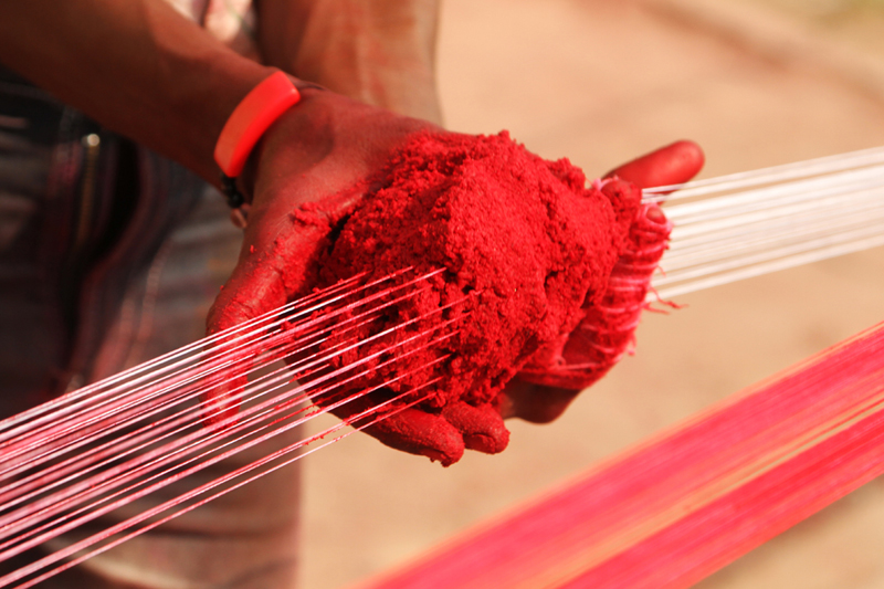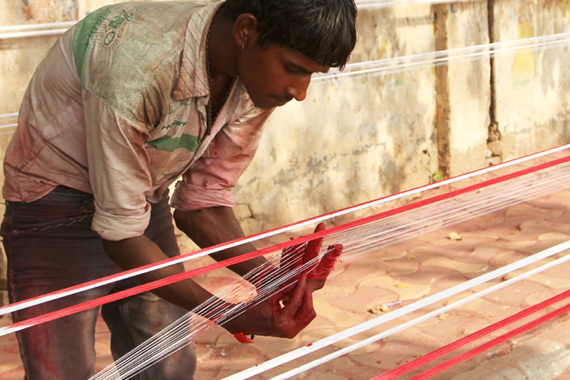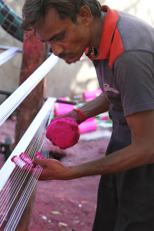 Two poles are fixed from one end to the other. The uncolored thread is looped between the two poles as several layers. The combination of Kanji (cooked rice), glue, colors, and glass powder is mixed with water to get like semi solid dough. Lime stone (Mukhar ghaj) and few local ingredients called Isbole ki bhusi and soap is added to the dough to sustain the richness of the color. Then the semi-solid color dough is applied to the entire length of the threads. The process is done for three to four times to enhance the color and to give even shade.