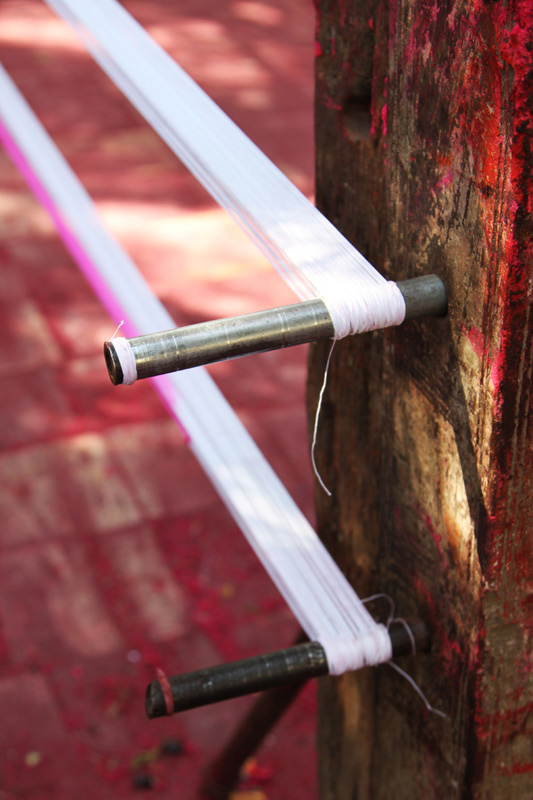 Cotton thread available in local market is used to make the Manjaa. The threads are available from three cords to twelve cords. For Manjaa, artisans use four to six cords thread.