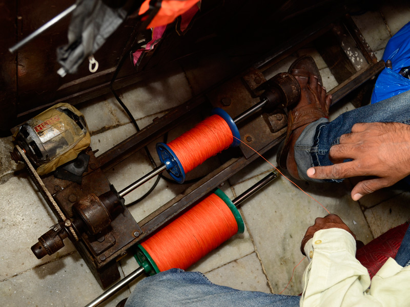 The manjha is wound on fikri from a large spool fixed to an electric motor. Large quantities of thread – around 900metres is available in reels, this is wound on the firki.