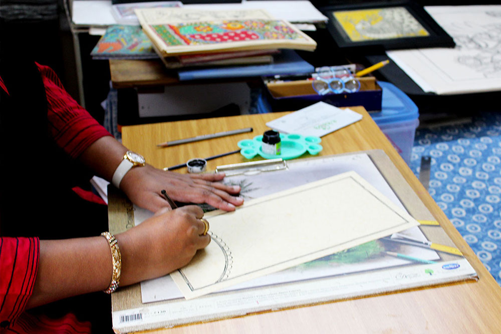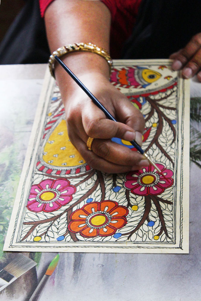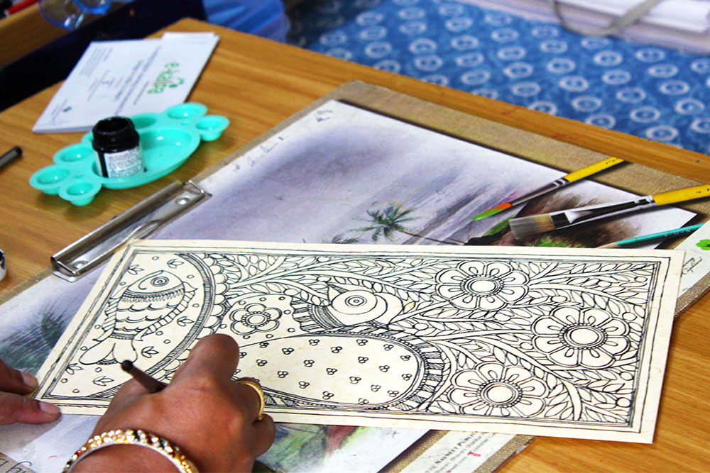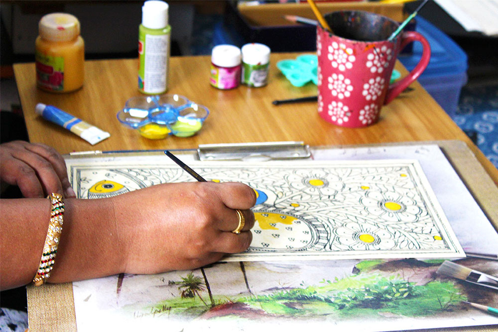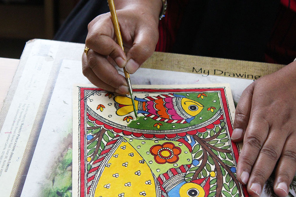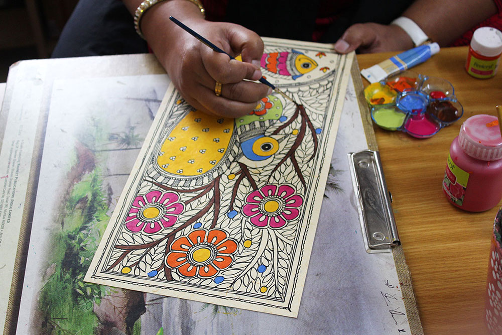 Artisan picks a handmade paper and draws the border for an intended design with a pencil. Once a rough sketch is made, a nib pen dipped in black acrylic paint is used to give border again over the pencil work, as highlighting borders is one of the important stages in Madhubani paintings. Then using vibrant colours, illustrations of natural elements bonded to human lives are drawn. These elements include trees, fruits, flowers, peacocks, rivers, fishes, etc. According to the scriptures, these elements hold symbolical meaning. Like for example, fish stands for fertility and good luck while peacock for love and affection. Branches, stems, and waves are being sketched later to fill the gaps that will give an extra charm to the work undertaken. The standard colours used here are yellow, red, orange, blue, green, black, pink, and brown. A Madhubani painting is always painted as per an artist’s creativity; hence it may differ from one another but allows the flow of each person’s unique zeal into the art. Paintings with these features framed at houses are believed to elevate the decor’s folk appeal.