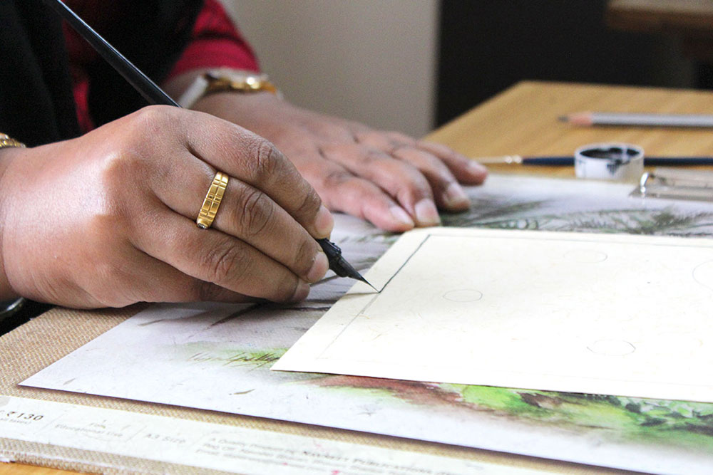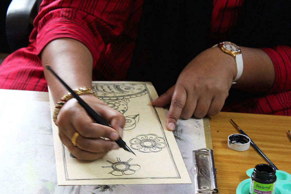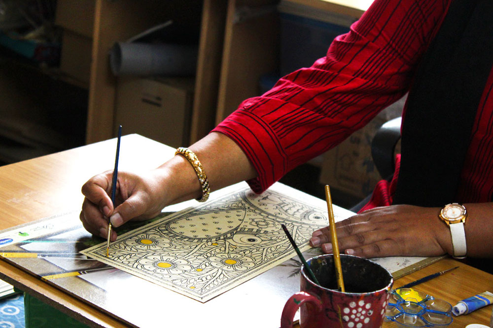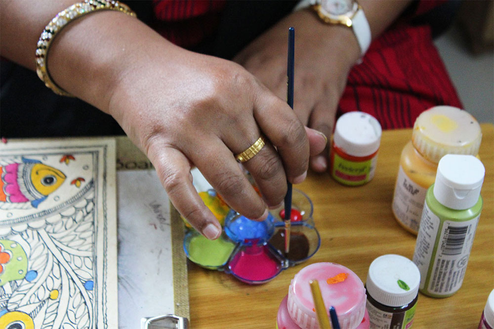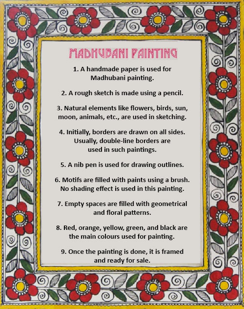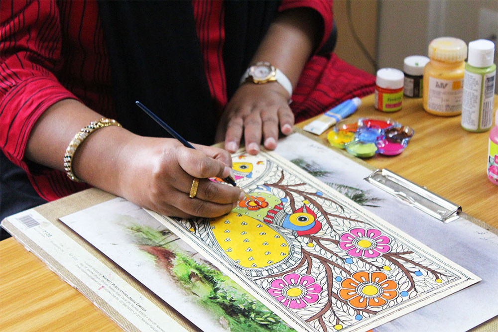Artisan picks a handmade paper and draws the border for an intended design with a pencil. Once a rough sketch is made, a nib pen dipped in black acrylic paint is used to give border again over the pencil work, as highlighting borders is one of the important stages in Madhubani paintings. Then using vibrant colours, illustrations of natural elements bonded to human lives are drawn. These elements include trees, fruits, flowers, peacocks, rivers, fishes, etc. According to the scriptures, these elements hold symbolical meaning. Like for example, fish stands for fertility and good luck while peacock for love and affection. Branches, stems, and waves are being sketched later to fill the gaps that will give an extra charm to the work undertaken. The standard colours used here are yellow, red, orange, blue, green, black, pink, and brown. A Madhubani painting is always painted as per an artist’s creativity; hence it may differ from one another but allows the flow of each person’s unique zeal into the art. Paintings with these features framed at houses are believed to elevate the decor’s folk appeal.