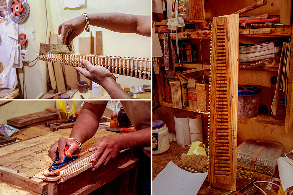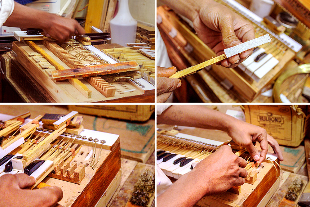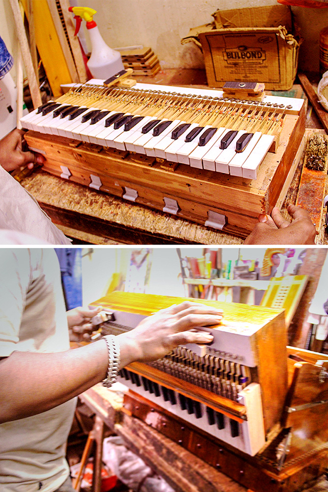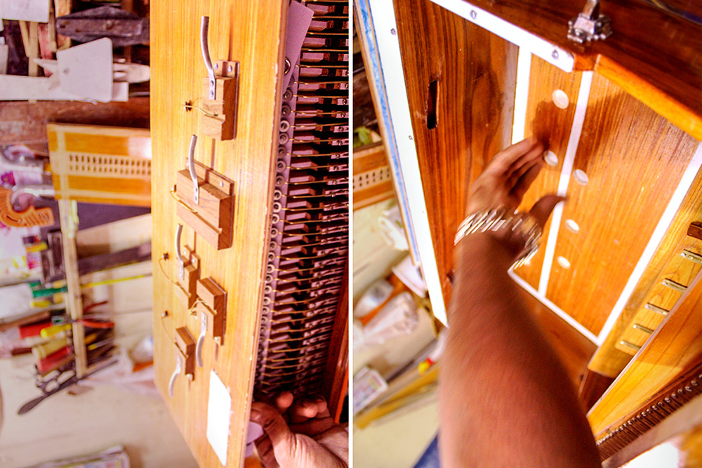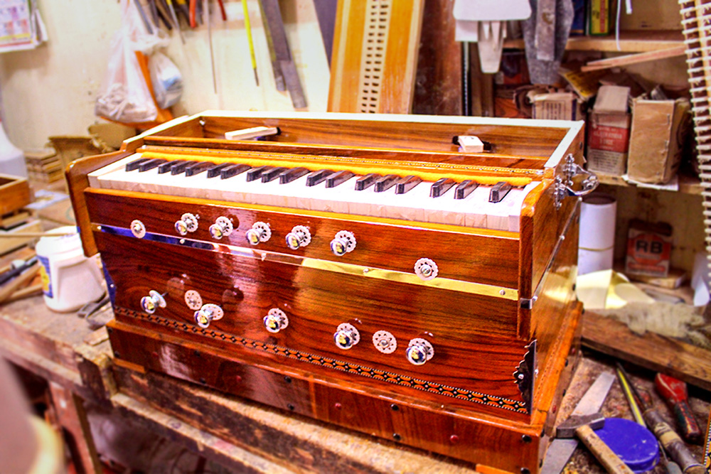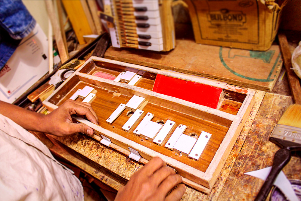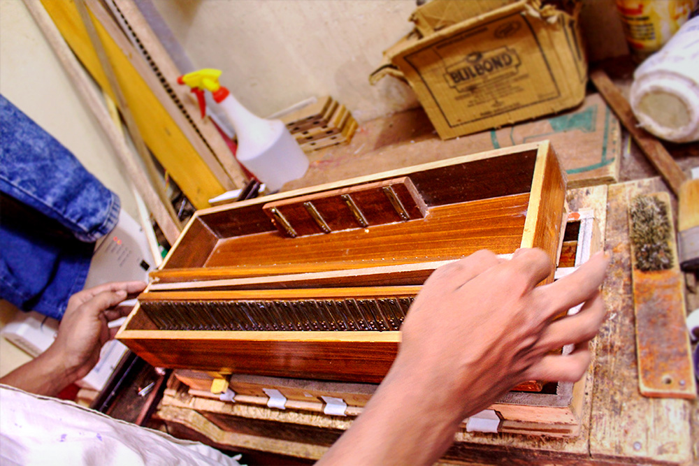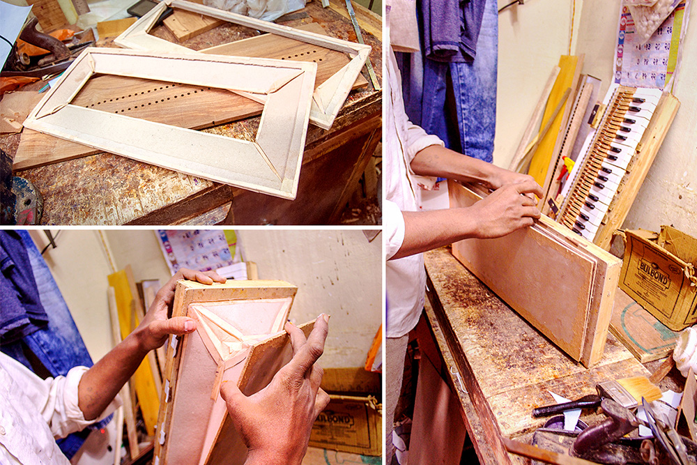 A standard harmonium’s body is generally finished in Savana wood, while teak wood is preferred for high-end quality. Savana wood makes the products lightweight and assures long-lasting stability and durability. The harmonium model can be divided into eight major parts; box, bellows, keyboard, cover, stops, handles, reeds, and coupler. Here the outer wooden box of 60x30x40 cms dimensions acts as a casing for the harmonium, and it is entitled to perfectly house the innerspring responsible for pushing the inner bellows upward to pump enough air to move into the reeds chamber. This arrangement leaves the front half and the top of the box open. Above the springs, the inner bellow assembly and the keyboard assembly are placed one above the other. The inner bellow assembly consists of many holes at the top as well as the bottom part of it to control the flow of air. These holes are controlled by individual knobs, which can be seen evidently in the front area of the harmonium. On top of this assembly sits the reed board, i.e., keyboard. This reed board houses a pivot board, keys, and the reeds. Here the pivot board is a flat wooden piece that accommodates slots for each key, and reeds are small metal controls beneath that vibrate to produce sound when air rushes in. This reed’s size decides the pitch of the instrument. A collection of reeds is called reed banks. Standard harmonium consists of two reed banks that can be arranged in two ways, vertical and horizontal type. The dimensions of the board differ slightly as per the directional type of reeds. Adjacent to the key slots, small triangular wooden strips are pasted to form a board with enough reeds and slots. Once this board is ready, it is inserted into the keyboard frame.