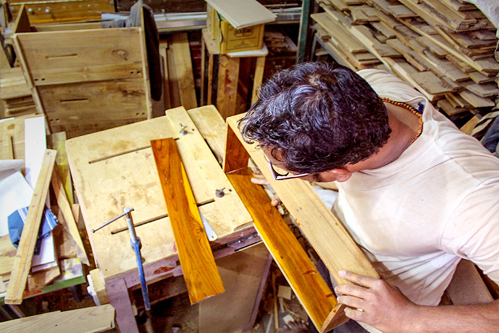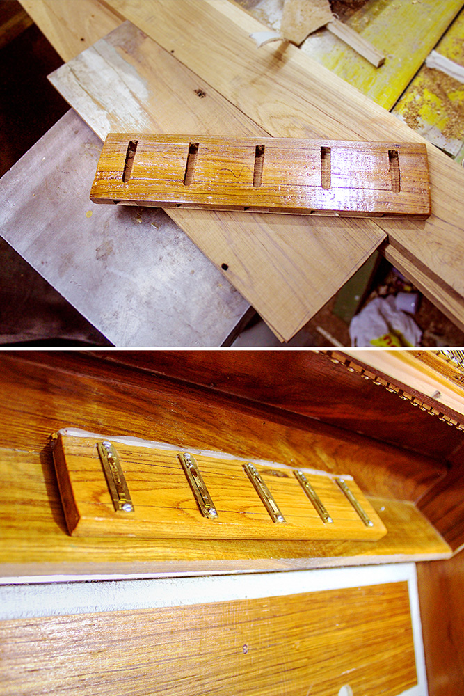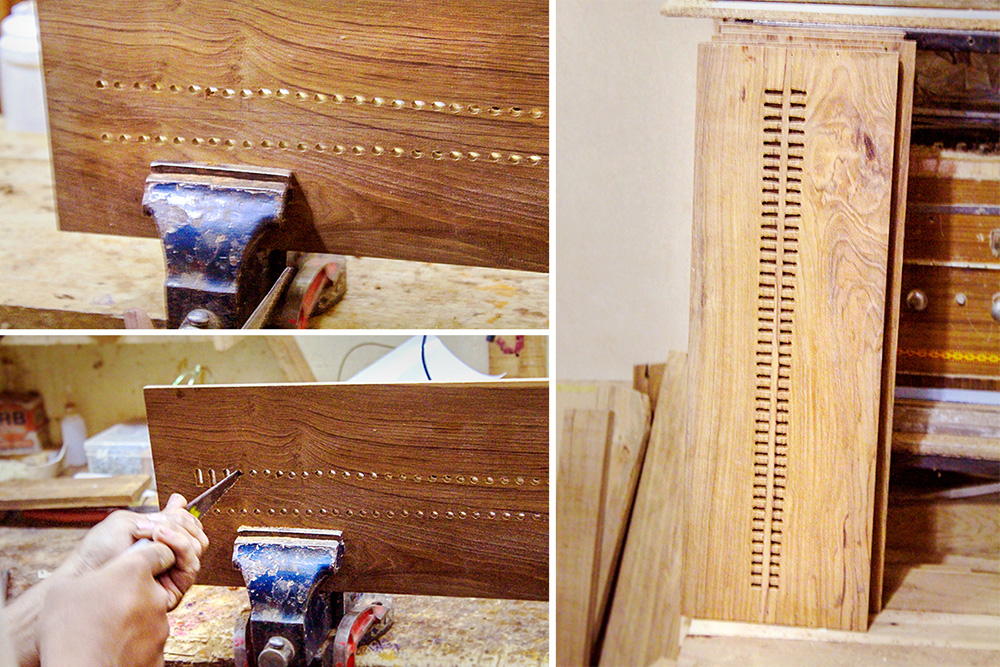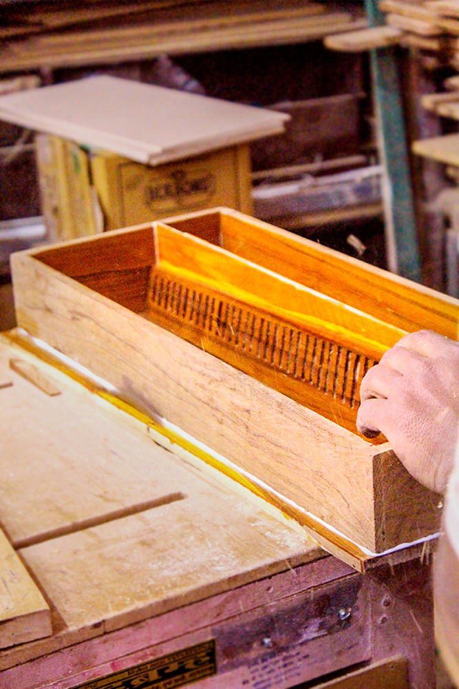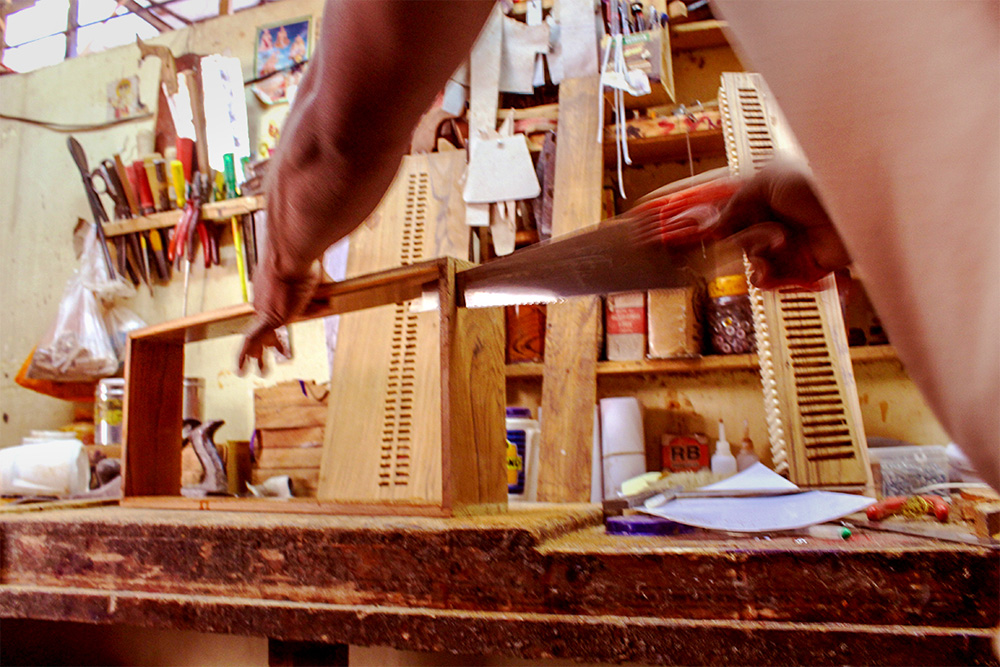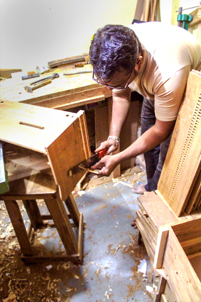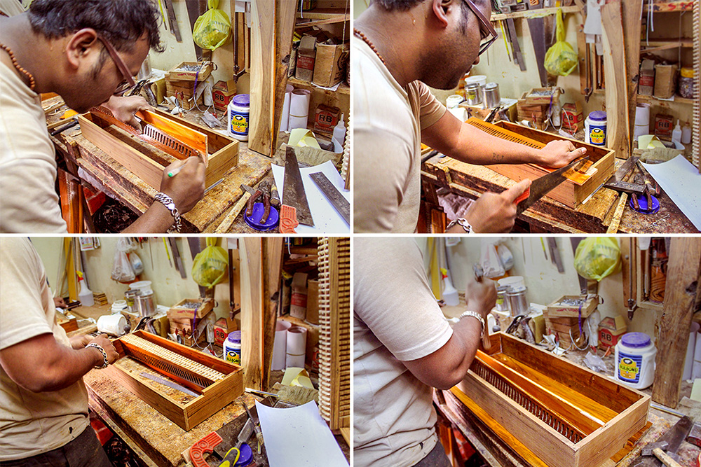 A standard harmonium’s body is generally finished in Savana wood, while teak wood is preferred for high-end quality. Savana wood makes the products lightweight and assures long-lasting stability and durability. The harmonium model can be divided into eight major parts; box, bellows, keyboard, cover, stops, handles, reeds, and coupler. Here the outer wooden box of 60x30x40 cms dimensions acts as a casing for the harmonium, and it is entitled to perfectly house the innerspring responsible for pushing the inner bellows upward to pump enough air to move into the reeds chamber. This arrangement leaves the front half and the top of the box open. Above the springs, the inner bellow assembly and the keyboard assembly are placed one above the other. The inner bellow assembly consists of many holes at the top as well as the bottom part of it to control the flow of air. These holes are controlled by individual knobs, which can be seen evidently in the front area of the harmonium. On top of this assembly sits the reed board, i.e., keyboard. This reed board houses a pivot board, keys, and the reeds. Here the pivot board is a flat wooden piece that accommodates slots for each key, and reeds are small metal controls beneath that vibrate to produce sound when air rushes in. This reed’s size decides the pitch of the instrument. A collection of reeds is called reed banks. Standard harmonium consists of two reed banks that can be arranged in two ways, vertical and horizontal type. The dimensions of the board differ slightly as per the directional type of reeds. Adjacent to the key slots, small triangular wooden strips are pasted to form a board with enough reeds and slots. Once this board is ready, it is inserted into the keyboard frame.