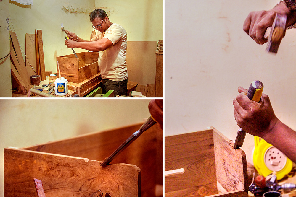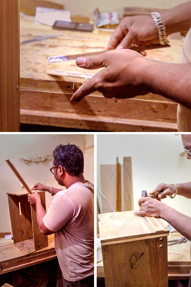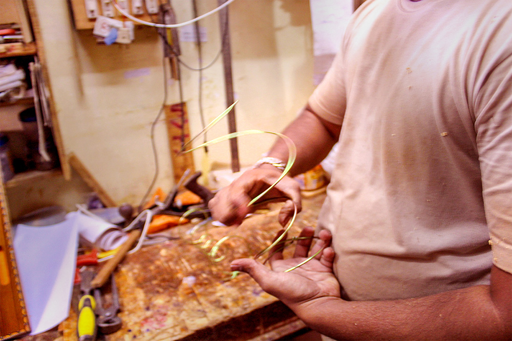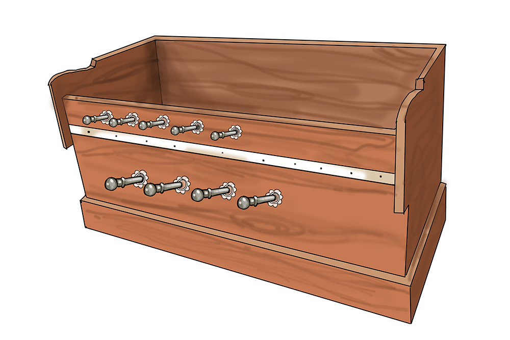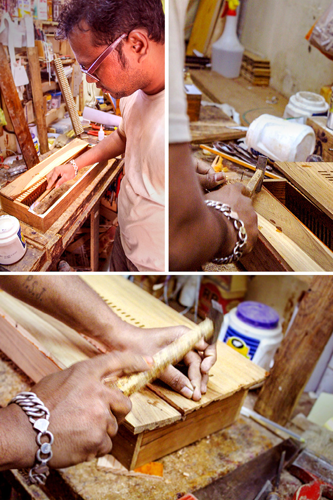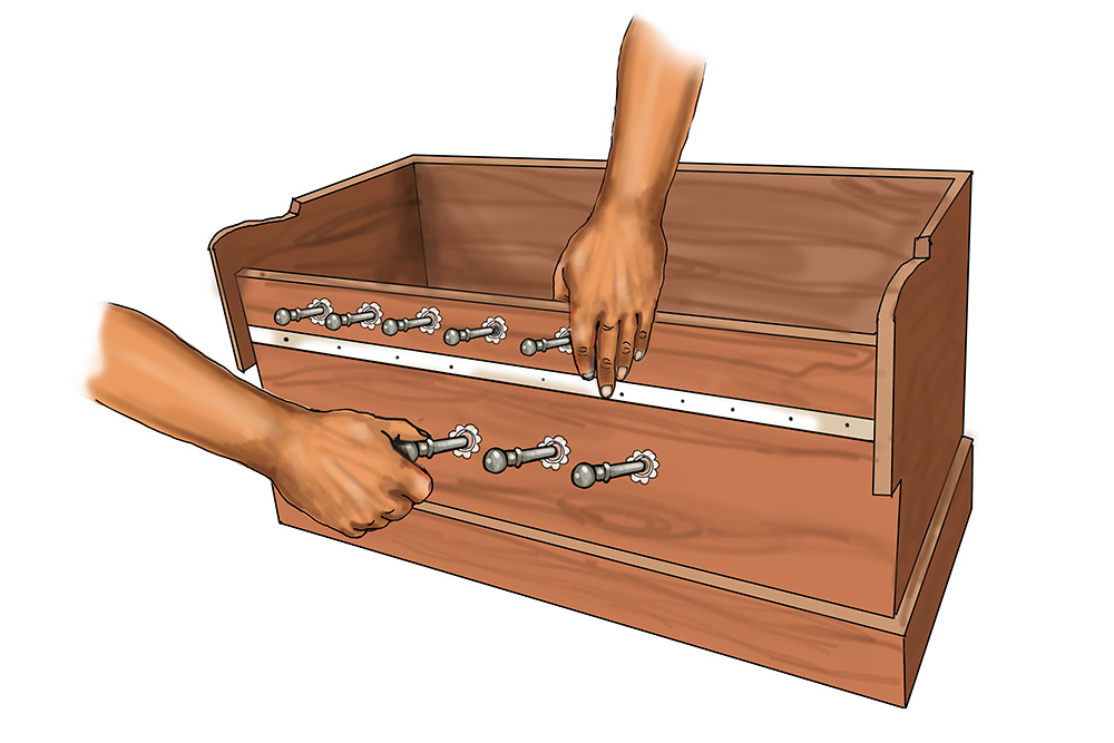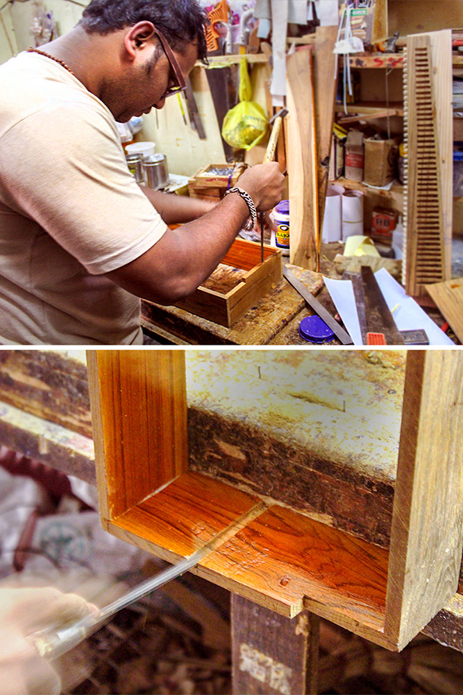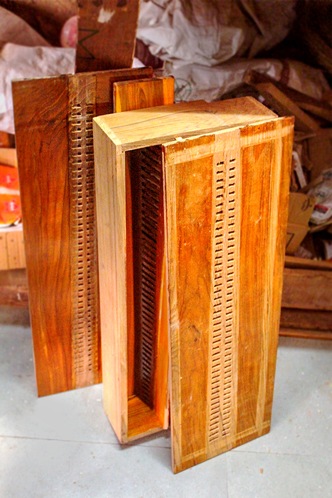 A standard harmonium’s body is generally finished in Savana wood, while teak wood is preferred for high-end quality. Savana wood makes the products lightweight and assures long-lasting stability and durability. The harmonium model can be divided into eight major parts; box, bellows, keyboard, cover, stops, handles, reeds, and coupler. Here the outer wooden box of 60x30x40 cms dimensions acts as a casing for the harmonium, and it is entitled to perfectly house the innerspring responsible for pushing the inner bellows upward to pump enough air to move into the reeds chamber. This arrangement leaves the front half and the top of the box open. Above the springs, the inner bellow assembly and the keyboard assembly are placed one above the other. The inner bellow assembly consists of many holes at the top as well as the bottom part of it to control the flow of air. These holes are controlled by individual knobs, which can be seen evidently in the front area of the harmonium. On top of this assembly sits the reed board, i.e., keyboard. This reed board houses a pivot board, keys, and the reeds. Here the pivot board is a flat wooden piece that accommodates slots for each key, and reeds are small metal controls beneath that vibrate to produce sound when air rushes in. This reed’s size decides the pitch of the instrument. A collection of reeds is called reed banks. Standard harmonium consists of two reed banks that can be arranged in two ways, vertical and horizontal type. The dimensions of the board differ slightly as per the directional type of reeds. Adjacent to the key slots, small triangular wooden strips are pasted to form a board with enough reeds and slots. Once this board is ready, it is inserted into the keyboard frame.
