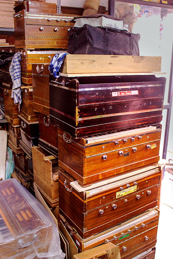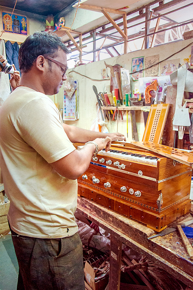 The sound produced by a harmonium is the result of freely vibrating metal reeds. One can find at least one reed for each note in the instrument. So the mechanism of the device is such that when a key on the keyboard is pressed, the leather valve above the respective reed opens, allowing the air trapped inside to escape and the outer air to enter. This blows the reed, and thus a sound is created. By releasing the key, the leather valve and reed come back to their original place with the help of a spring, ceasing the air exchange, and thus the sound stops.