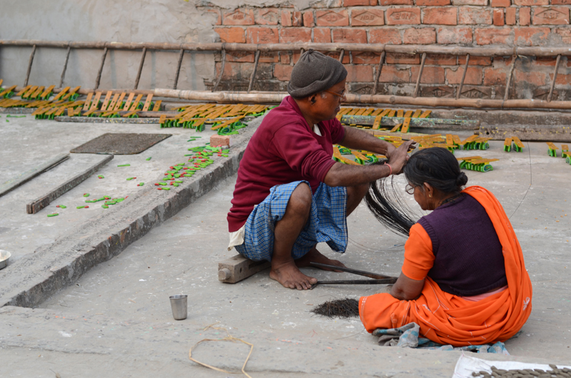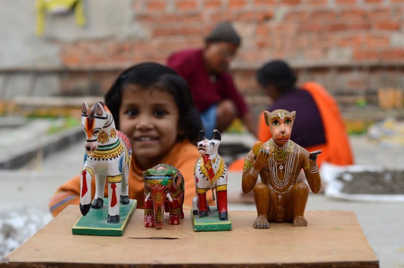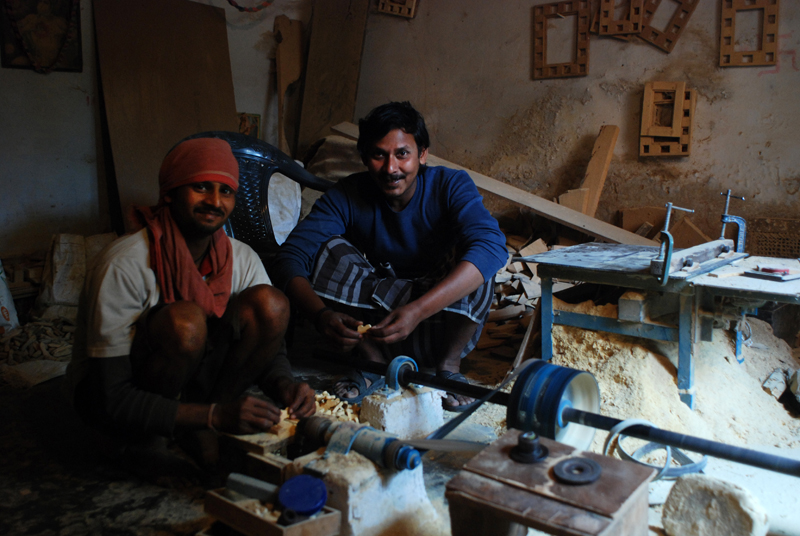 Raju, one of the craftsmen, lives in Khajua, Kashmiri Ganj, a semi urban area, with his wife and two children. He learnt the craft of making wooden toys from his father. He has a small workshop with a setup of cutting, drilling and filing machine connected with amotor. This is quite an interesting unit which runs through conveyor belts. He has a co-worker, who assists him in his work.