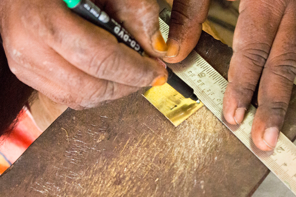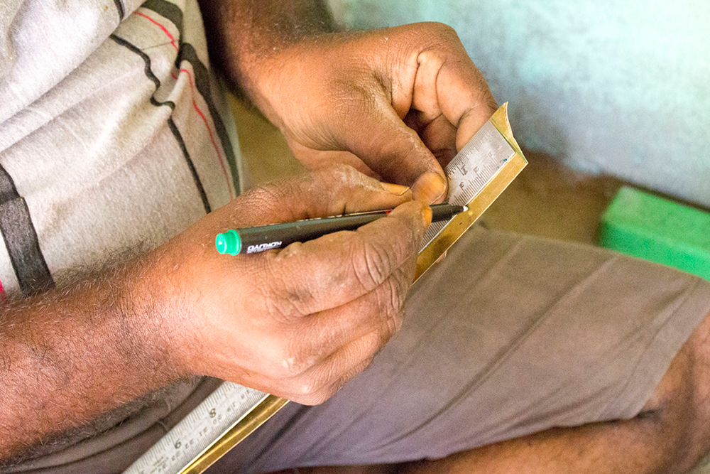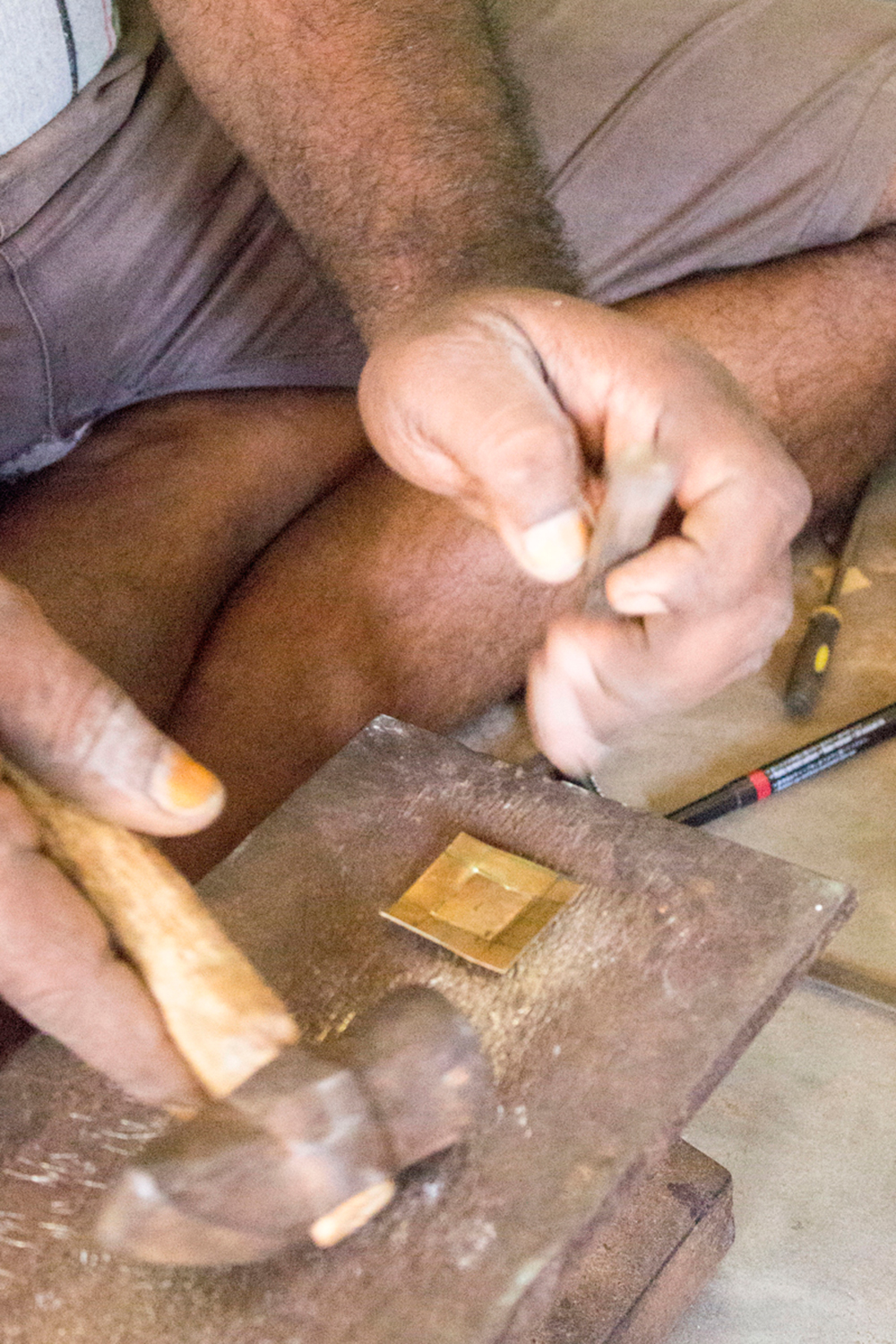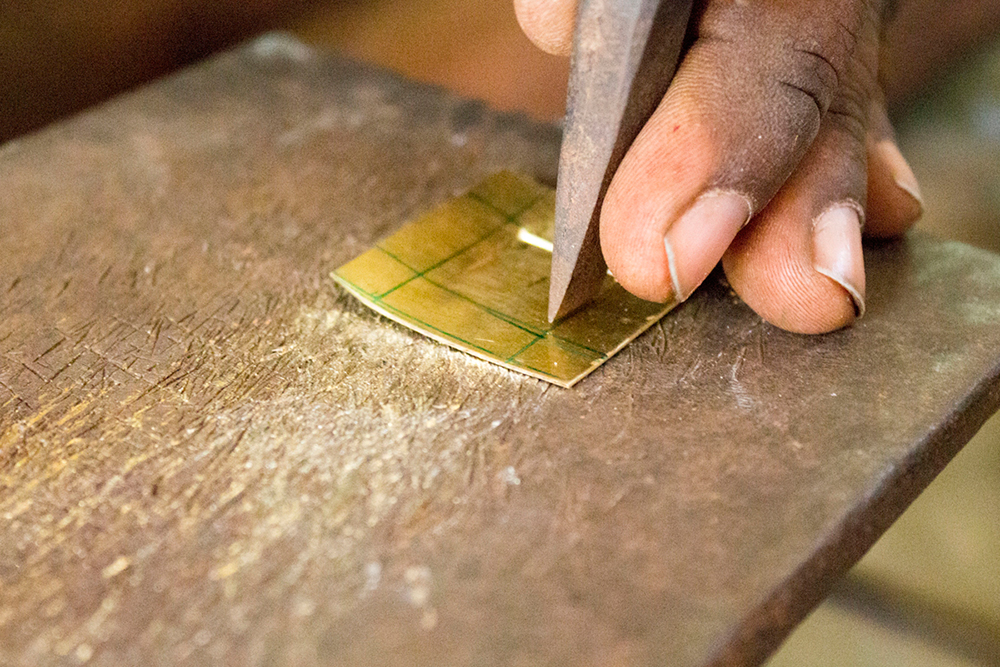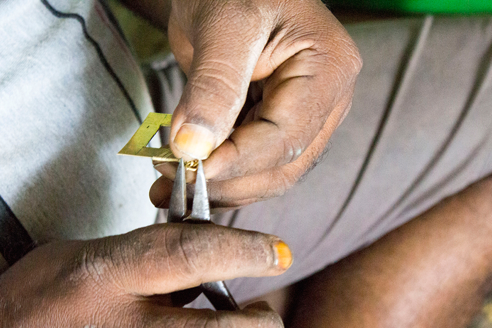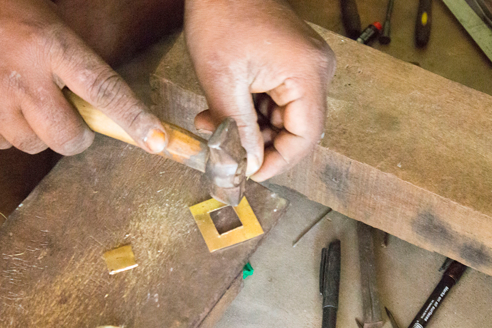 According to another technique, artisans cut out the required shape from the brass sheet and in that sheet draw a line using ruler and cut out the central position of the object using chisel and hammer. Later the inner surface of the object is smoothened by using half round file. Once the desired shape is obtained finishing the edges with brass thin wires wound around it. Wounding of brass thin wire is also like ornamentation of the jewelry. Later the prepared jewelry is treated to nitric acid test and washing of the jewelry.