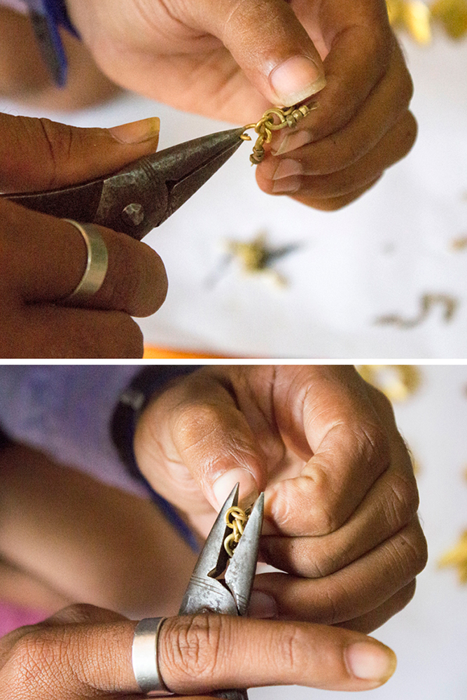 Artisan take the brass sheet and draw the required shape on the brass sheet using marker. After the desired shape is cut out by using cutter. Once the desired shape is obtained artisan start a designing on the brass sheet. Designing is made by carving the design on the brass sheet using chisel and hammer. Further artisan make the hole at the one end of the object to join the ear hook. The ear hook is prepared by using brass wire by bending. This is one type of technique used by artisans to make jewelry.
