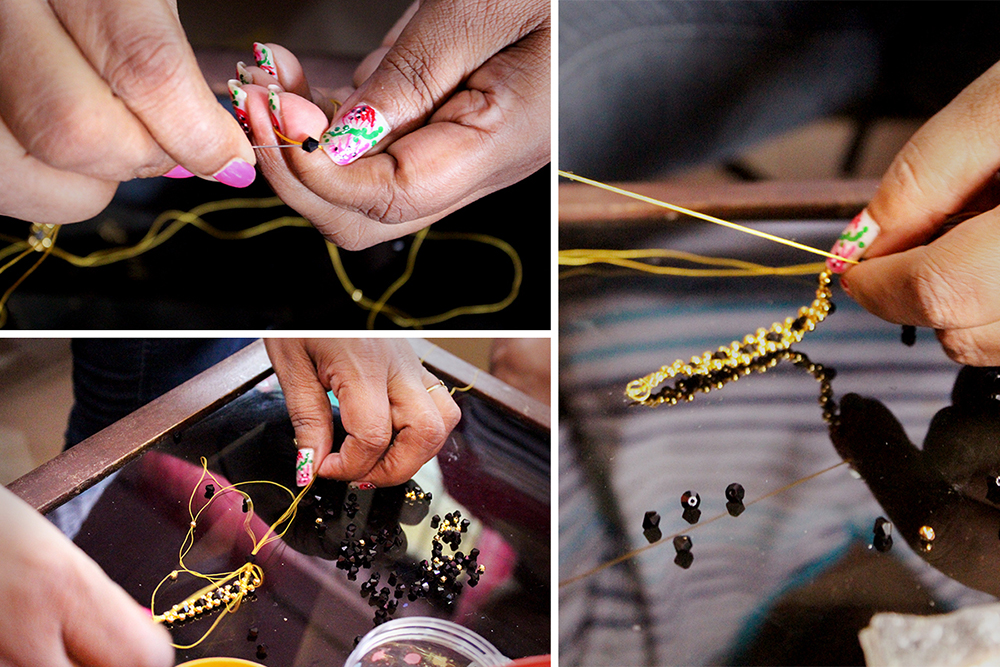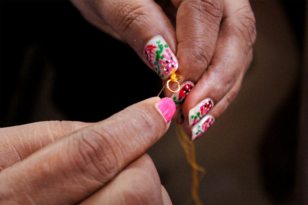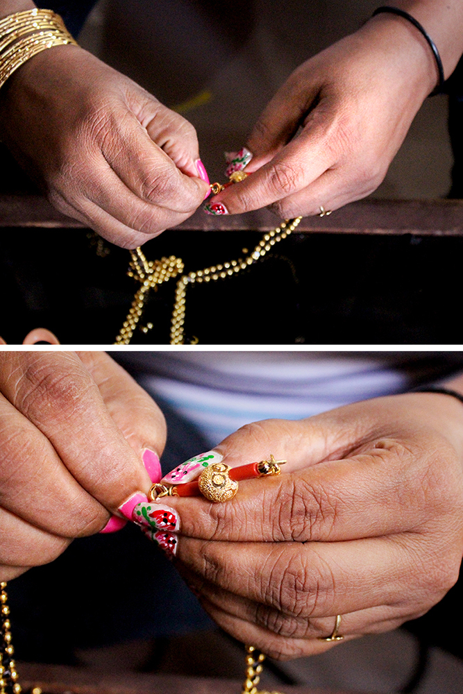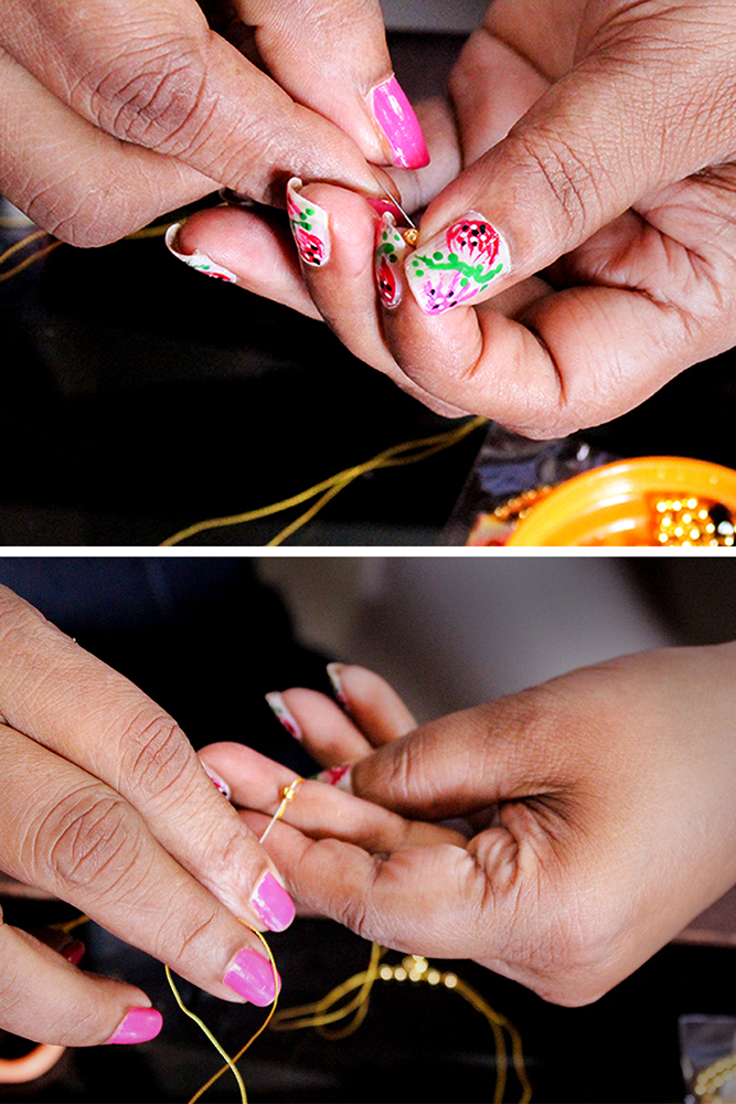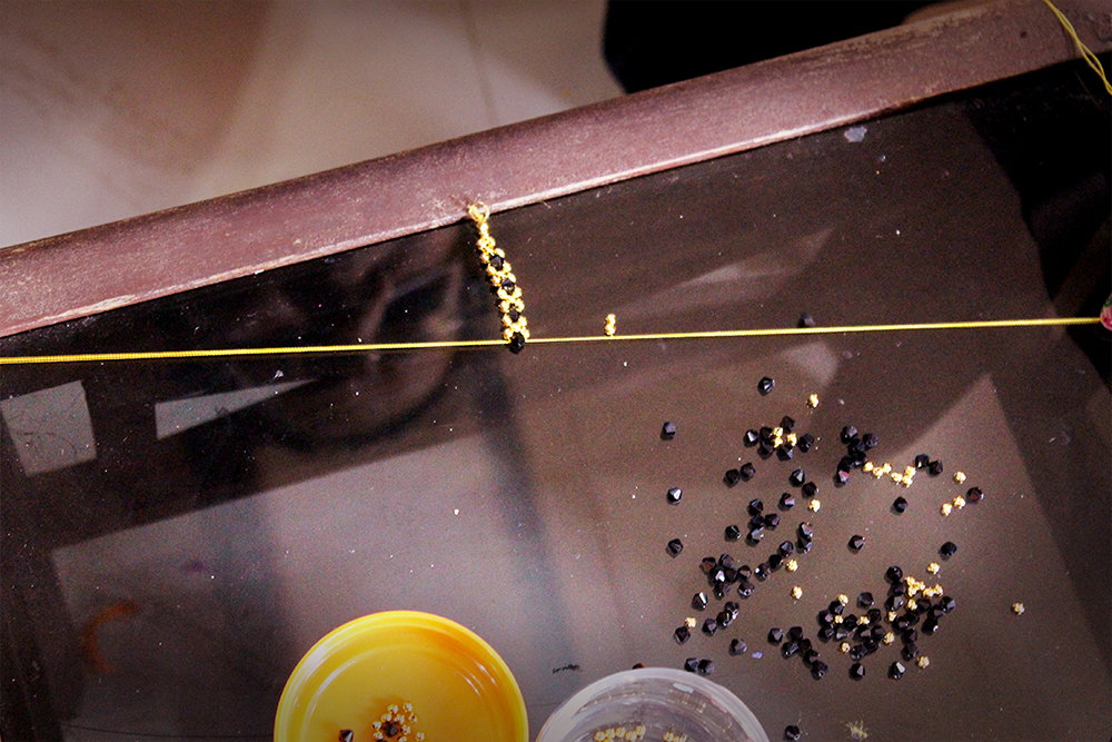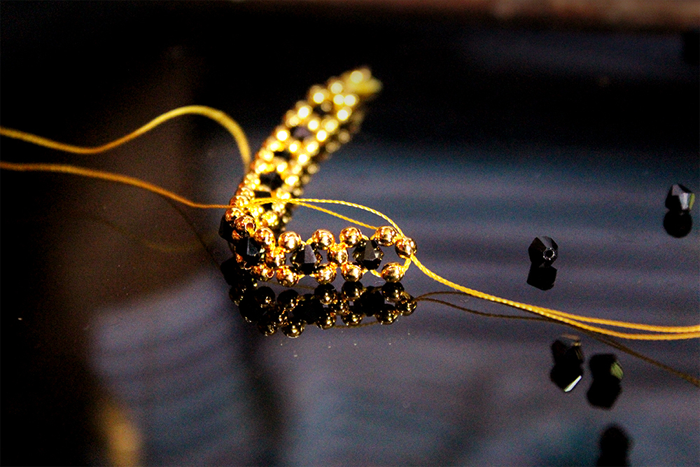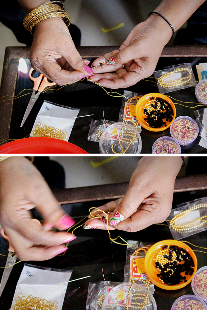 The required length of nylon thread is taken. Double strand thread is made, and a knot is put at its end. Such two threads with the needle are taken. A preferred design pendant is bought, which has a loop on either side. The two threads are inserted on the right side of the pendant’s loop. Multiple knots are made to that loop for tightness. By using both the threads, a single golden-colored bead is inserted, which settles beside the pendant. Later in one of the threads, one golden color bead and two black beads are inserted, and in the other thread, only one golden bead is inserted, and that thread is inserted inside the black beads (with the help of the needle) that are inserted in the other thread. This method makes the black beads form a knot using both the threads in a designer way. This method of inserting the beads and knotting firmly is carried throughout the desired length, and in the end, the chain that is made is knotted to the left side of the pendant’s loop firmly. The excess thread is cut off. Thus a mangalsutra is made.