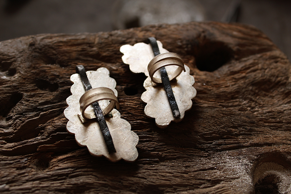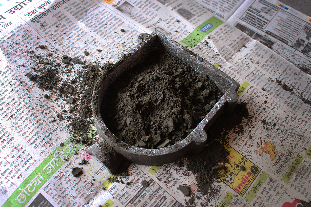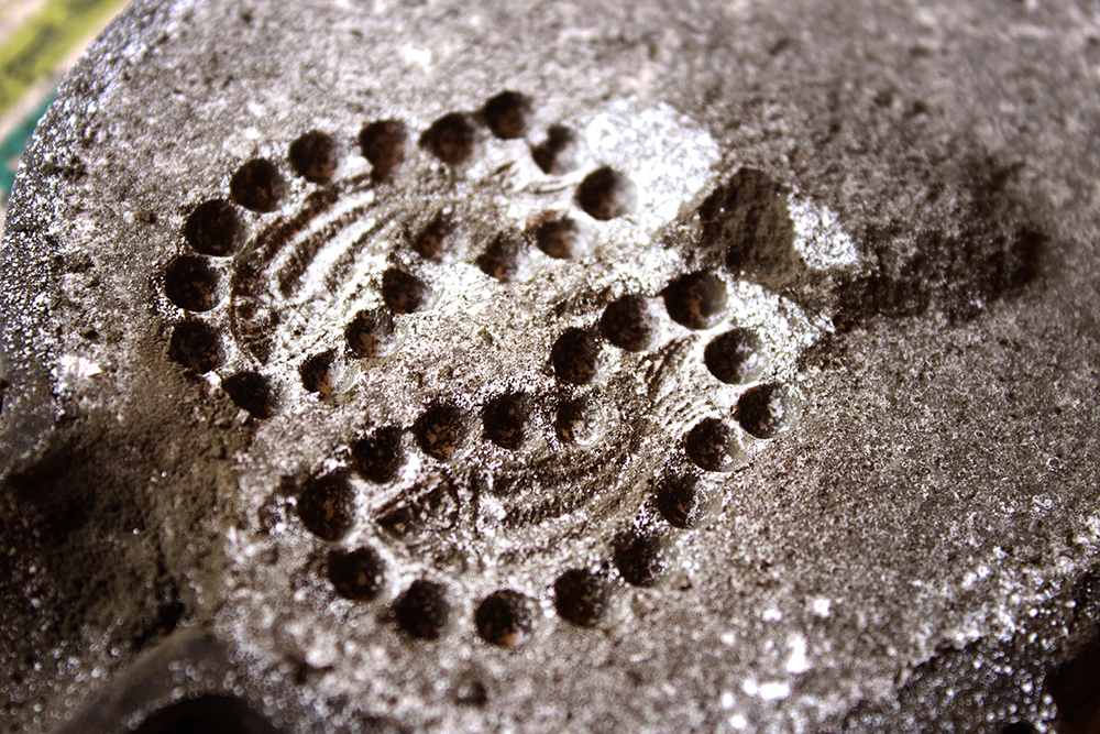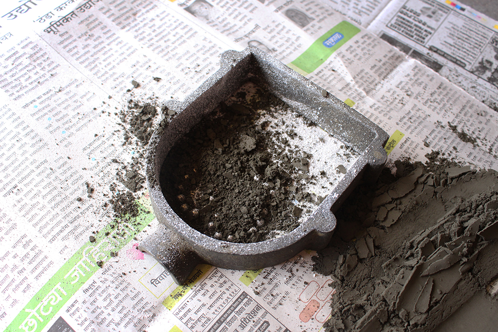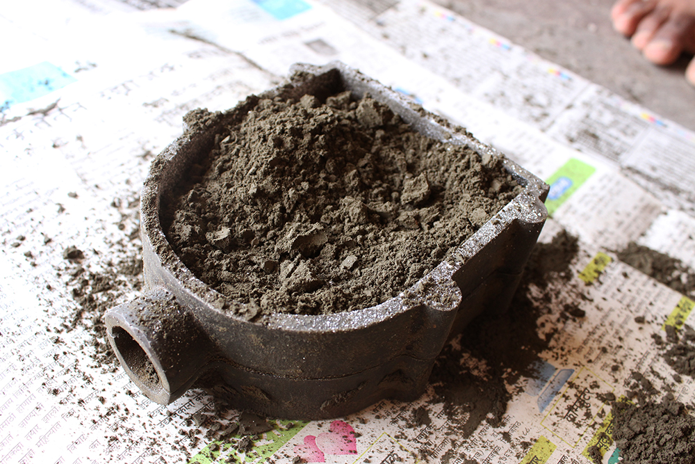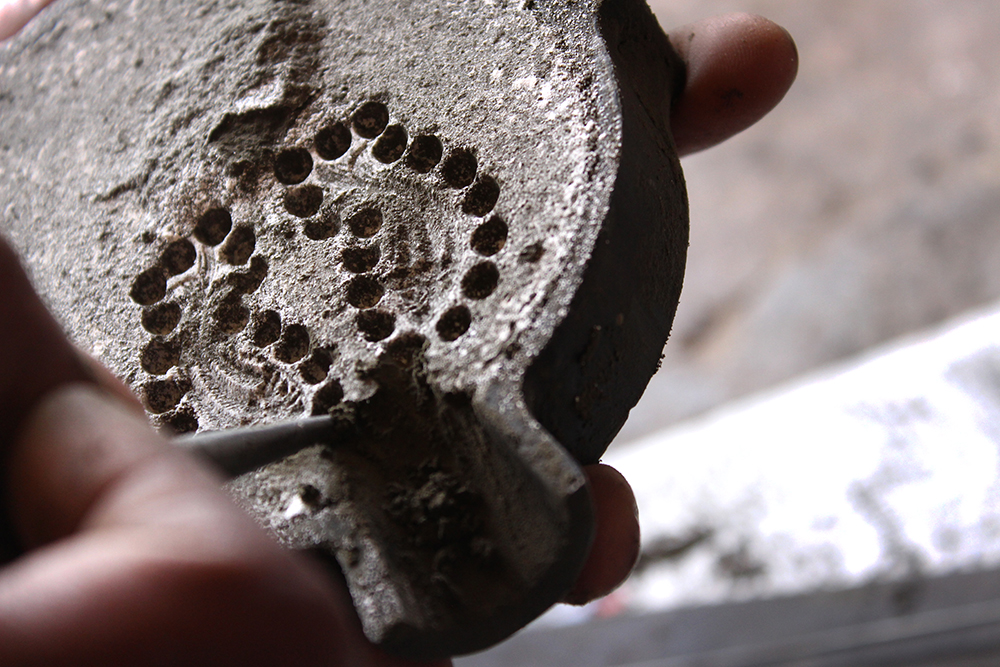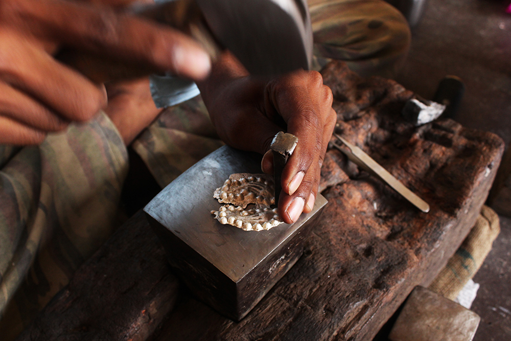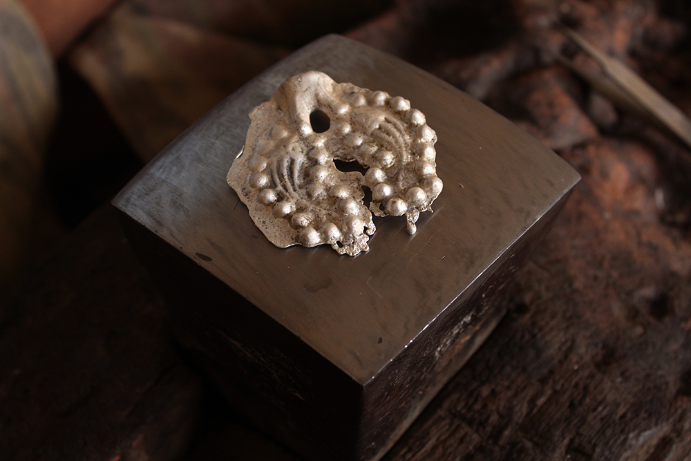 The making of masoli starts with selecting the desired design from the collection of jewelers. Once the required design is finalized, casting frame is placed on an even surface (preferably floor) and design stencil is placed inside it accurately. Afterwards some amount of ammonium chloride is sprinkled evenly then molding sand is filled inside the casting frame and pressed meticulously to create the impression of the design well and good. Once it is made the sand filled casting frame is placed upside down and the other part of the frame is placed on top of at the right place and repeats the same process of sand filling. Later on the frames are separated from each other and the metal stencil of masoli is removed carefully from it. Then some amount of sand is removed from the edges of each frame to create path for molten silver liquid during casting and once again two frames are set together and tied tightly. Afterwards molten silver liquid is made by melting raw silver or old broken silver jewellery in a particular container called ‘mush’. Once it is ready the silver liquid is carefully poured into the casting frame and set aside for some time. After sometime the frames are separated and the casted artifact is removed from it. The casted artifact is once again heated slightly for cutting and separating them into two individual pieces. Later on the edges are trimmed and brought into the shape. Then it is placed on the pressing die at right place and beaten it carefully with an iron hammer to bring more sharpened features and once it is done again the sides are trimmed and filled. Later on the adjustable silver rings are soldered at the plain backside of casted silver artifact to give the fullest form of the toe ring ‘masoli’. As a part of finishing the toe ring is washed and polished with soap berry and fine sand. The whole organic and traditional method of crafting masoli makes it an exceptional and unique art.