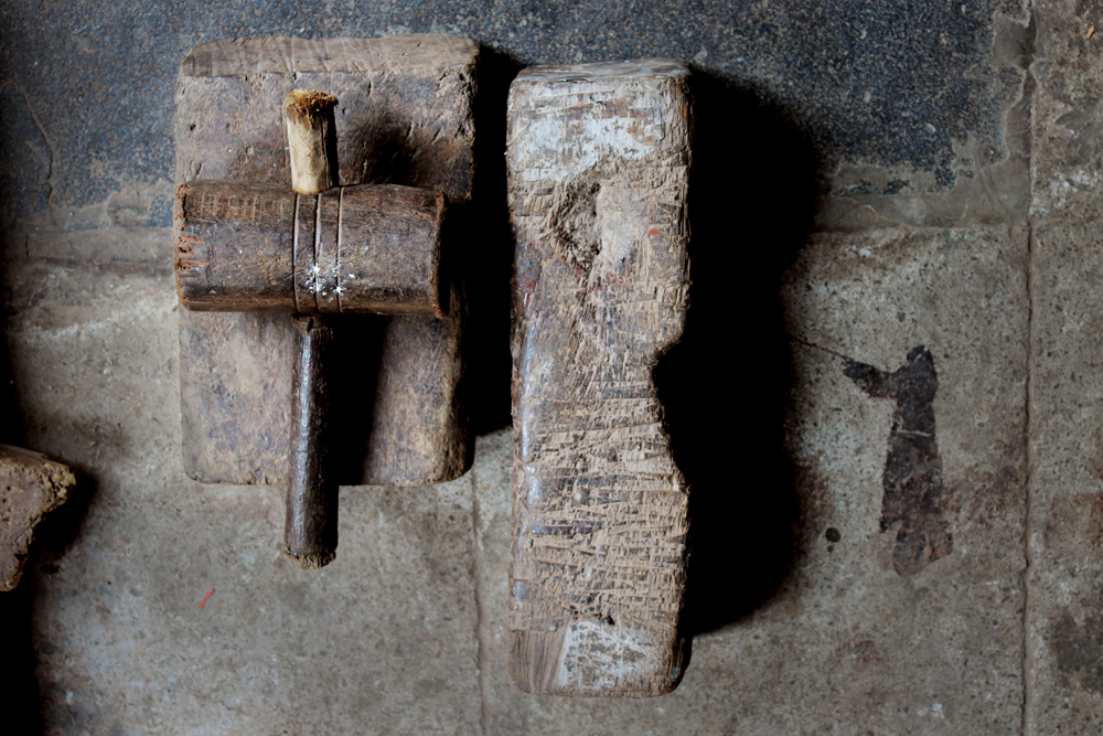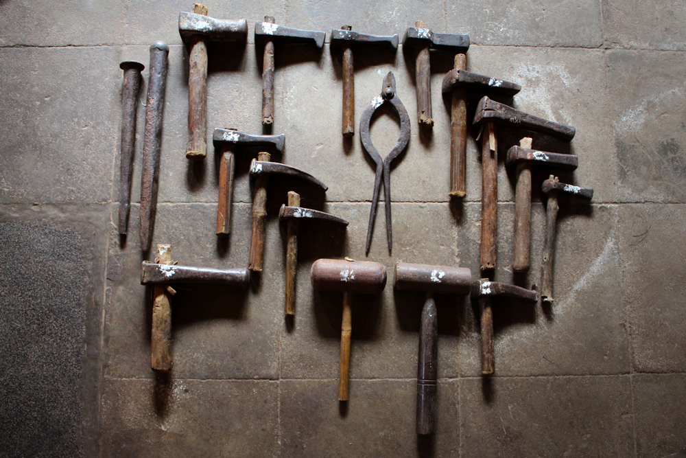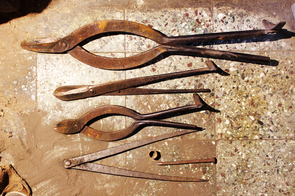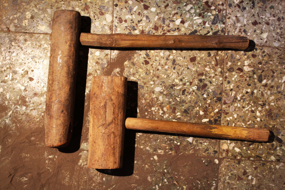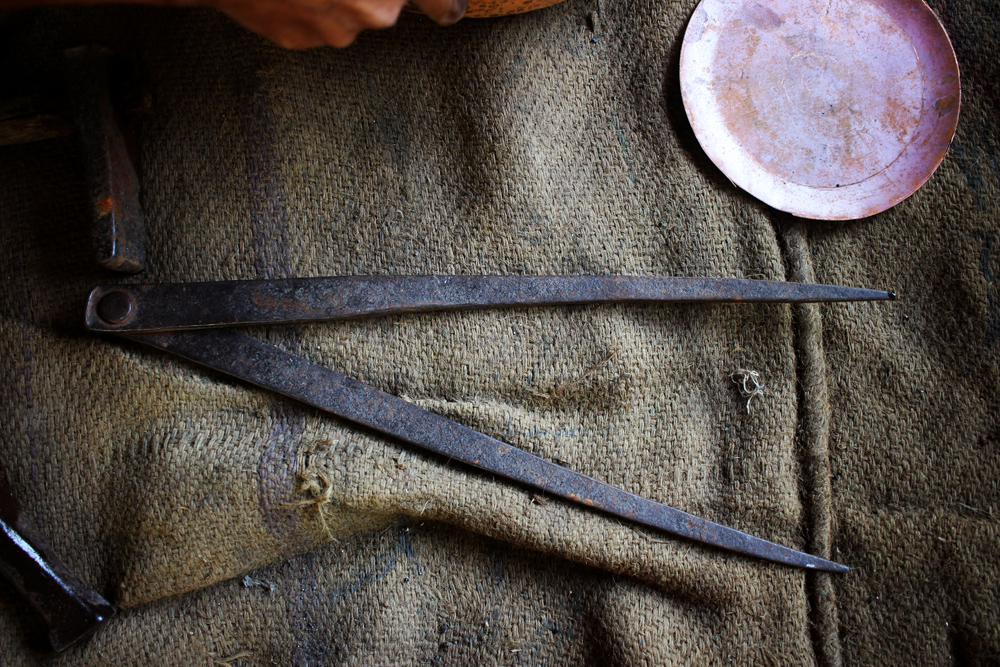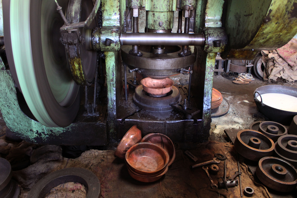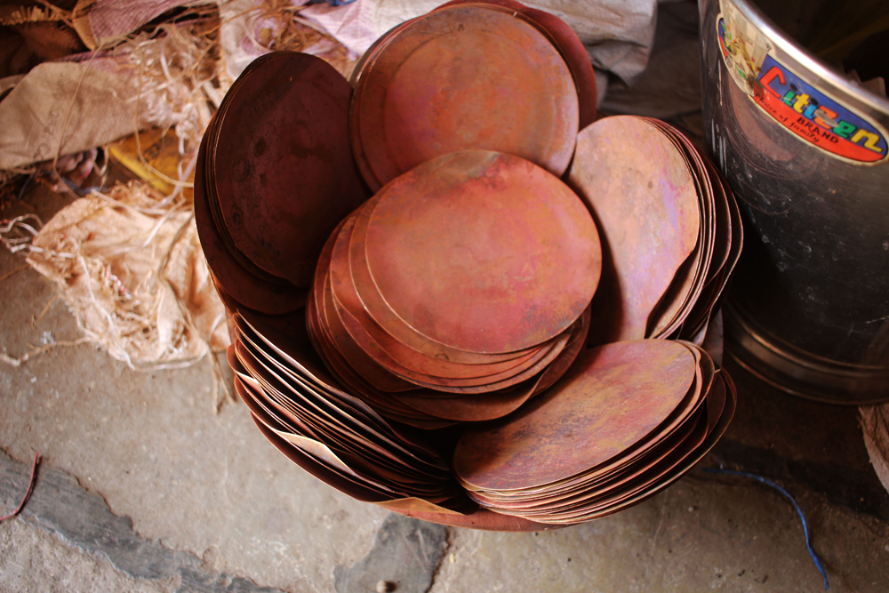 The tools are used in making of copper vessels are bhatas (bellows) for blowing the fire. Sandsi (pair of tongs) Katris (two pair of scissors) Kansis (files), shandhan (an iron bar which has a very shiny and smooth surface) set of Kharvais (bar anvils), Khod (wooden frame which is paired with kharvai as seating) Mogris (wooden hammers), Dabaks (various shaped metal hammers in different sizes), Togar (big iron nails), Adi (circular shaped iron tyre), Mandli (smaller size of adi) and buffing machine.