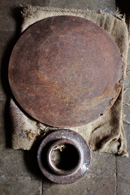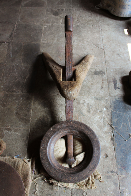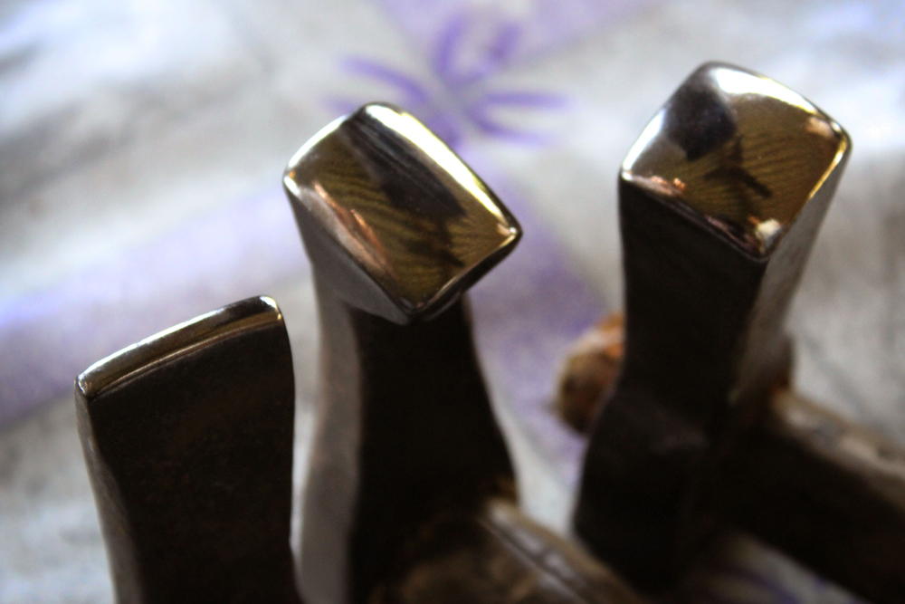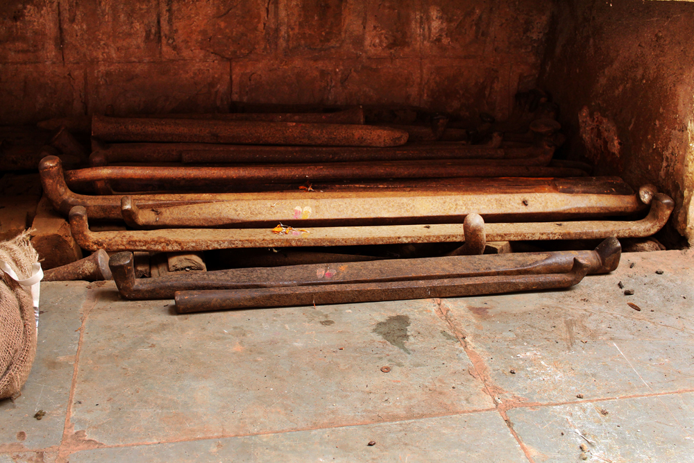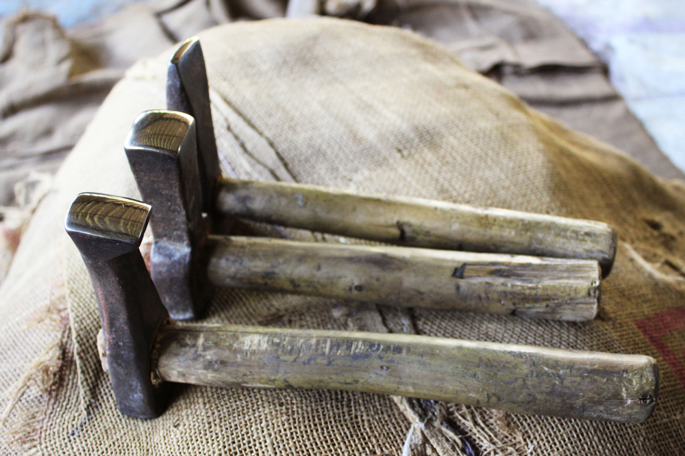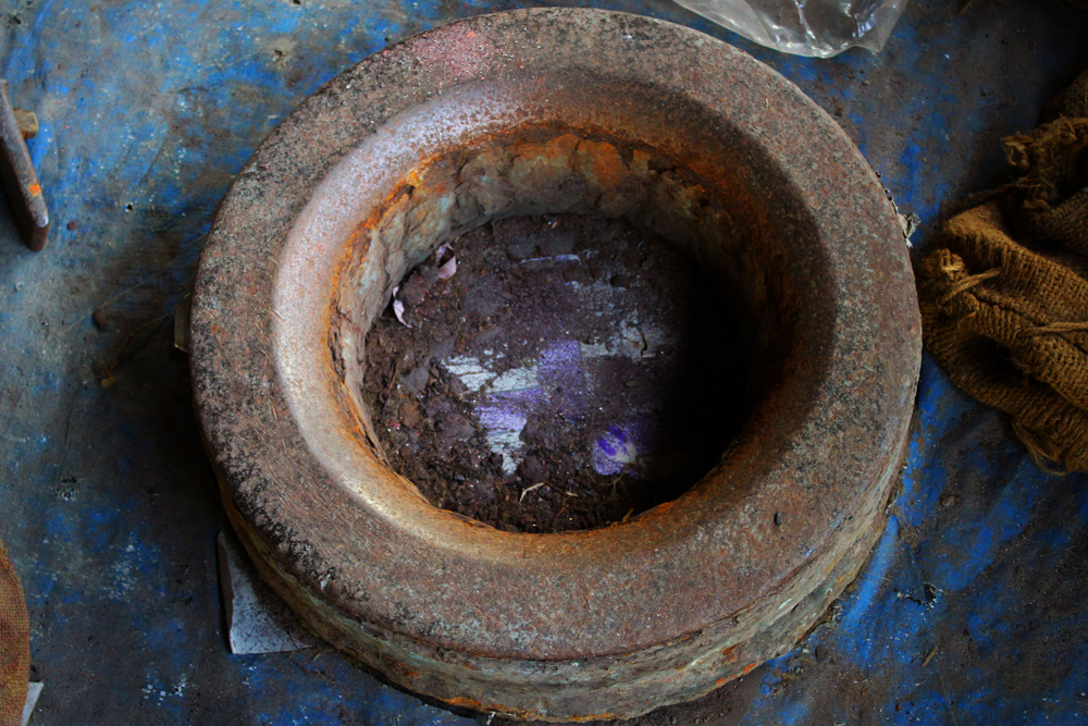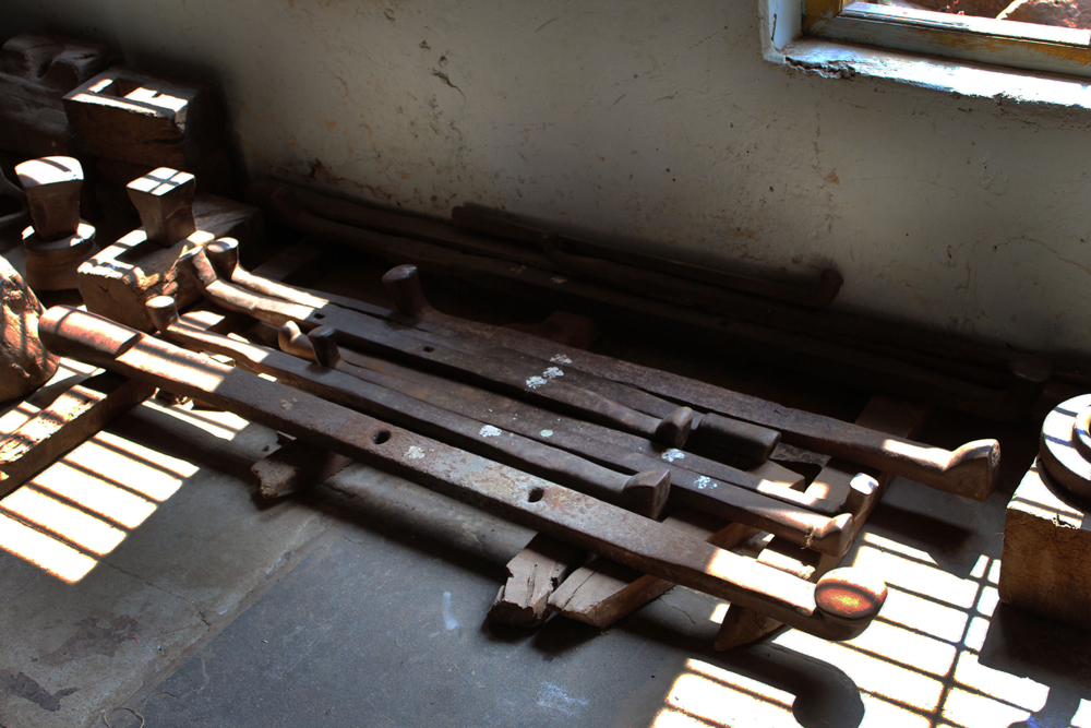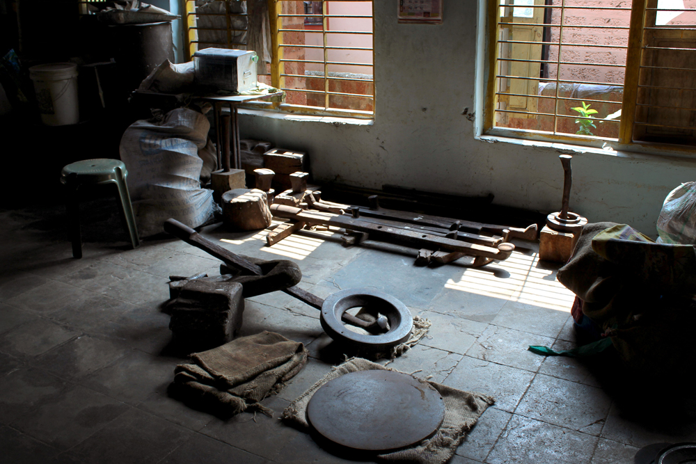 The tools are used in making of copper vessels are bhatas (bellows) for blowing the fire. Sandsi (pair of tongs) Katris (two pair of scissors) Kansis (files), shandhan (an iron bar which has a very shiny and smooth surface) set of Kharvais (bar anvils), Khod (wooden frame which is paired with kharvai as seating) Mogris (wooden hammers), Dabaks (various shaped metal hammers in different sizes), Togar (big iron nails), Adi (circular shaped iron tyre), Mandli (smaller size of adi) and buffing machine.