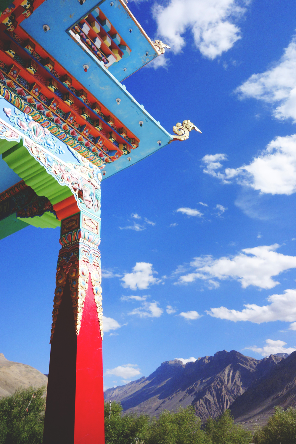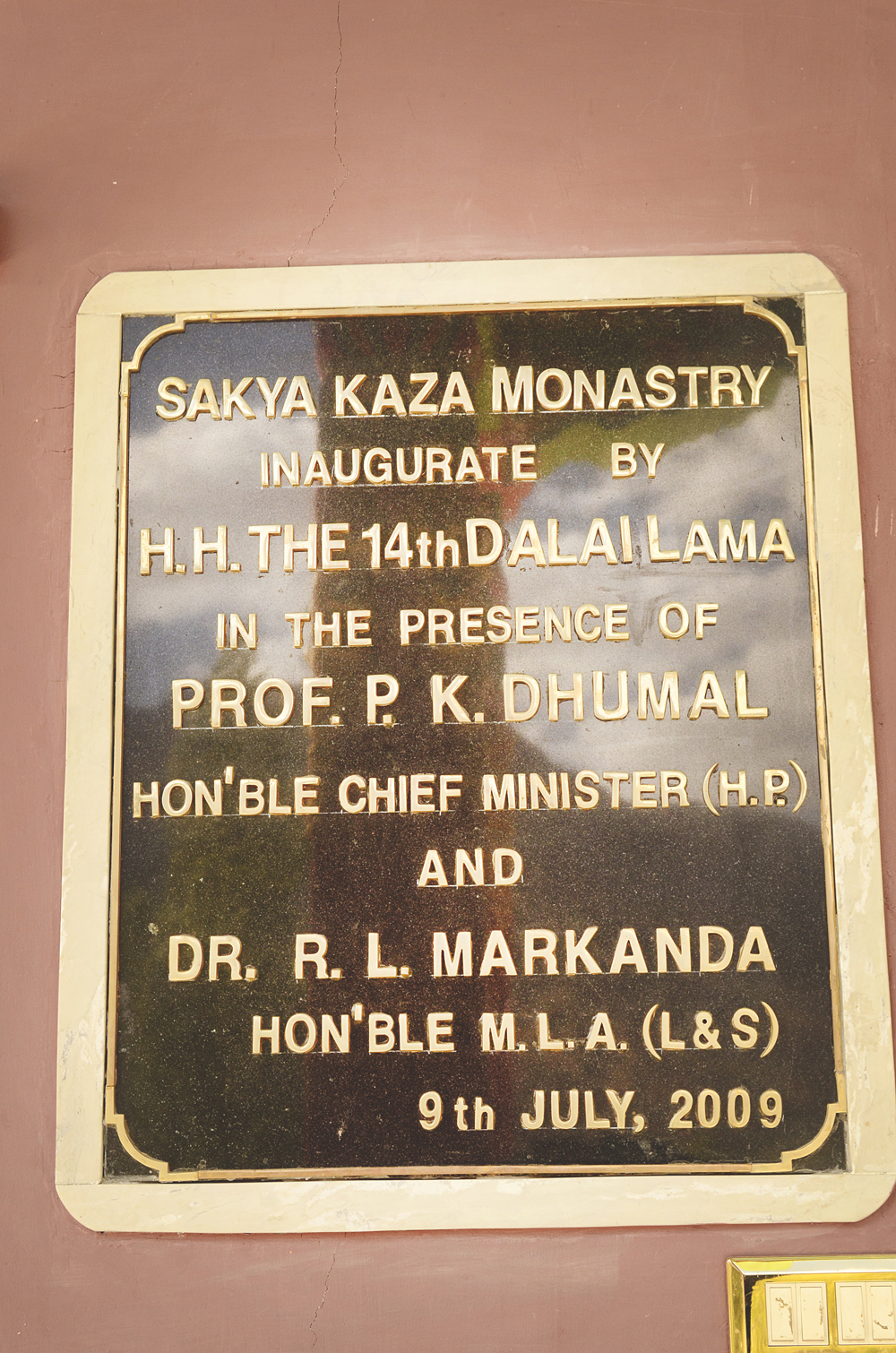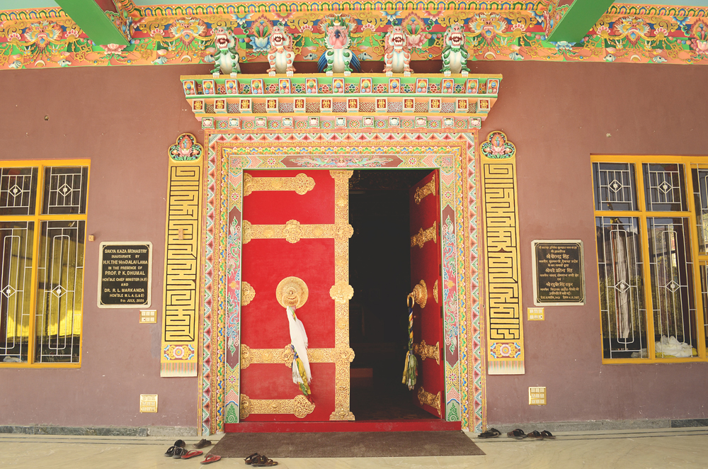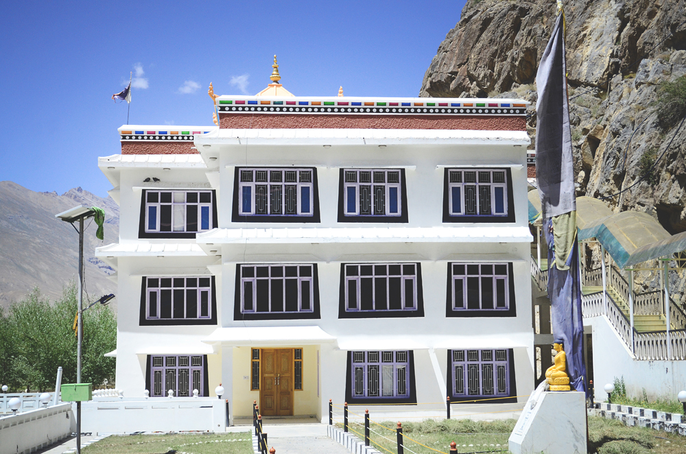Sakya Tenggyu monastery is located in Kaza town of Spiti Valley, Himachal Pradesh. Newly built in 2009, its vibrant Buddhist architecture illustrates a beautiful picture of Sakya sect of Tibetan culture. Colorful paintings highlight the intricate details throughout the elegant structure. The ornamental brass door hinges are just an example of the complex finishes. It is believed to be one of 108 temples and monasteries built by the renowned Buddhist scholar-translator Lochen Rinchen Sangpo. The newer building, which greets visitors today stands where the former monastery, known as Tenggyud Lhundrup Choekhor Ling, existed for 35 years. And just as its predecessor, Sayka Kaza Monastery remains connected to the old monastery building above. His Holiness the Dalai Lama inaugurated the new Sakya Tenggyu monastery on July 9, 2009.