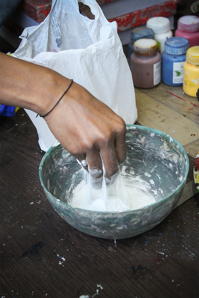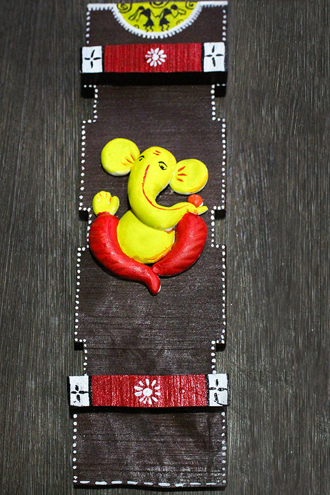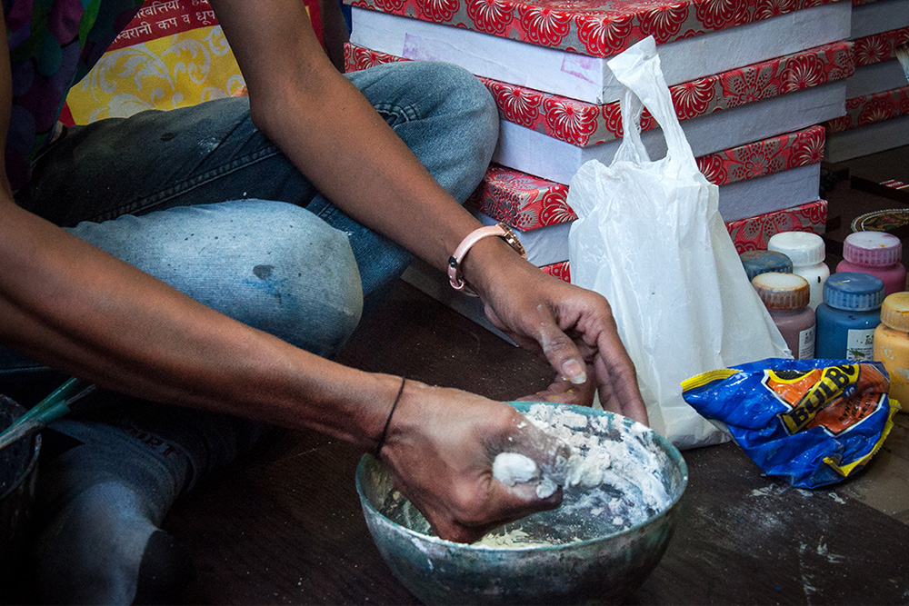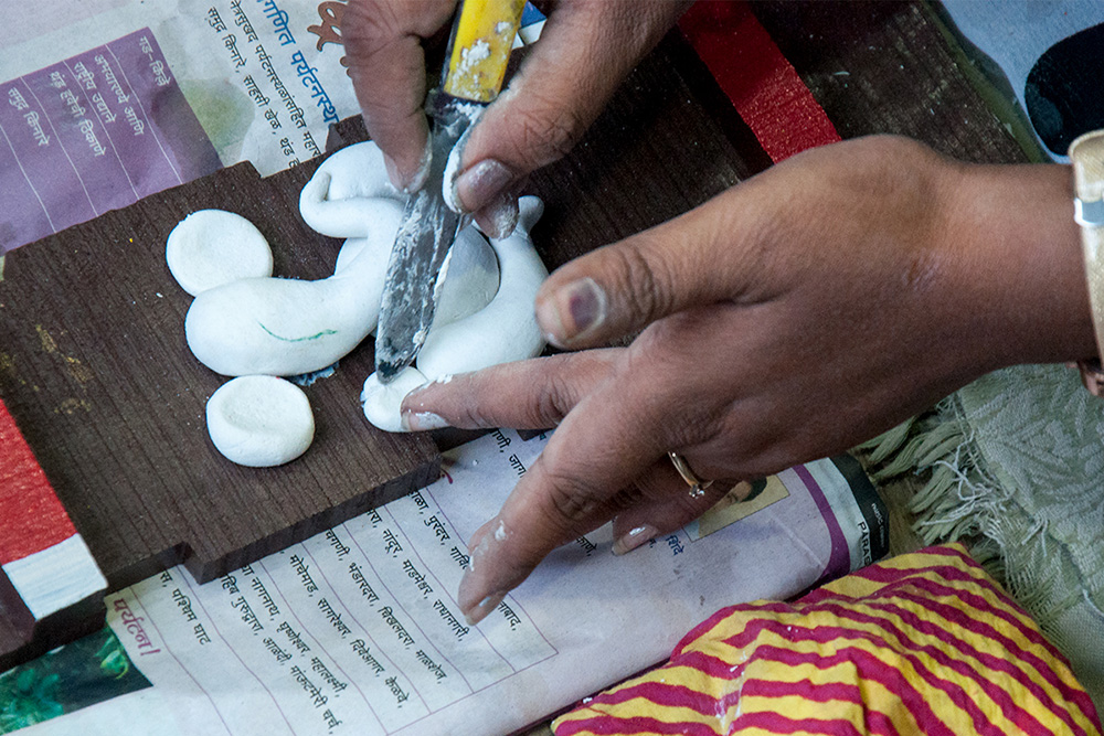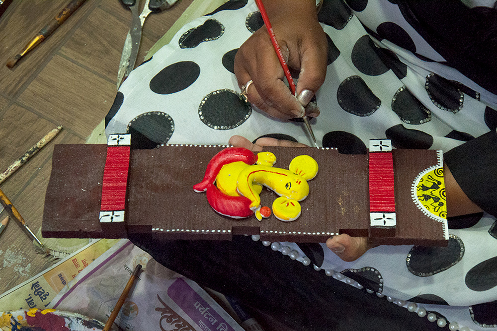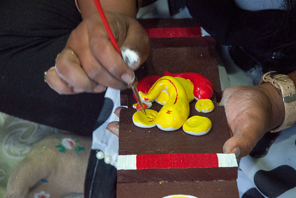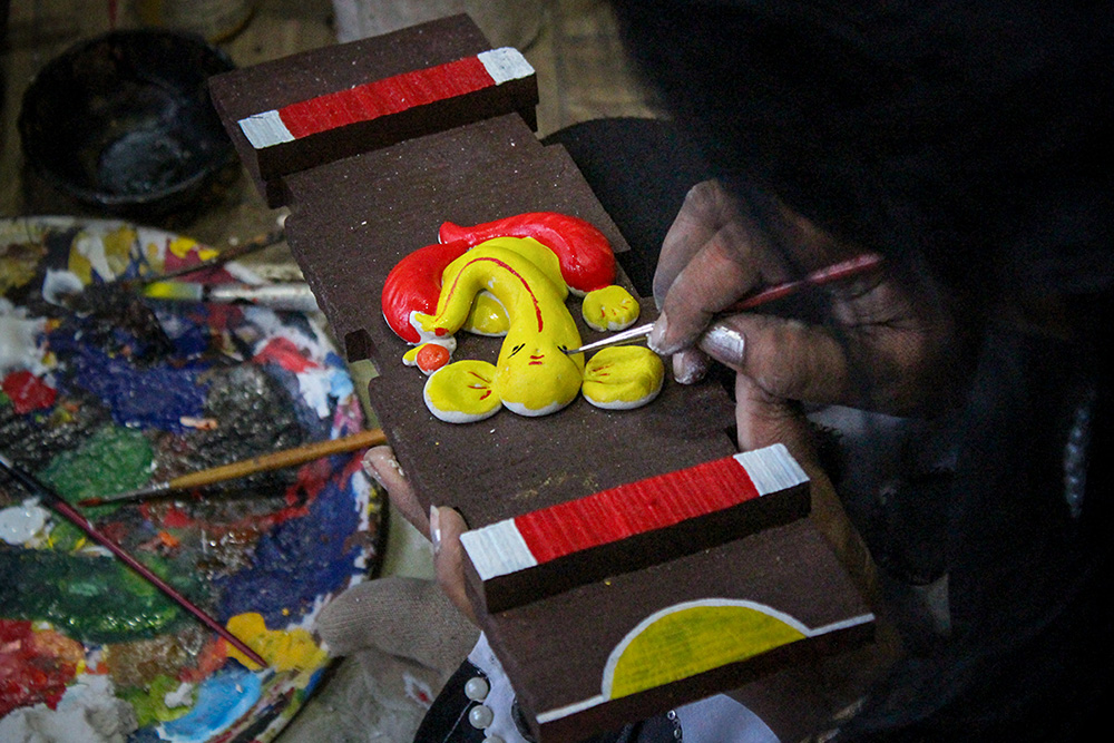 This clay is usually rolled over a workspace dusted with ceramic powder. The rolls are shaped into indented figures and then stuck to the POP-coated board. Here the artisan makes necessary impressions over this, using a pen or the end tip of a paintbrush. After the ceramic is adequately dried, it is painted with acrylic colours.