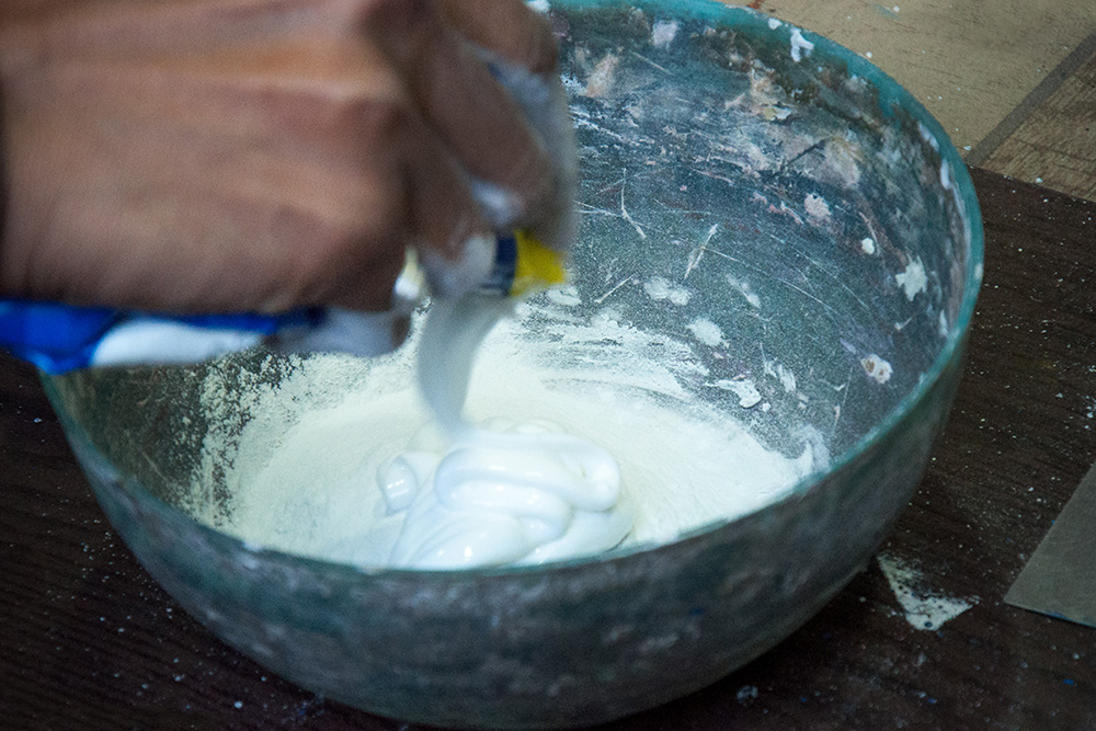 Firstly, the artisan sketches a mural design on the MDF board of 6mm thickness to make mural art. While sketching, the direction of an imaginary light source is marked, and accordingly, the placement of highlights and shadows is determined. Then Synthetic adhesive and POP are mixed in a 1:1 ratio to form a paste that is applied over the board and spread evenly with a knife. Another clay dough is made using ceramic powder and synthetic adhesive to create embossing shapes.