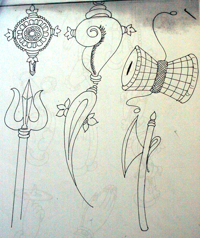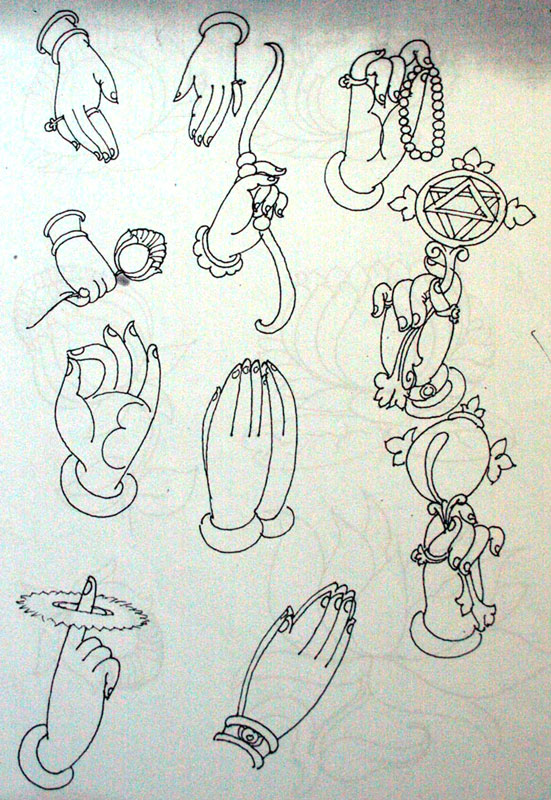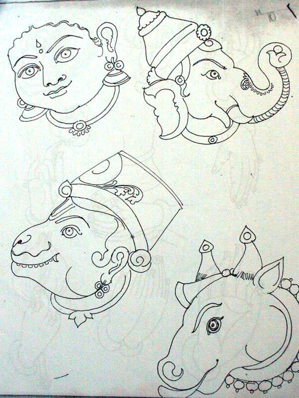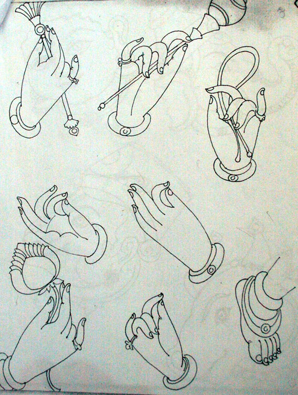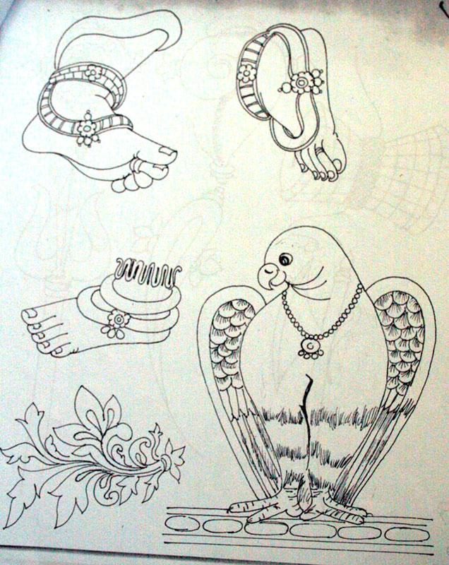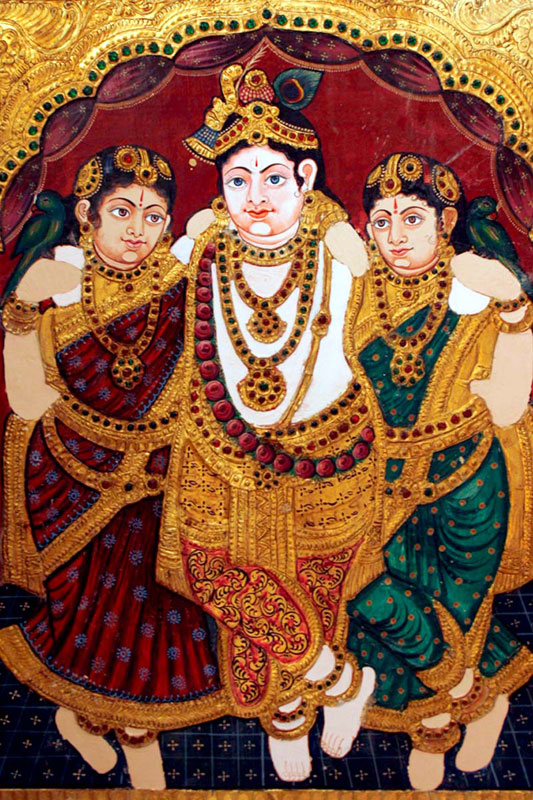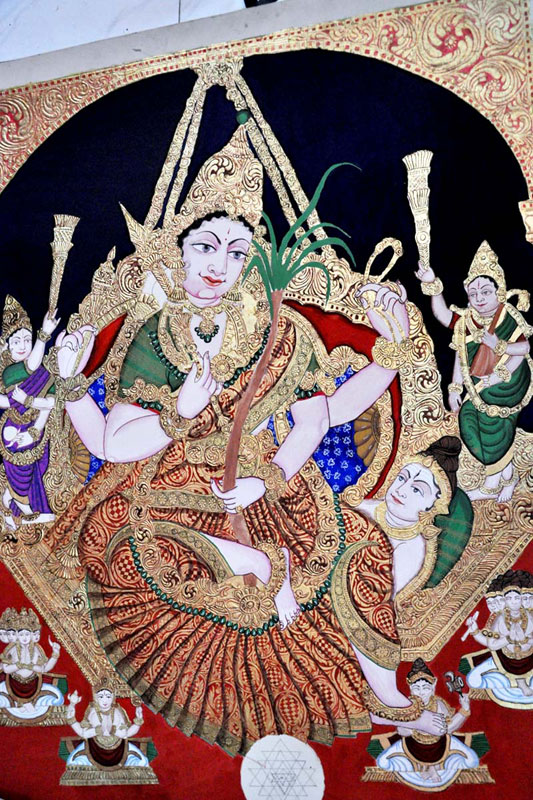 The figures have features like fish shaped eye, round protruded chin, typical Mysore royal hairdo and drapping style in sarees, depiction of royal jewellery, rounded face, Mysore turban. They depict sugarcane as bow and arrow in the pictures of Raja - Rajeshwari. The foot of goddesses is placed on flower in order to show the respect. And the architectural backgrounds of many paintings are faithful copies of the architectural features of the Mysore palace. There are many paintings in which the subjects they have shown are based on shlokas that are mentioned in the book named “Devatahanama kusumamanjari” written by the king of Mysore “Mummadi Krishnaraja Wodeyar”. “Krishna Sakhis” is the example of painting in which the backside of the figure is shown. Another example “Mantramayi Rama” where the artist has made the figure of Shri Rama, in which they have made the outline by writing Rama in Kannada. Schematic themes of Tirupati, Sringapatna, Kanchipuram, Srikakulam, Kalhasti etc. provided the base for the paintings in earlier times.