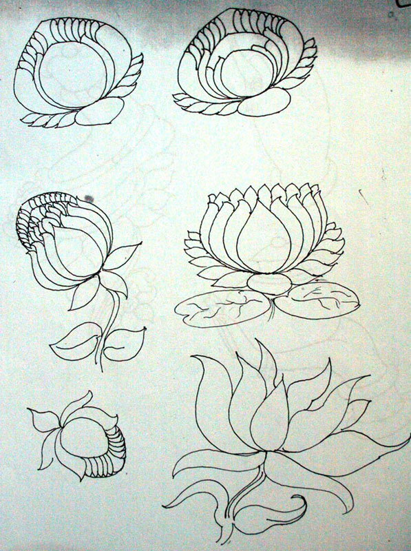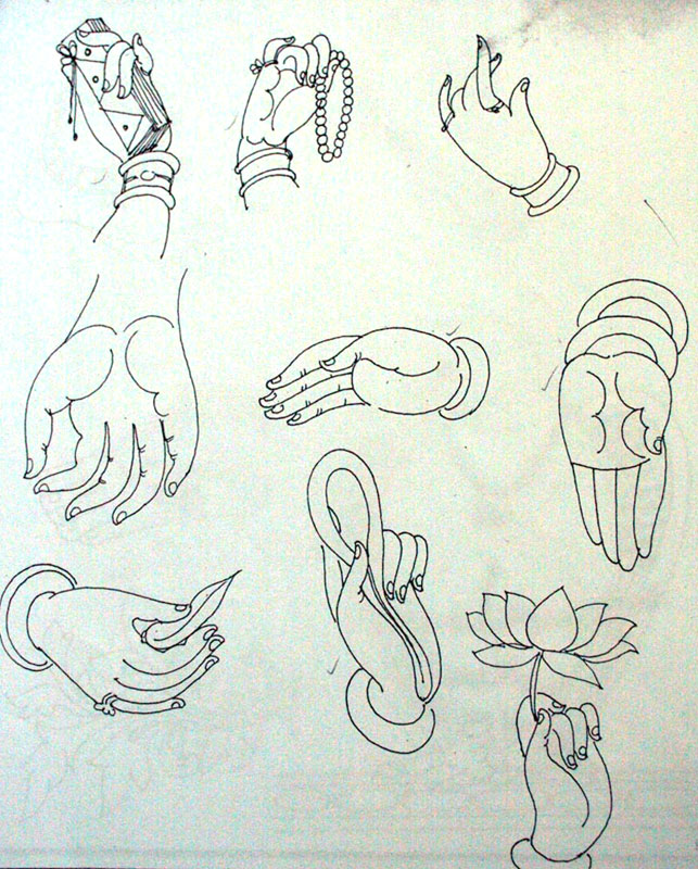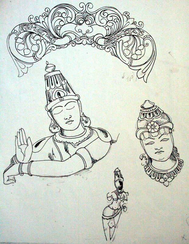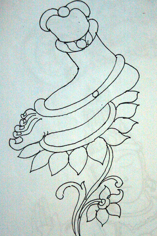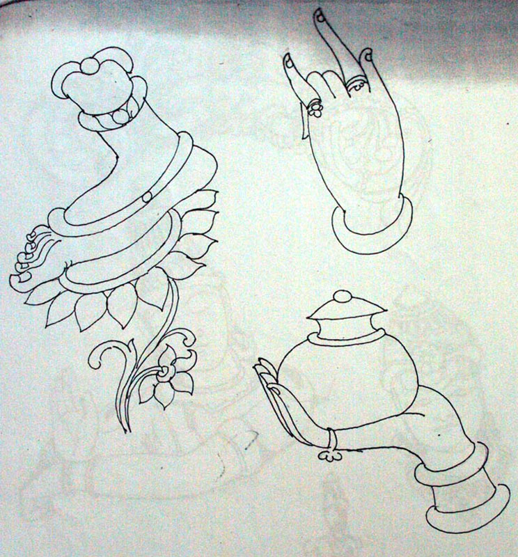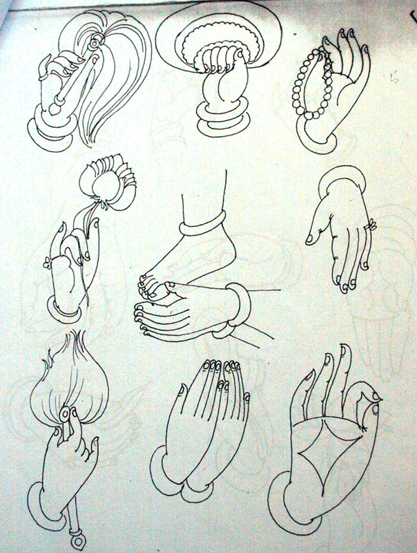 The figures have features like fish shaped eye, round protruded chin, typical Mysore royal hairdo and drapping style in sarees, depiction of royal jewellery, rounded face, Mysore turban. They depict sugarcane as bow and arrow in the pictures of Raja - Rajeshwari. The foot of goddesses is placed on flower in order to show the respect. And the architectural backgrounds of many paintings are faithful copies of the architectural features of the Mysore palace. There are many paintings in which the subjects they have shown are based on shlokas that are mentioned in the book named “Devatahanama kusumamanjari” written by the king of Mysore “Mummadi Krishnaraja Wodeyar”. “Krishna Sakhis” is the example of painting in which the backside of the figure is shown. Another example “Mantramayi Rama” where the artist has made the figure of Shri Rama, in which they have made the outline by writing Rama in Kannada. Schematic themes of Tirupati, Sringapatna, Kanchipuram, Srikakulam, Kalhasti etc. provided the base for the paintings in earlier times.