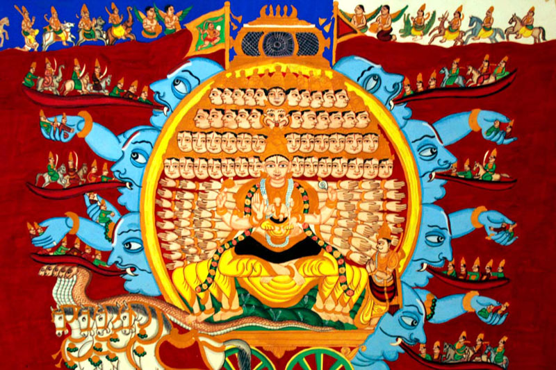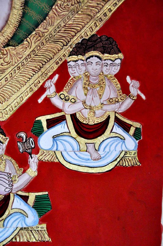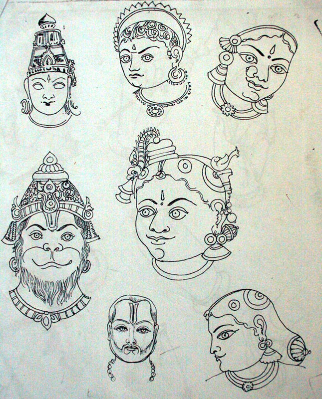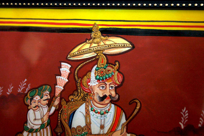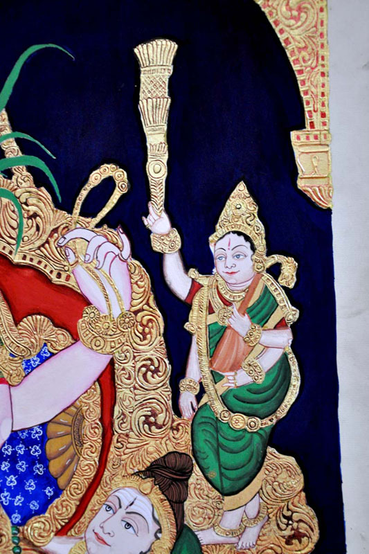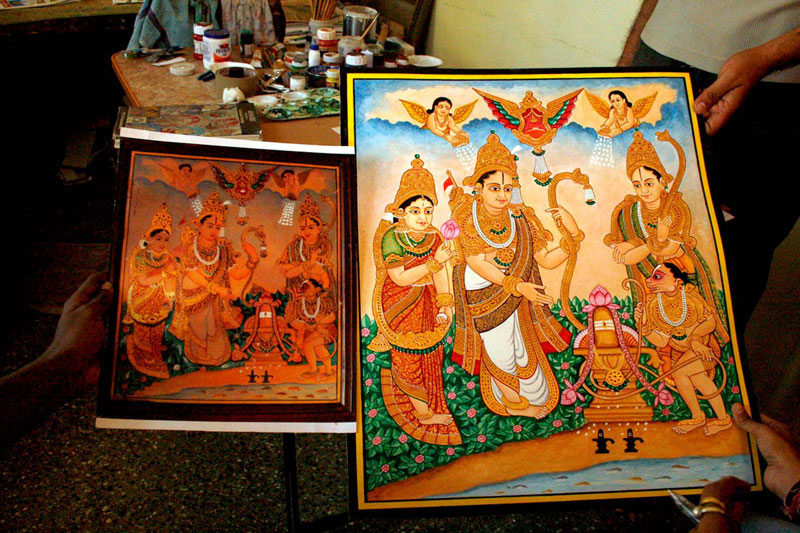 In Mysore style of paintings the most popular themes are Goddess Rajarajeshwari and Sri Rama Pattabhishekam, Kodandarama, Dashavathara, Chamundeshwari apart from Lakshmi and Saraswathi, the coronation of Sri Rama (Rama pattabhisheka), wedding of Shiva and Parvati (Girijakalyana), Sri Rama with bow and arrows (Kodanda-Rama), Sri Krishna with his foster mother (Yashoda-Krishna) and the goddess Chamundeshwari, the family deity of the Mysore royal house. Occasionally portraits of the king and his family were painted. 19th century Mysore artists created paintings of Hindu Myths, Gods and epic heroes as well as scenes of court life and battle. Though the subjects were religious and mythological, the models were from real life.