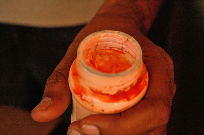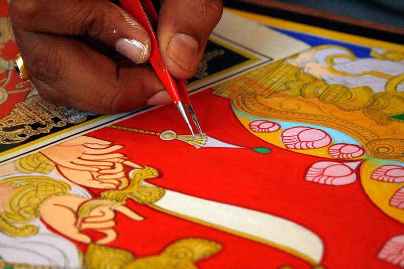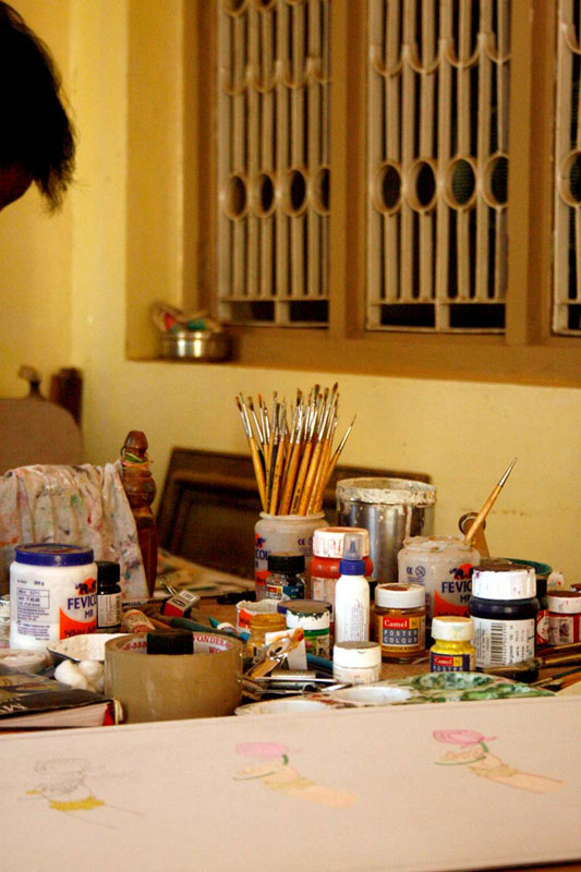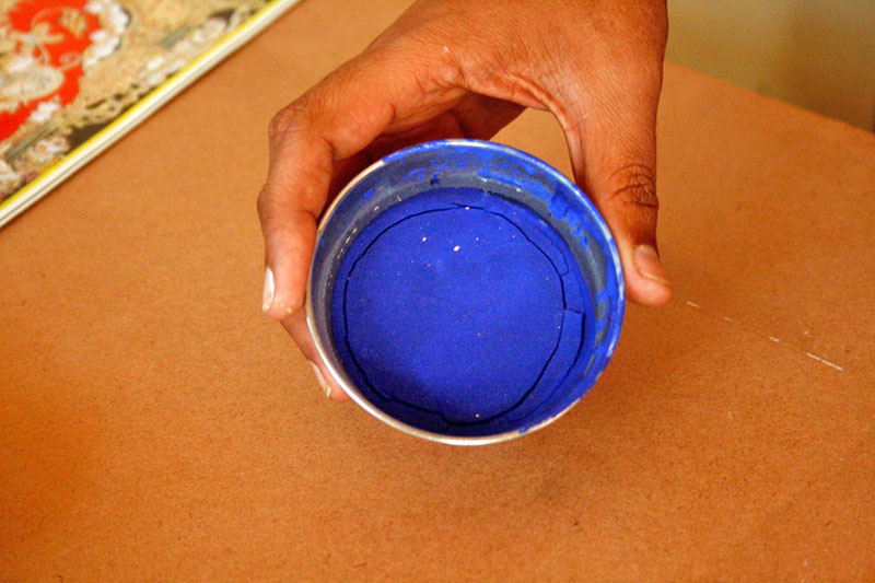 In the traditional Mysore paintings, all the inputs were made by the artists like brushes, paints, board, gold foil, etc. The sketches were made with the help of charcoal, which was prepared by burning tamarind twigs in an iron tube. The brushes were made of different materials, like squirrel hair, camel hair, goat hair, etc. Even today the artists prefer squirrel haired brush instead of synthetic brushes because they are more durable and refined. Some artists use plucker to remove the excess of gold foil. Variation exists in the procedure of mixing colors. Some artists use ceramic tiles for better mixing of colors. For the background colors they use small dishes and coconut shells. They get the color in granular form and use it by mixing water. In case of poster colors they remove the excess oil from the top to achieve matte finish. The process of making Arabic gum involves the artist gets it in granular form and then dip it in water for overnight and then filter it using muslin cloth.