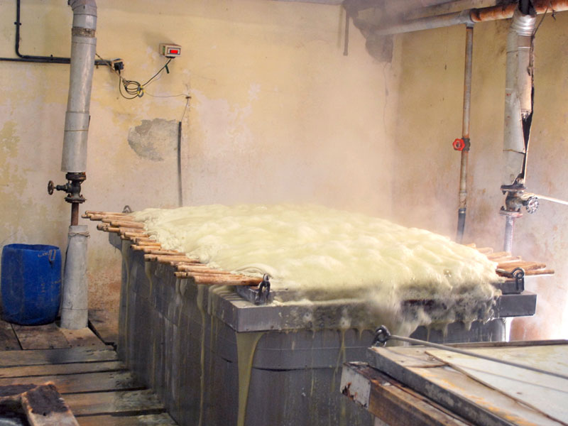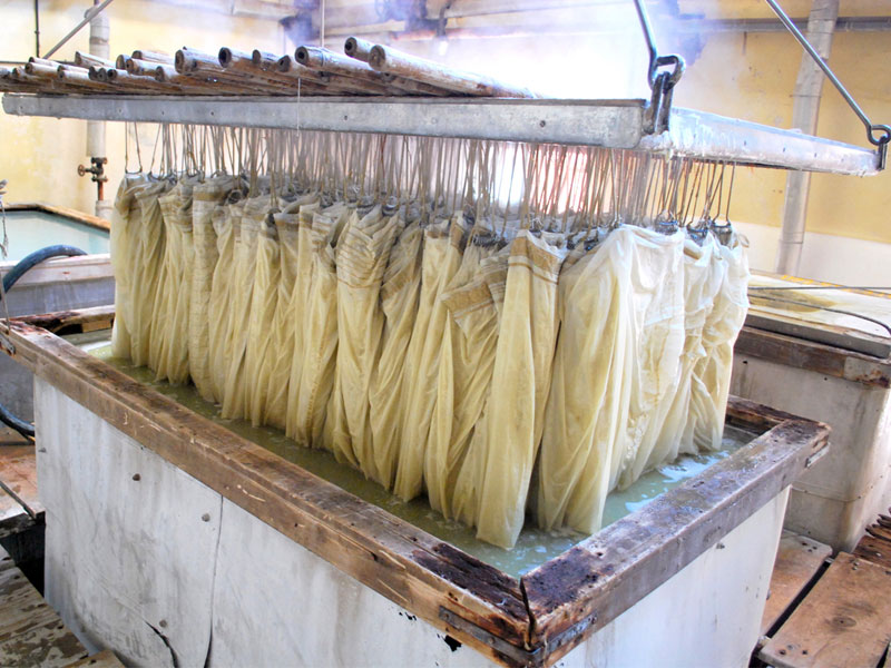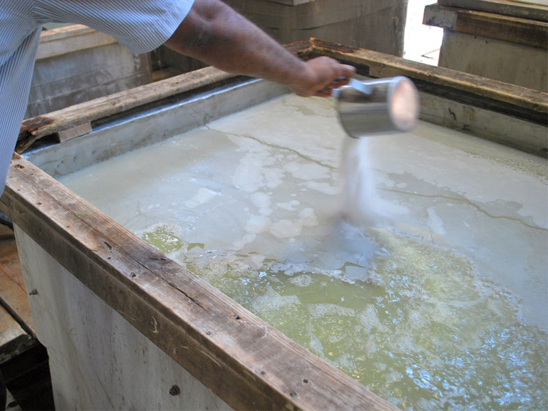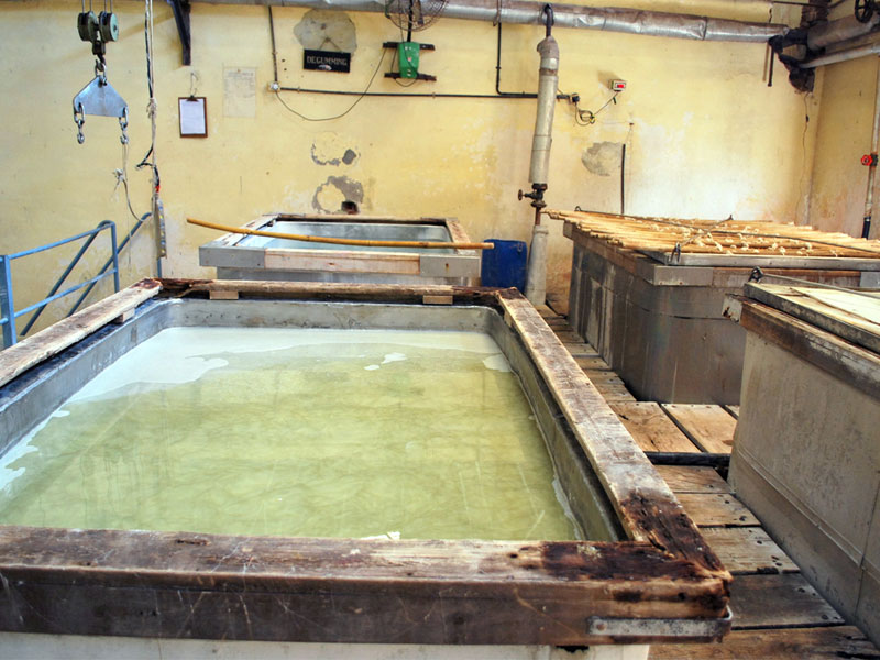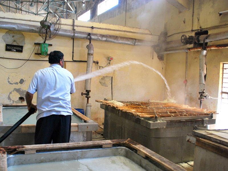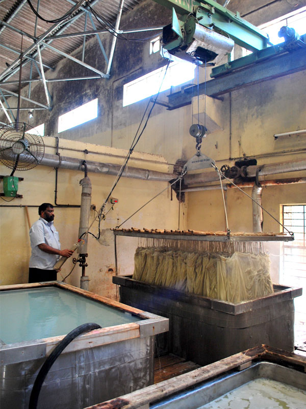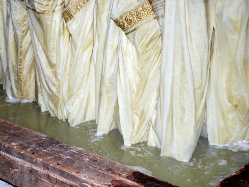 After weaving, the cloth is generally rough. The degumming process is done to smooth the fabric before dyeing. The Degumming section consists of 4 tanks, Around 230 sarees are clamped by metal springs and soaked in boiling water at 90 degrees. Soap chips and soda ash is added and the sarees are soaked in the solution upto 2 hours. The clamps are tied by rope to Bidder wood logs as they are heat tolerant. This makes the fabric soft. The solution starts frothing and is washed down by water at normal temperature through a hose pipe. The sarees are levered out through a semi-automatic machine and are put in hot water again for 15 minutes to remove excess solution. The machine is controlled remotely by the worker. The sarees are removed from the hot water tank and sent for hydro extraction.