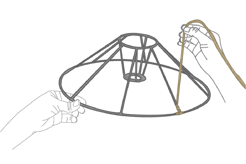 Initially, the basic structure for the lamp is done by welding iron rods according to the required design and size. Then the natural fibre threads are winded neatly to the basic structure of the lamp. Then artisan starts to knot the thread one by one which is made of jute plant at the top. Then the process continues with the knitting process where the artisan picks alternate threads and knots the threads tightly to obtain the required design. The lampshade made of natural fibres is done by weaving the threads so that all the threads are interlinked which creates fine-looking apparel. Once done with the knitting process, the artisan starts to join the knitted threads by stitching with the help of a needle and the thread. Whereas jute cloth is stitched at the backside of the lampshade.