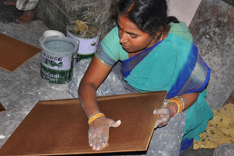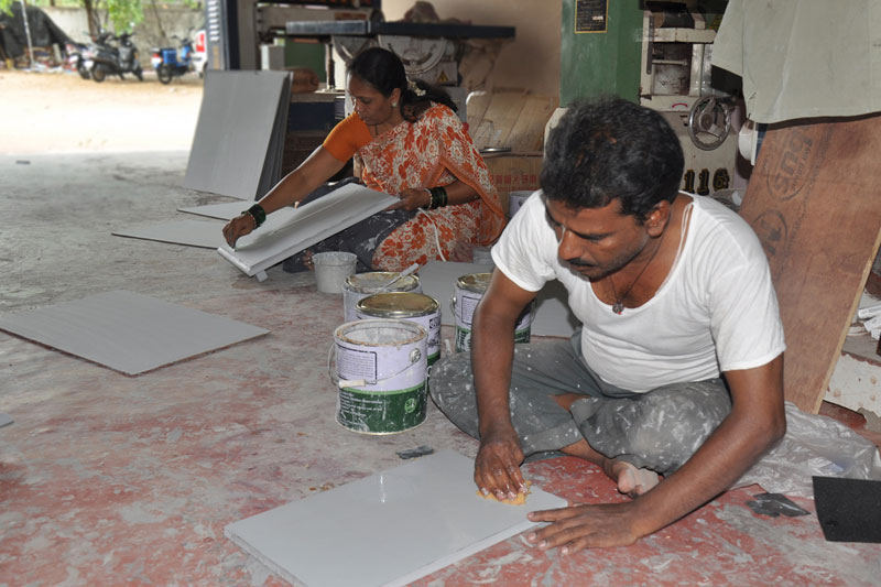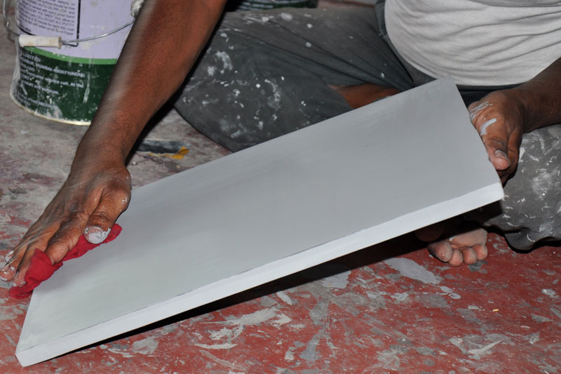Luppa Paint (NC patti) is coated on the rectangular shaped wood board around 5 to 6 times. This paint absorbs the moisture from the wood and helps the wood to last for long. After applying luppa paint black paint is sprayed for the background.