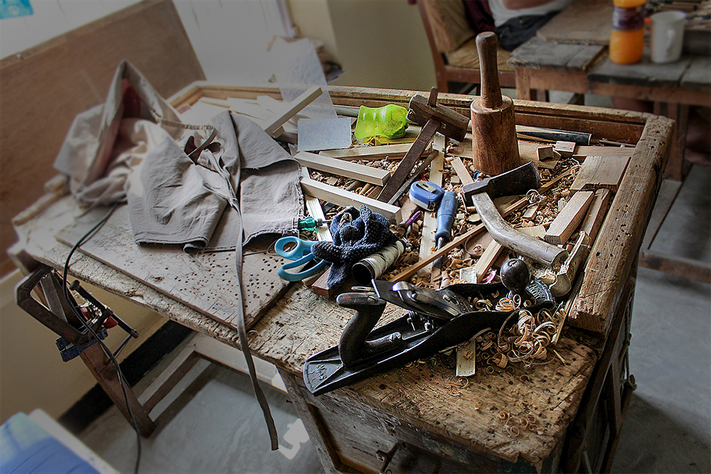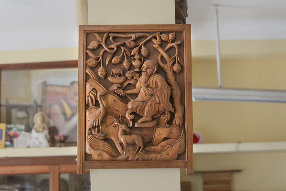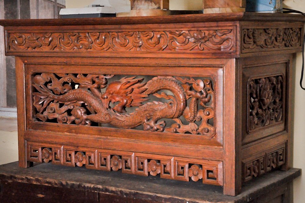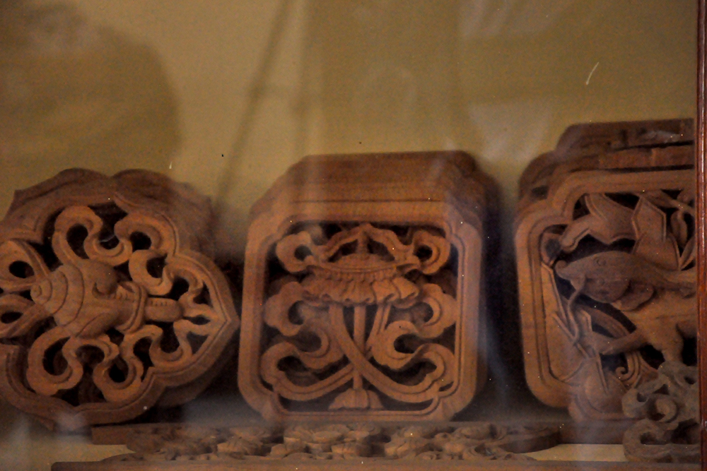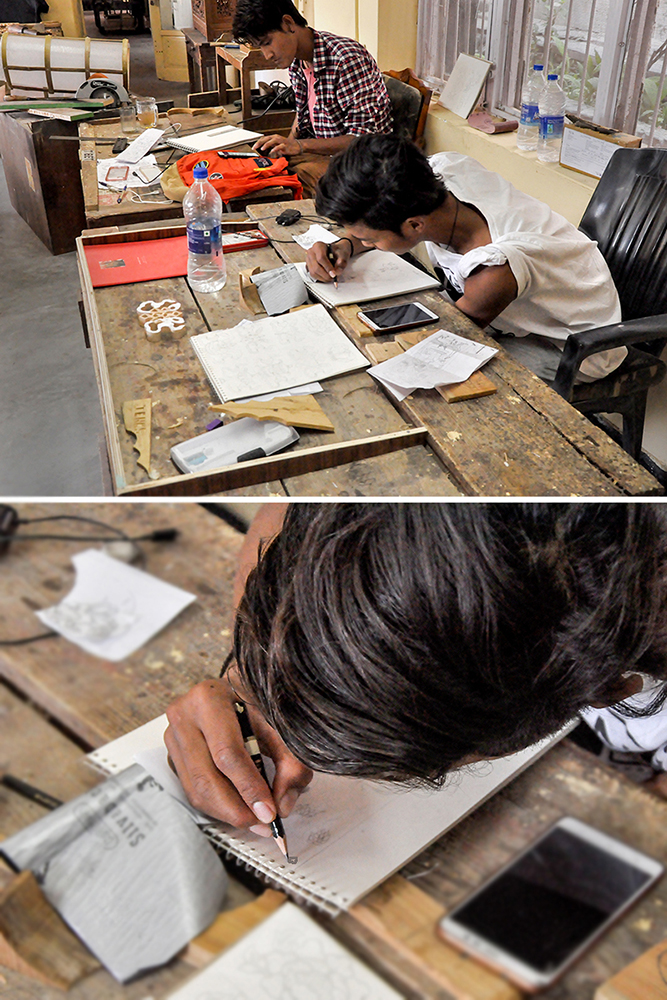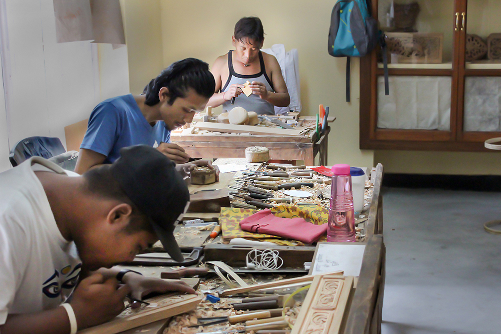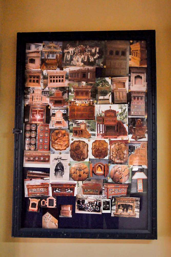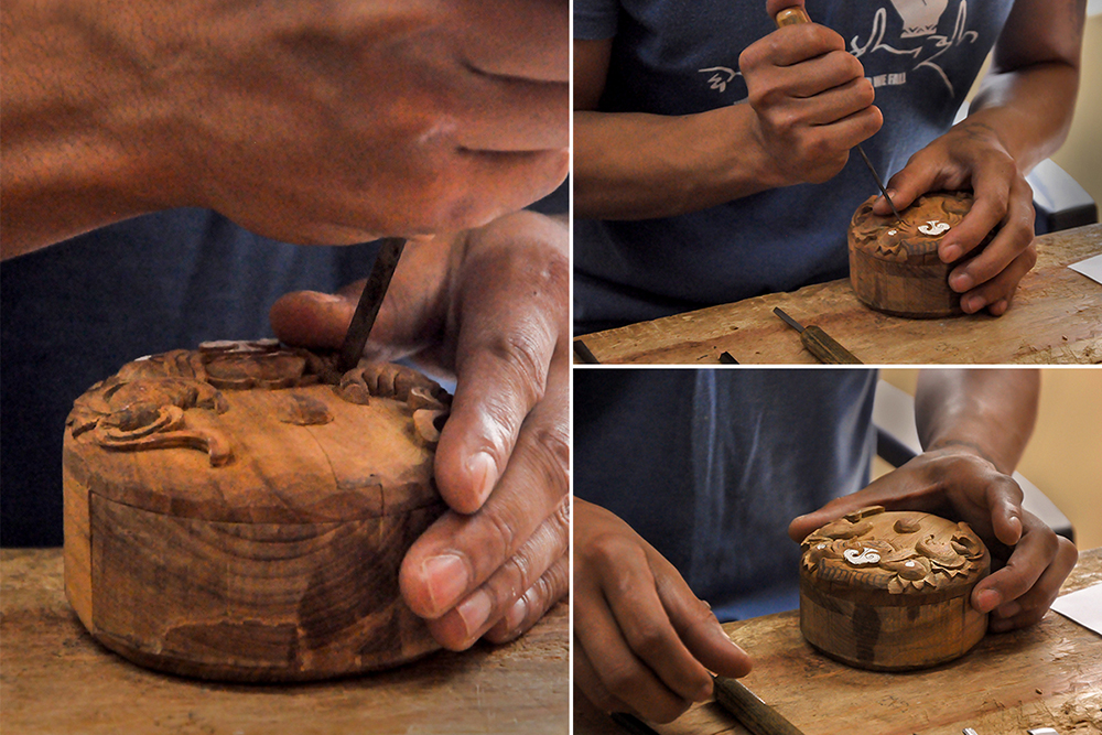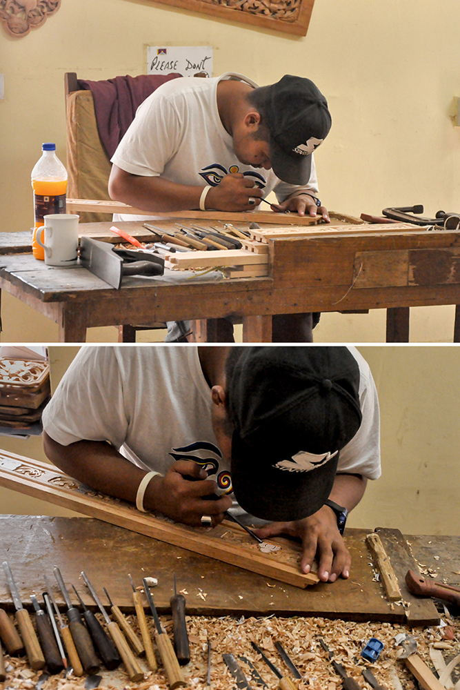 Starting the apprenticeship with drawing practice is the basic rule of Buddhist art, hence this also applies to Buddhist wooden art. The students illustrate designs on a paper until proficient and then slowly moves to simple wood drawings and carvings. Beginners start with pinewood carpentry, gradually moving to teakwood. Once a design is drawn onto the wood, the artisan drills a hole to make space for a fret saw. This fret saw with a strong bamboo frame helps to cut out extra portions of wood that are even less than one square centimeter in size. The ready work is then polished in an old-fashioned method or painted in rich colours, and some are even embellished with gold leaf. The product type ranges from elaborate cabinets and thrones for shrine-rooms, monasteries and temples to even incense stick holders and folding tables.