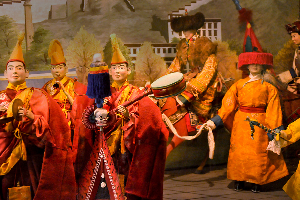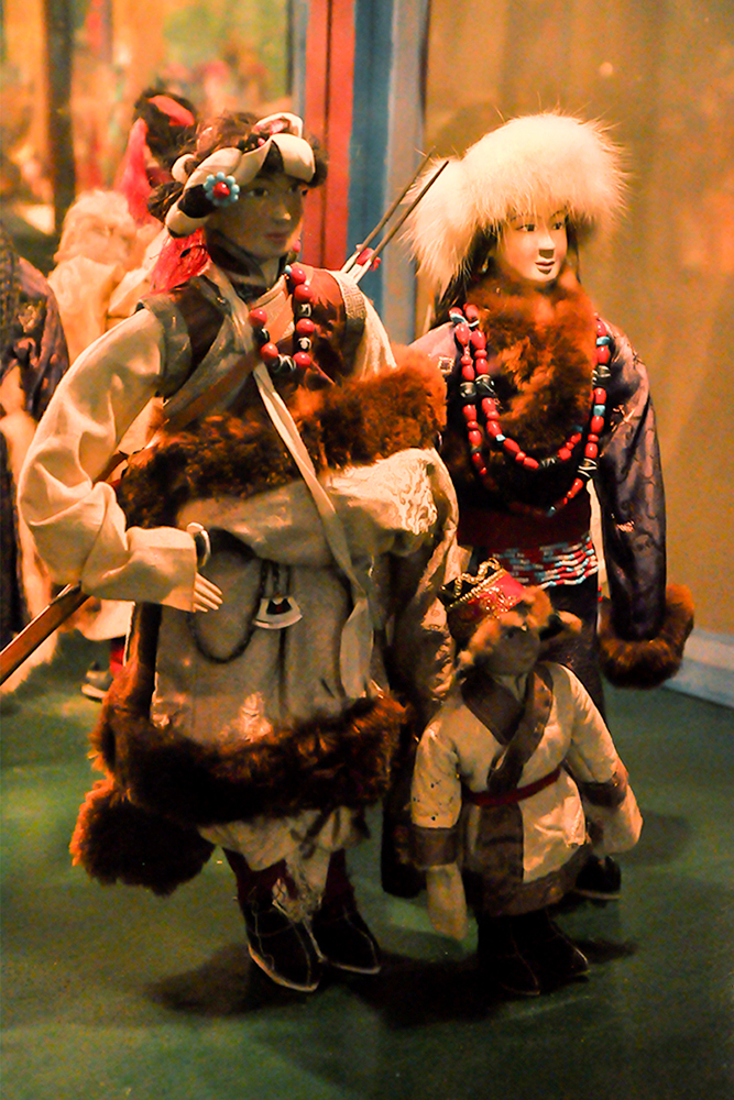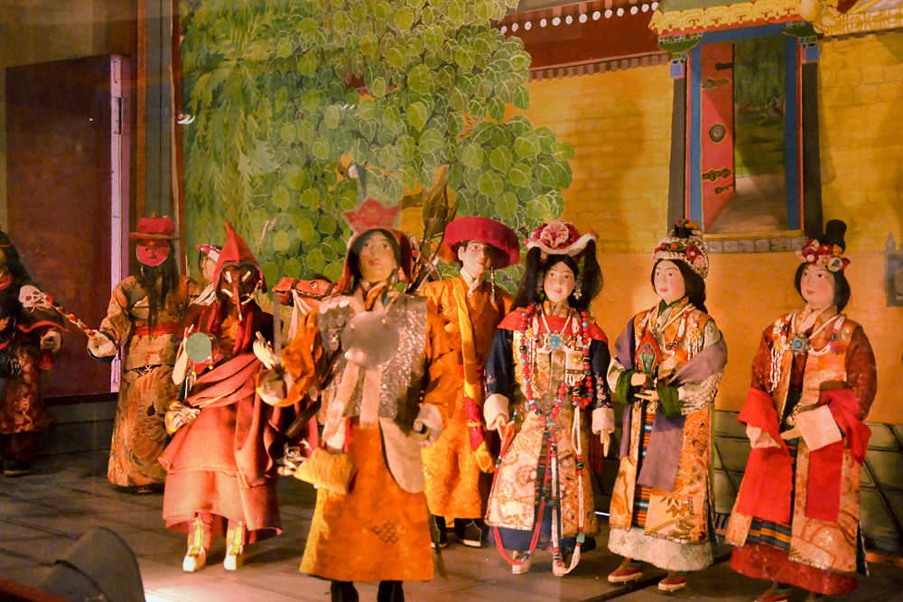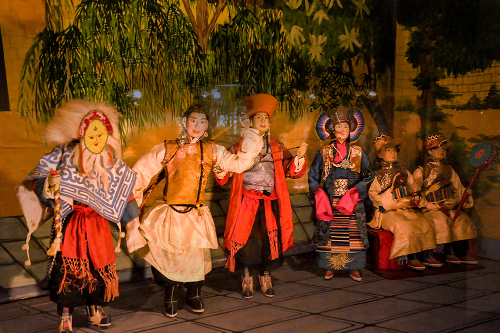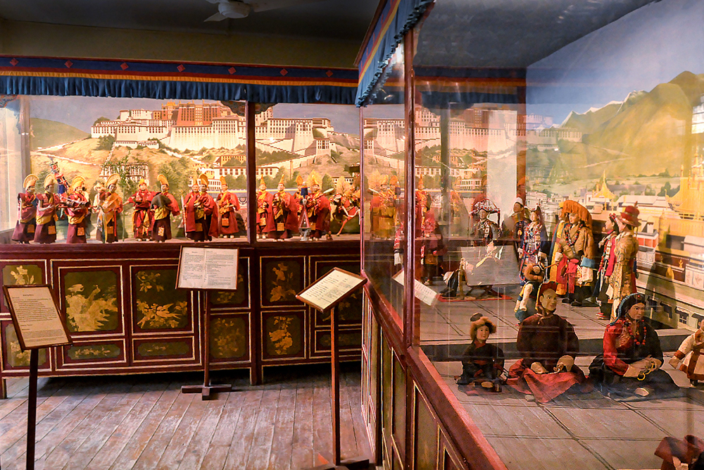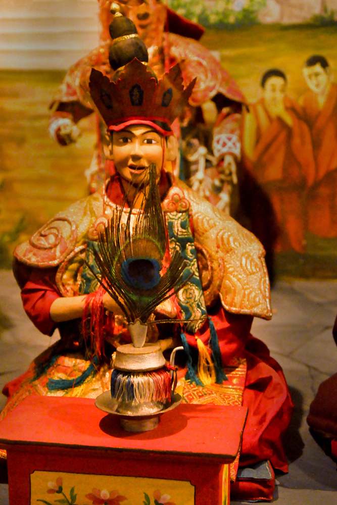 The museum houses over 160 costumed dolls which were created by a group of artist monks from Drepung Loseling Monastery. Describing doll’s making, the body is first constructed with wire and paper mache, later hands made of cast metal are affixed. The heads are sculpted of fine clay, the face painted and hair attached. Then they are dressed in tailored clothes of cotton, wool, and silk. Eventually, jewelry and accessories are put onto the dolls, giving them a final touch.