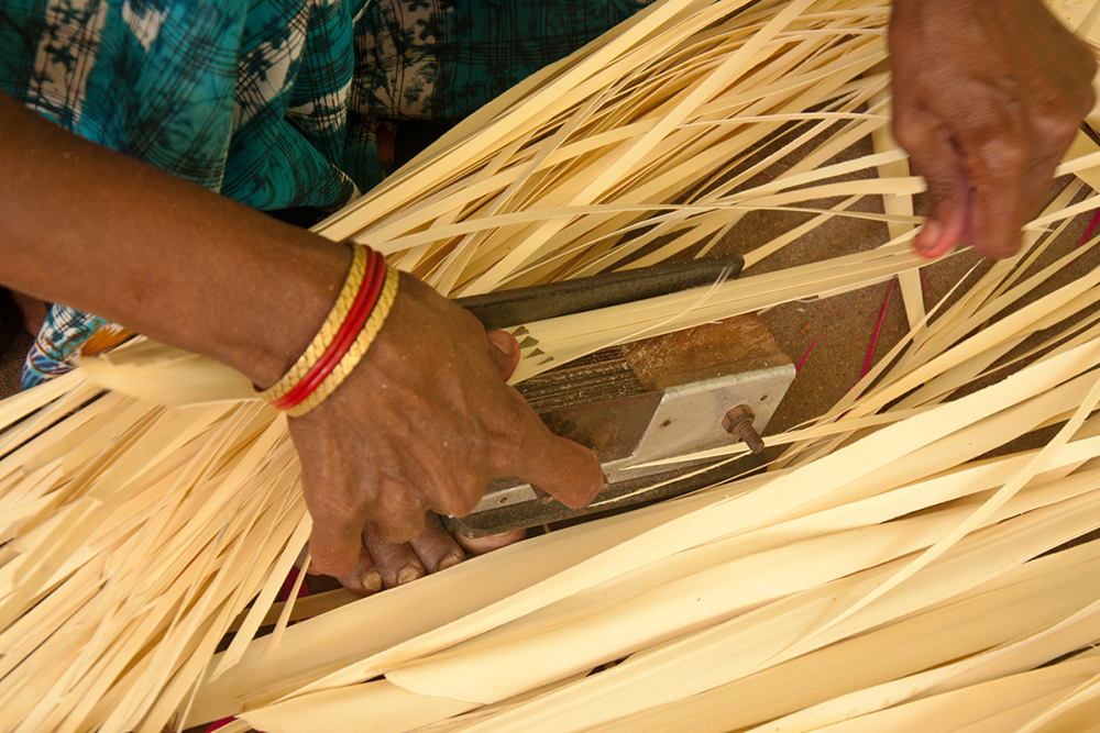 The palm leaves are collected from the palm trees. The semi dry palm leaves are completely dried. The midrib of the dried leaves is removed splitting the palm leaves into two halves separating the stick. Later the palm leaves are either cut to more thin strips or kept to carry on with the further dyeing process.