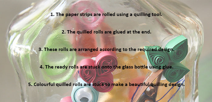 Take a glass bottle, draw the required design on the bottle surface. Roll the strips according to the required shape and apply some adhesive. Later the prepared coils are fixed upon the drawn design to get the desired work.