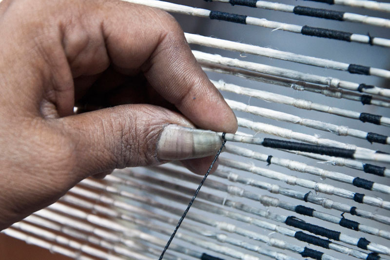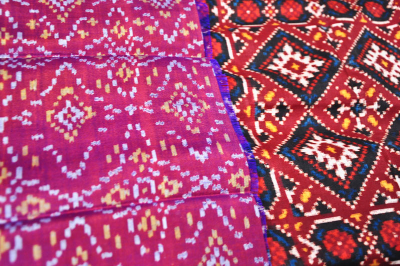 Patola weaving is one of the difficult forms of weaving in the world. It follows the double ikat (tie and dye) style for the warp and weft yarns dyed according to the pre-design pattern before dyeing. Patan of Gujarat in India is one of the places where few of the weavers still practice this craft. At one time silk were woven in the most of the cities of Gujarat, Jalna in Maharashtra and Burhanpur in Madhya Pradesh. Usually the flora, fauna, elephant style, flower motifs, jewels, abstract geometrical patterns, dancing maidens are some of the patterns were done as a border of sarees, where the craftsmen visualize the pattern of dyeing for the warp and weft yarns. These yarns are woven zigzag at even place so that the warp and the weft yarns meet precisely towards the right place to achieve the desired patterns style and colorful diversity. Patola is characterized by its intricate -bold pattern, juxtaposed with figurative motifs tied and dyed till the complete pattern to be obtained are created.