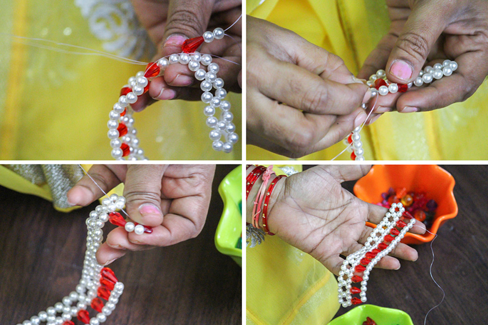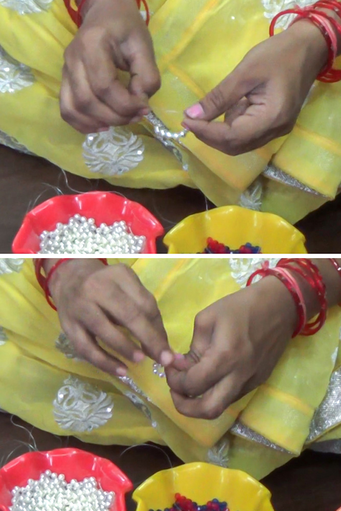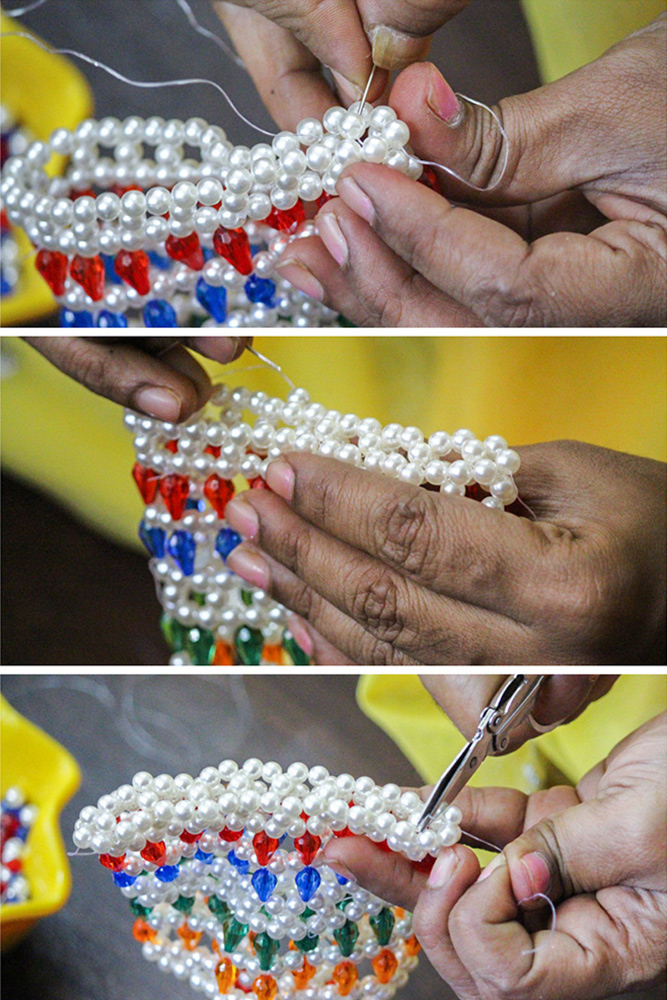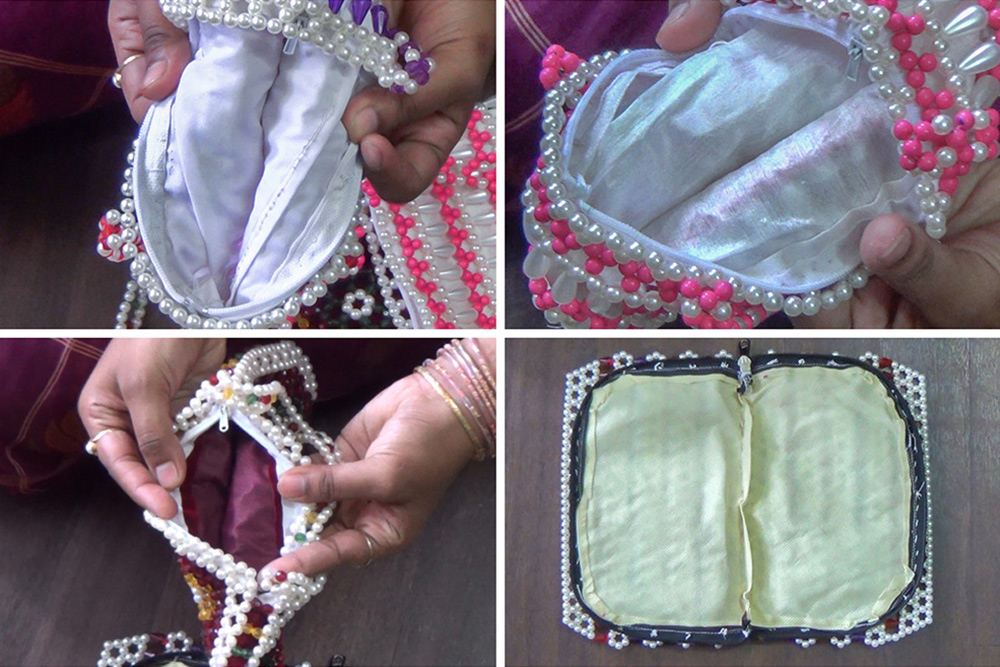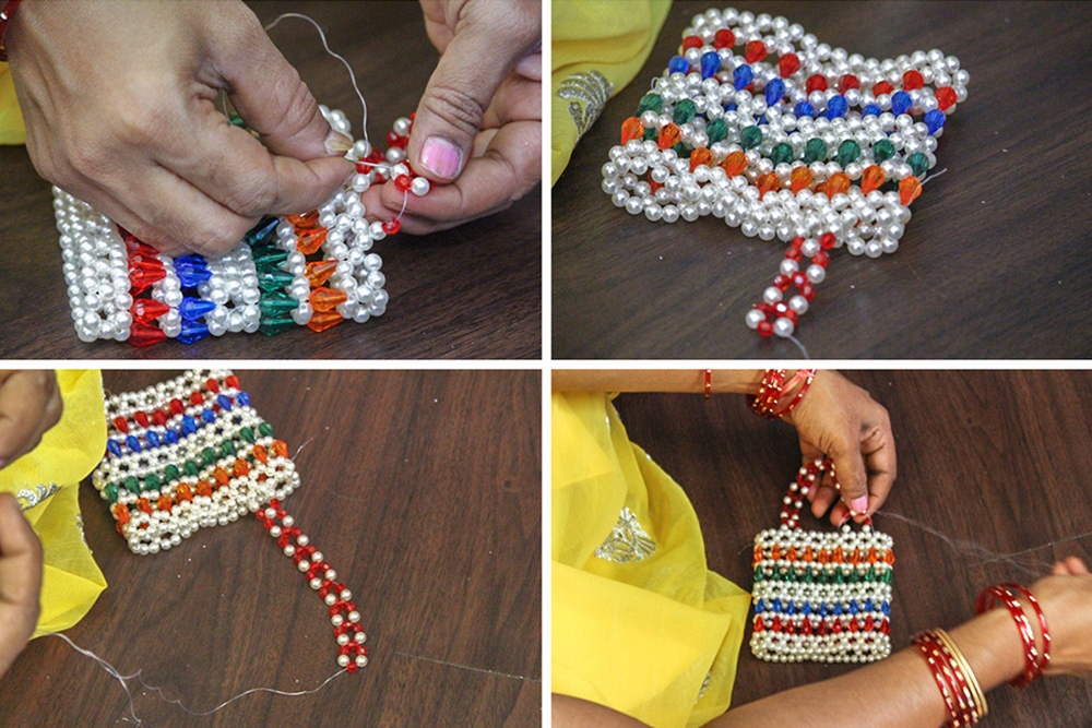 The artificial pearl bags are fancy and can be carried everywhere with alleviate. The making of these pearl and beads bag take all the skills of understanding the beading artwork. It is the art of attaching the pearls and the beads to one another with the help of strings. The craftsperson carefully strings beads where the design patterns are needed. The pearls are stringed initially to a required length. They are twisted and knotted to create needed patterns like flowers and so. The patterns are created according to the finished product that has to be made. The threads that are plastic threads are used for stringing artificial pearls and beads, as it stays strong and hold them without tearing. Layer by layer these pearls and beads are woven, a string of pearls are further advanced to a form of bag, additionally required beads of various sizes are added alternating with the pearls and additional threads are also tied to continue with the weaving process. The pearls and beads are woven in layers and finally a handle for the bag is weaved in the same process or sometimes the handles are made completed separately and attached. Bags are made ready with different design patterns in the same way. Pearls of soft pastel colors are used to make the products look luxurious and enhancing. These bags are used to carry objects, depending on the sizes the insides can be packed.