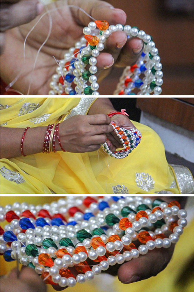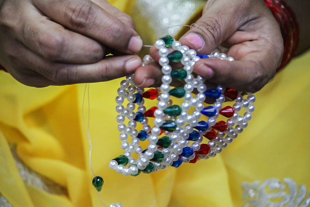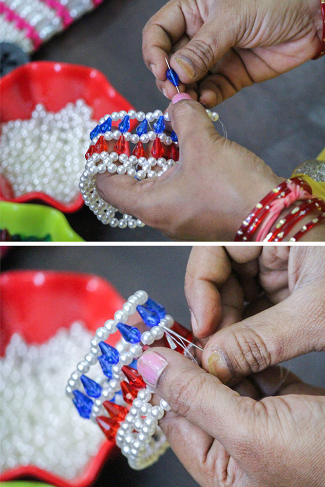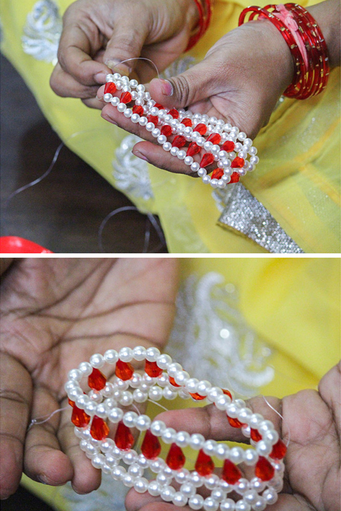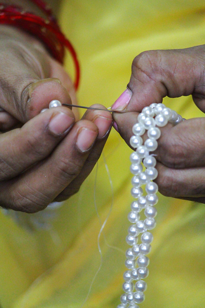 The artificial pearl bags are fancy and can be carried everywhere with alleviate. The making of these pearl and beads bag take all the skills of understanding the beading artwork. It is the art of attaching the pearls and the beads to one another with the help of strings. The craftsperson carefully strings beads where the design patterns are needed. The pearls are stringed initially to a required length. They are twisted and knotted to create needed patterns like flowers and so. The patterns are created according to the finished product that has to be made. The threads that are plastic threads are used for stringing artificial pearls and beads, as it stays strong and hold them without tearing. Layer by layer these pearls and beads are woven, a string of pearls are further advanced to a form of bag, additionally required beads of various sizes are added alternating with the pearls and additional threads are also tied to continue with the weaving process. The pearls and beads are woven in layers and finally a handle for the bag is weaved in the same process or sometimes the handles are made completed separately and attached. Bags are made ready with different design patterns in the same way. Pearls of soft pastel colors are used to make the products look luxurious and enhancing. These bags are used to carry objects, depending on the sizes the insides can be packed.