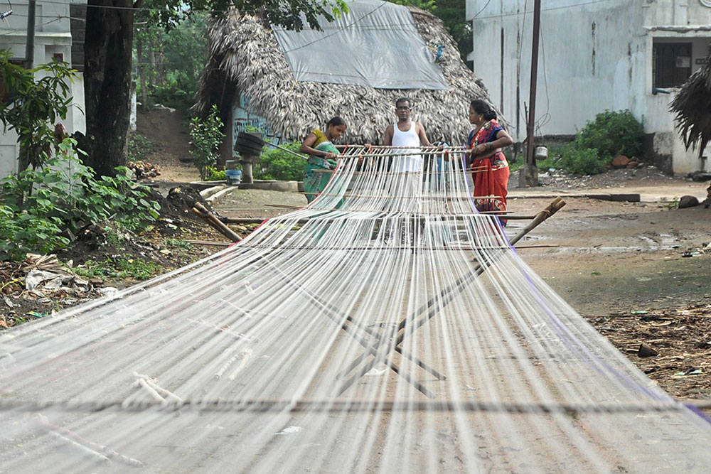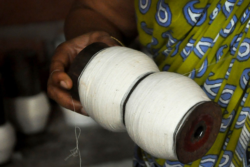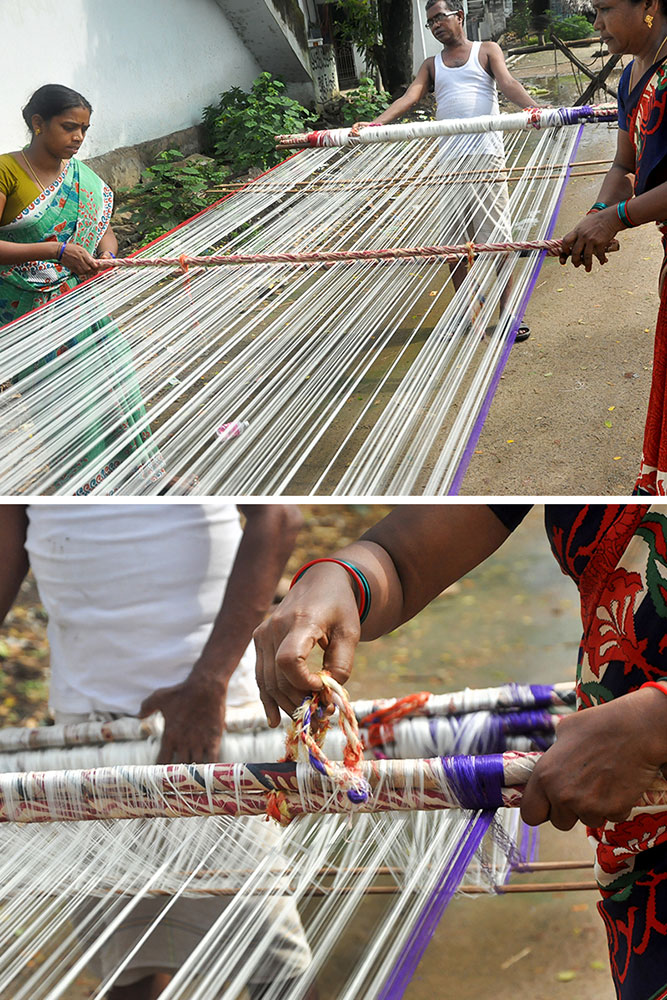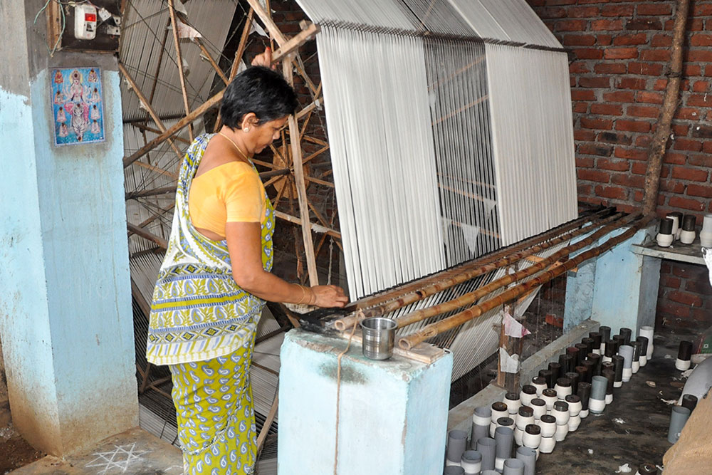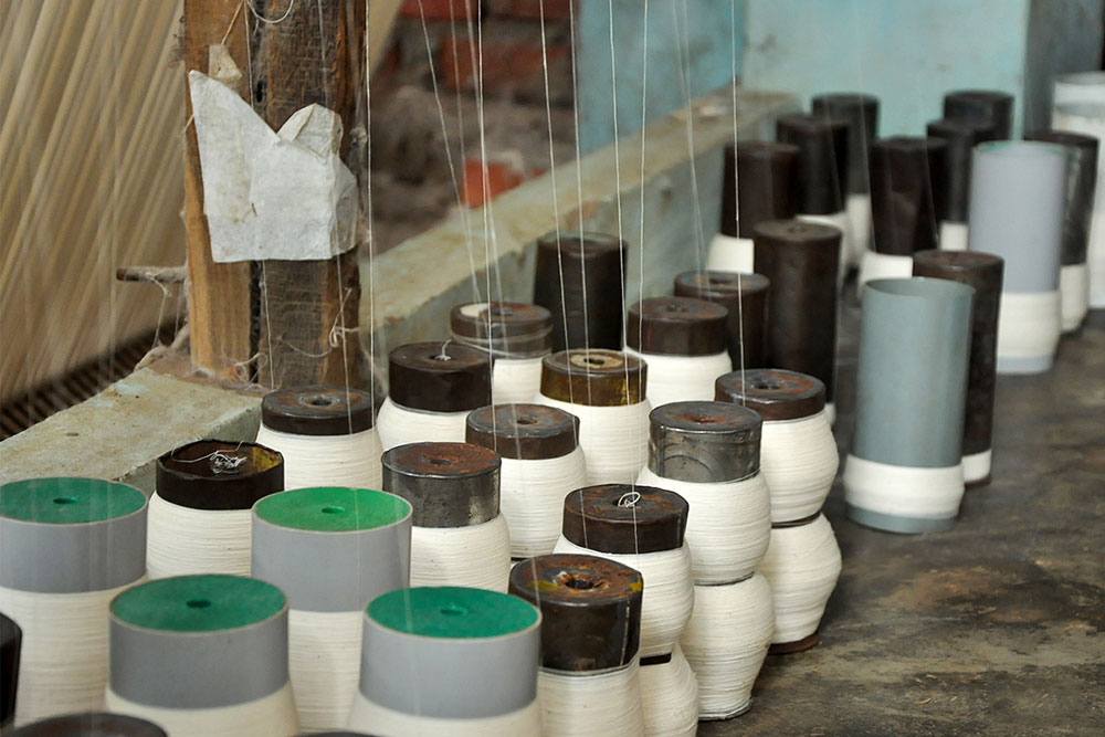 Warping is a step that determines the length and quality of the loom, converting the hank yarn into an even form, suitable for uncomplicated weaving. Warping is done on a huge drum, where the yarn from the bobbin is tied to the manually tethered yarn on the huge drum. The drum is then rotated manually to wound the yarn of the desired length. Once the length is achieved, the entire warped yarn is moved for sizing. Application of starch to the yarn to bring in the lubrication and prevent the cracking of warp is called sizing. Sizing is done to give temporary strength to withstand the rigor of weaving while keeping the characteristics and properties of cotton yarn intact. The scratch based adhesives are drawn from different sources like the natural adhesives come from rice, maize, wheat flour, or potato while the artificial ones are mostly acid-based, oxidized, or ethylated. After the application of the sizing paste, special brushes are used to spread and dry the starch on the yarn. After sizing, all the yarns are aligned and separated from each other in order for smooth weaving operation.