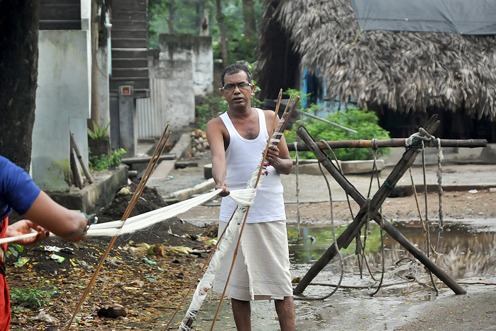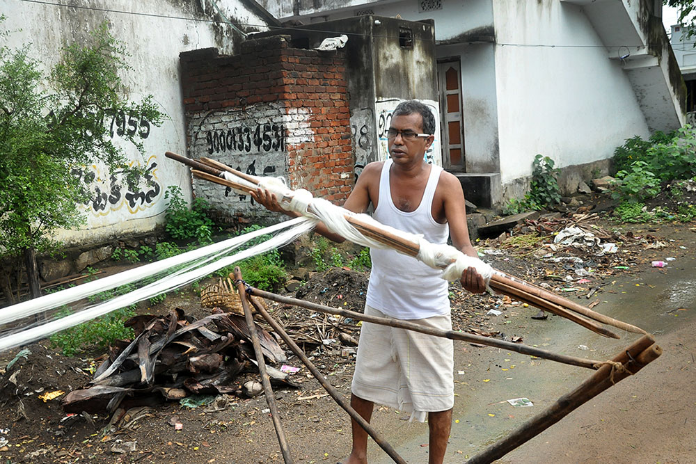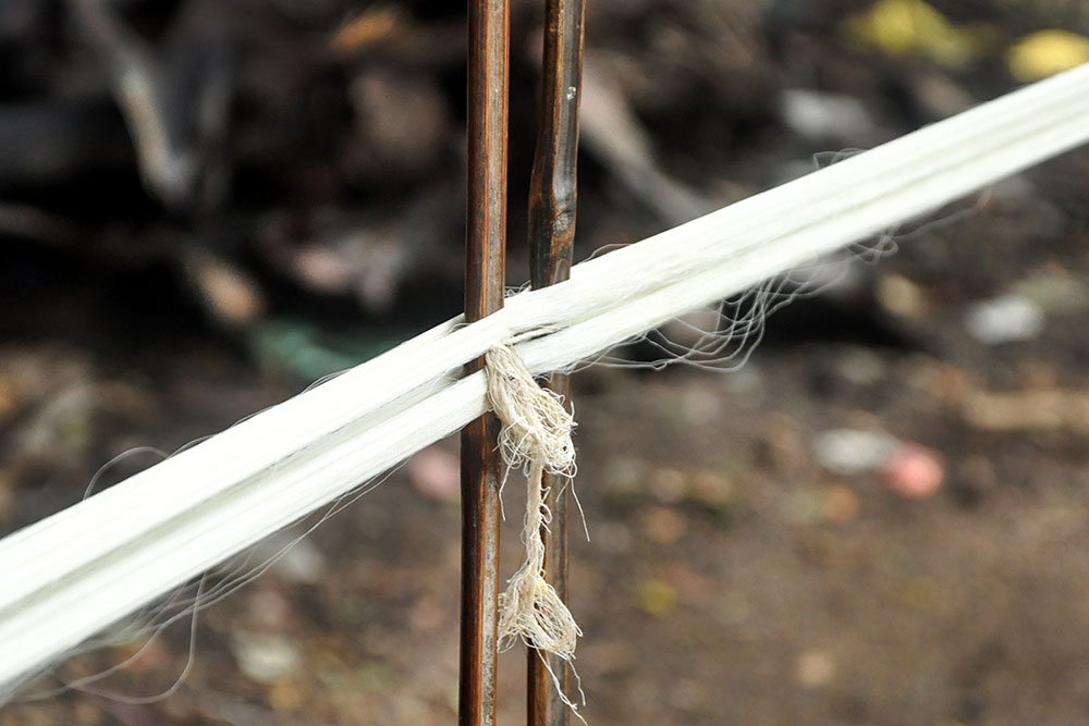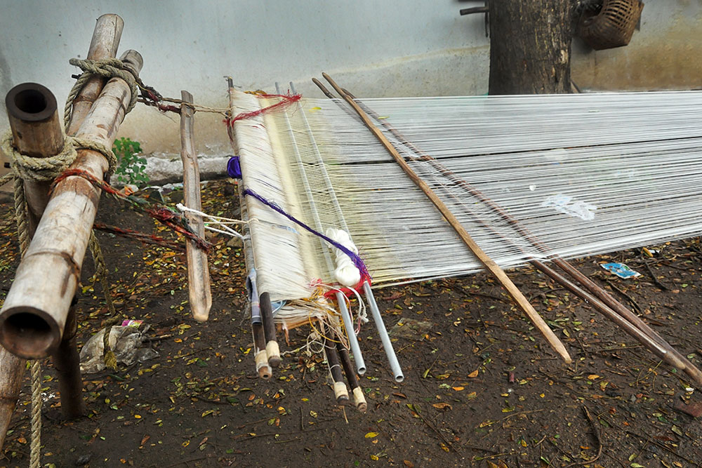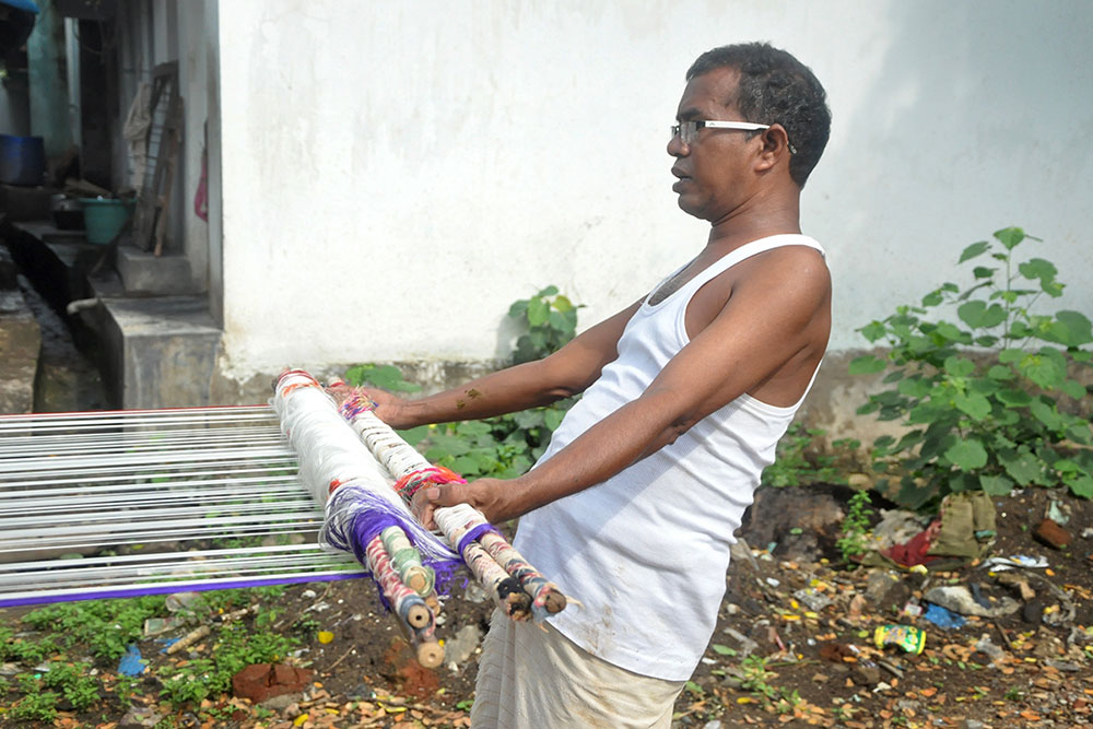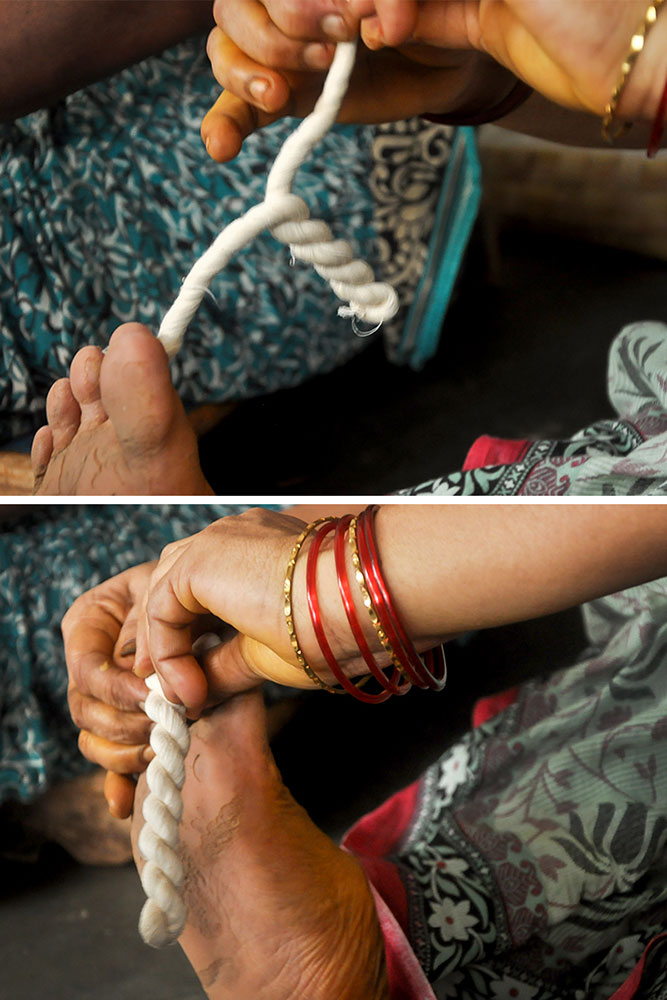 Warping is a step that determines the length and quality of the loom, converting the hank yarn into an even form, suitable for uncomplicated weaving. Warping is done on a huge drum, where the yarn from the bobbin is tied to the manually tethered yarn on the huge drum. The drum is then rotated manually to wound the yarn of the desired length. Once the length is achieved, the entire warped yarn is moved for sizing. Application of starch to the yarn to bring in the lubrication and prevent the cracking of warp is called sizing. Sizing is done to give temporary strength to withstand the rigor of weaving while keeping the characteristics and properties of cotton yarn intact. The scratch based adhesives are drawn from different sources like the natural adhesives come from rice, maize, wheat flour, or potato while the artificial ones are mostly acid-based, oxidized, or ethylated. After the application of the sizing paste, special brushes are used to spread and dry the starch on the yarn. After sizing, all the yarns are aligned and separated from each other in order for smooth weaving operation.