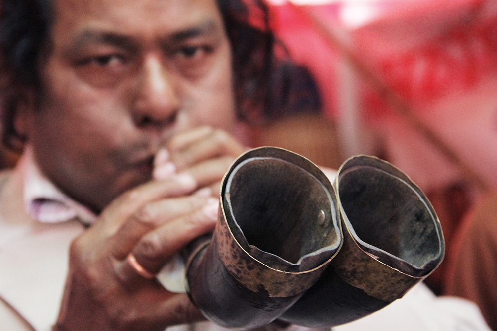 Any brass metal or ring may be fitted onto the broader side of the Thola to avoid damage and also for its beauty. The smaller end of the “Thola” is fitted to a piece of cylindrical reed of bamboo (of about 15cm), also called Nalicha or Garvahala. The Nalicha generally contains four holes. At the other end of the Nalicha, a little Pepa (a little pipe) of about 4cm is pushed into it. This small Pepa is called Thuri. For the convenience of playing this Thuri is kept enclosed in a bamboo Cupahi. This instrument is played by placing the mouth towards the Cupahi.