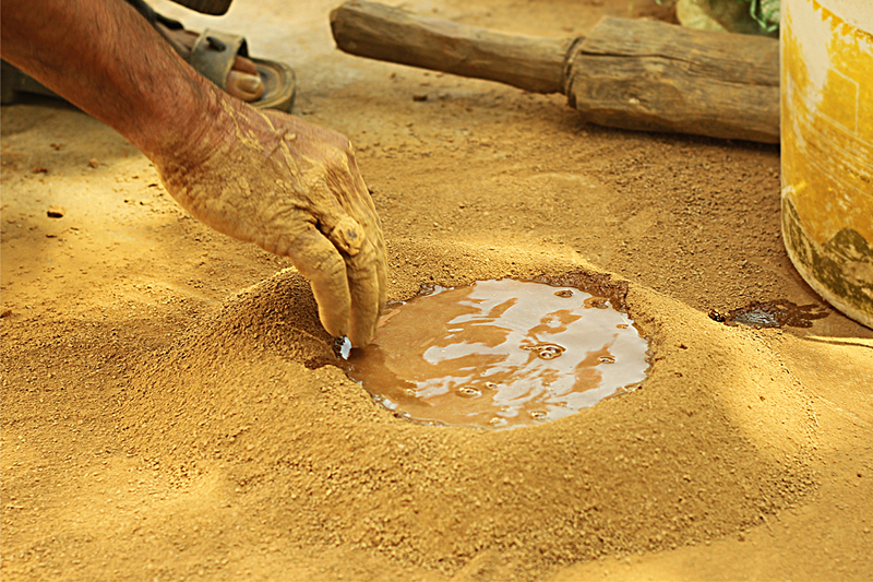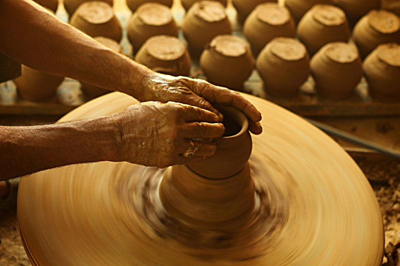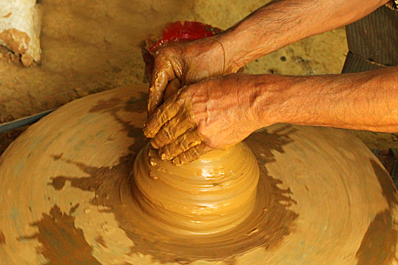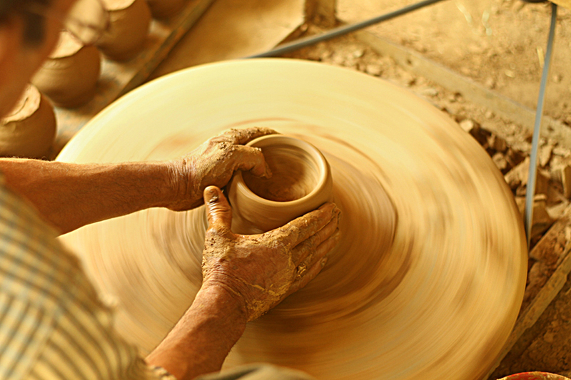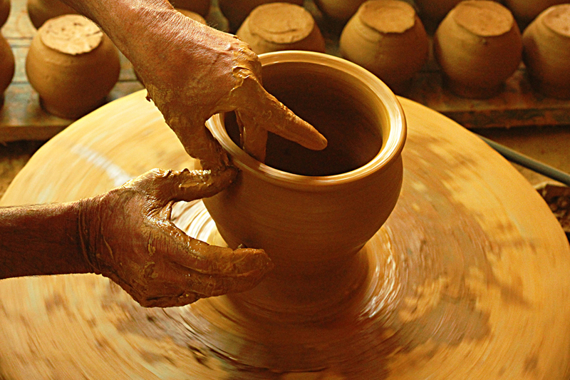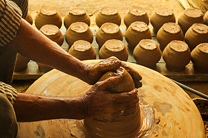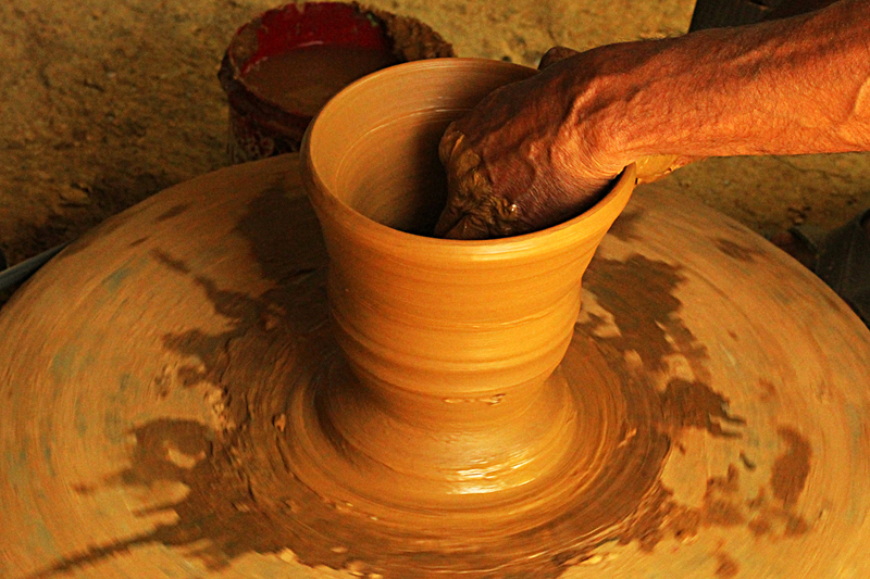 Clay dough is placed at the center of the turning wheel and water is sprinkled to make the clay wet. As the wheel is turned, craftsmen starts to shape the clay. Potter’s wheel is rotated manually or by electric drive. Water is added frequently to retain the moisture. The clay is shaped into desired form. A smooth surfaced stone is used to slide along the shaped article to smoothen and level the article’s surface while turning and finished piece is cut and separated from the wheel with the help of a thread. The shaped articles are dried in direct sunlight. Cooking pots, water storing pots are the basic products made from clay.