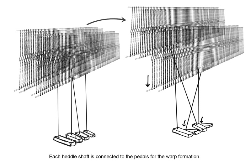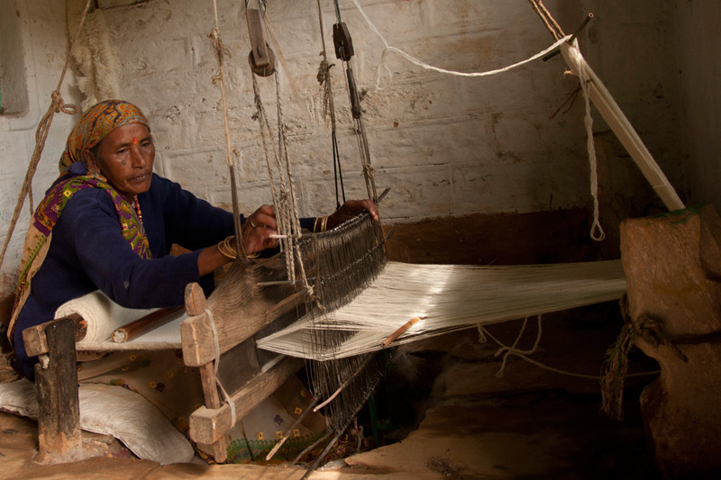 The artisan spins the processed wool in to thread using the traditional method of hand spinning. This hand spin threads is used in fly/throw shuttle while weaving. Threads which are attached to the loom to weave the blanket is spun in charkha machine. The threads are attached to the weaving loom to weave them into Blanket. A wooden log is fixed to the ground to which the warp is tied. This warp is attached to the weaving loom through the four reed .The weaver uses 4 pedaled pit looms to weave the blanket. While weaving a bamboo stick is fixed on woven blanket to maintain the stiffness of the blanket. Woolen thread is arranged on a bamboo stick, which is inserted in the fly/throw shuttle and used while weaving. The wool is weaved into long strips of blanket. Once the weaving is complete the blanket is washed to remove the extra fiber and dried in the sun. Blanket is brushed with a pointed teeth brush on the upper surface, to bring out the hairy texture. This method of washing and brushing is continued until the soft bushiness of the wool is felt.